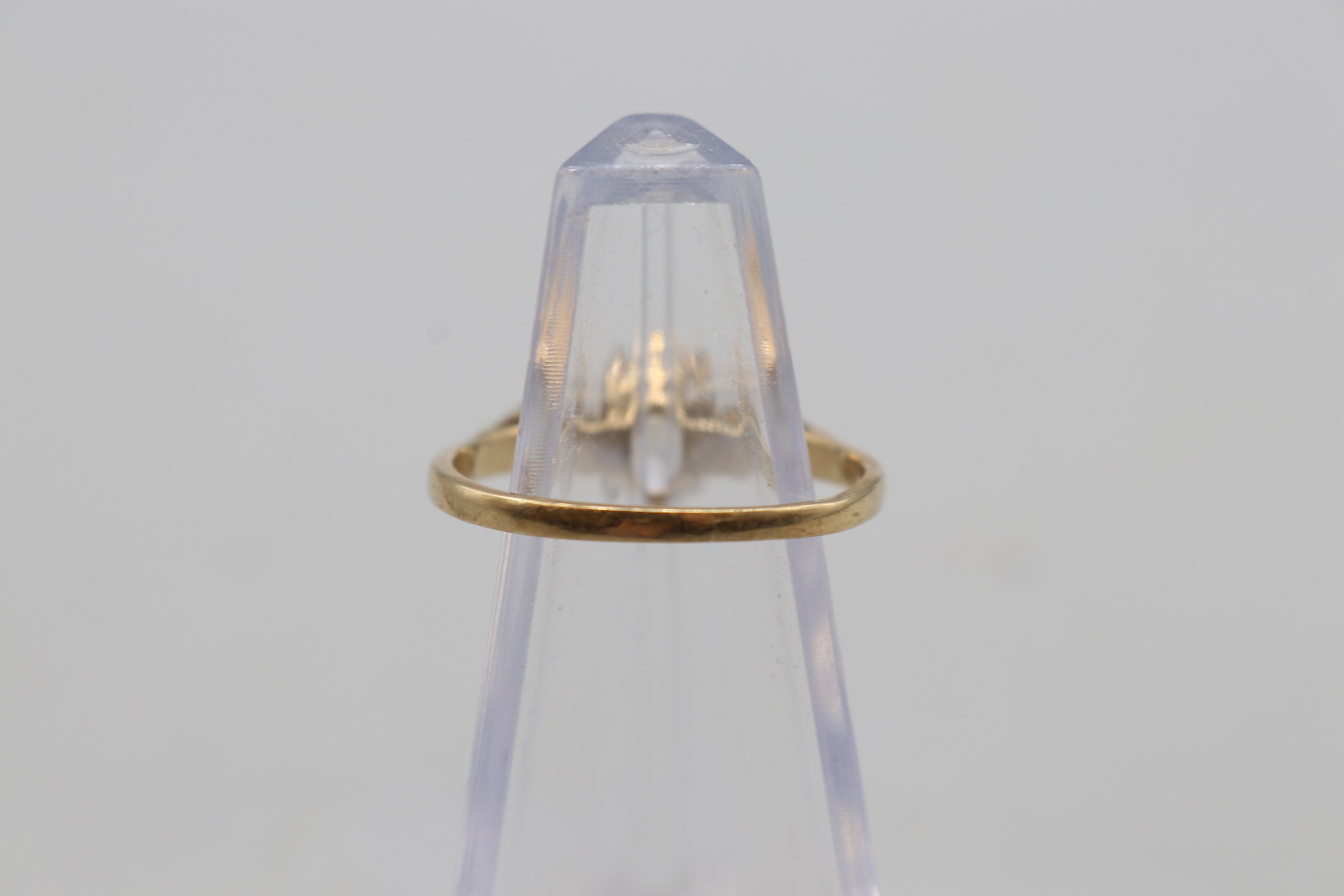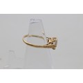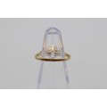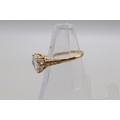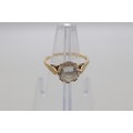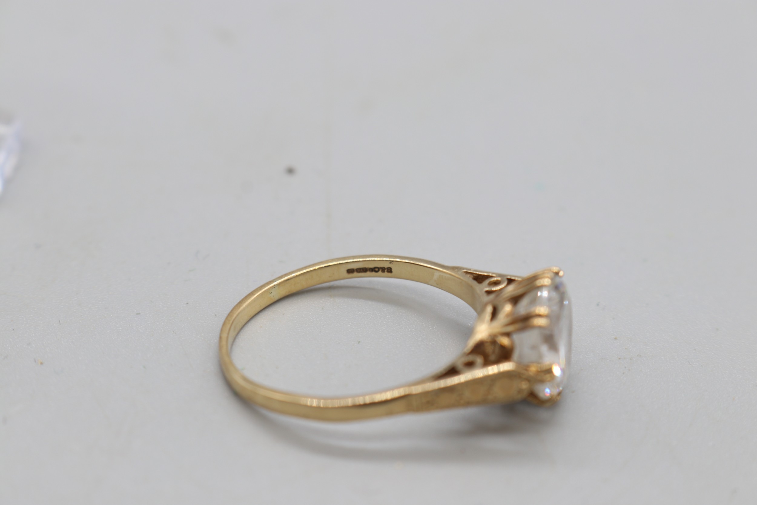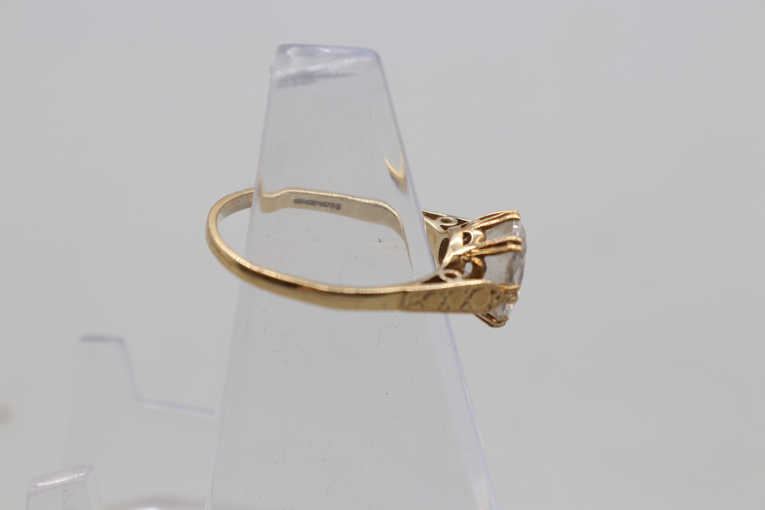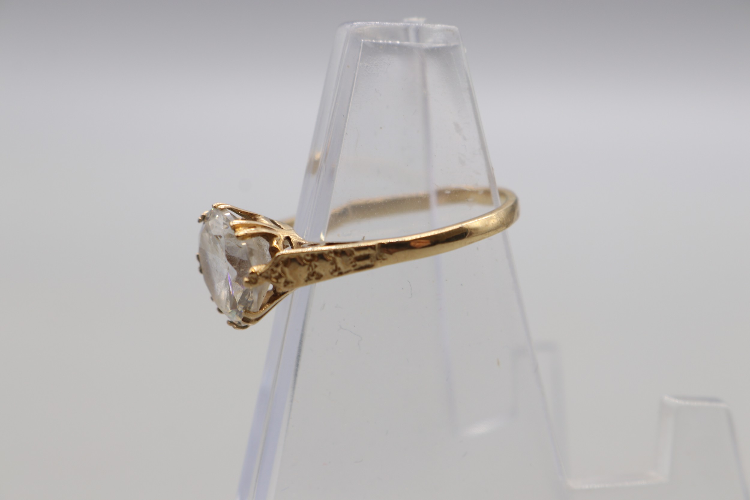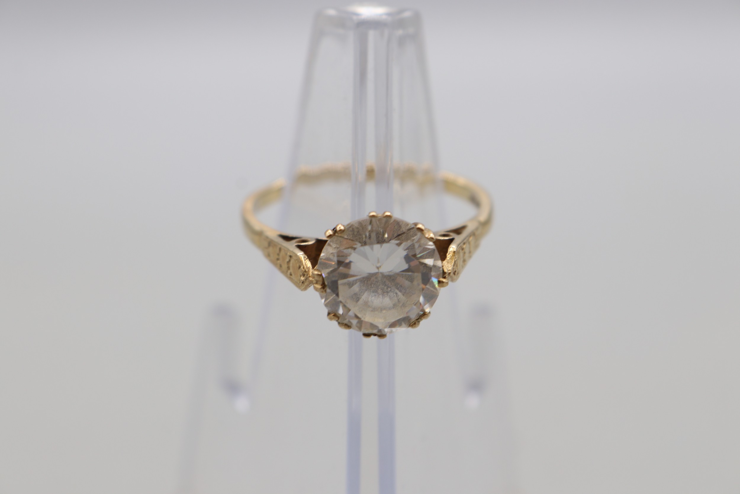 9ct stamped yellow gold white non precious round brilliant cut stone solitaire cocktail ring with engraved detail to the shoulders size V weight 3.72g