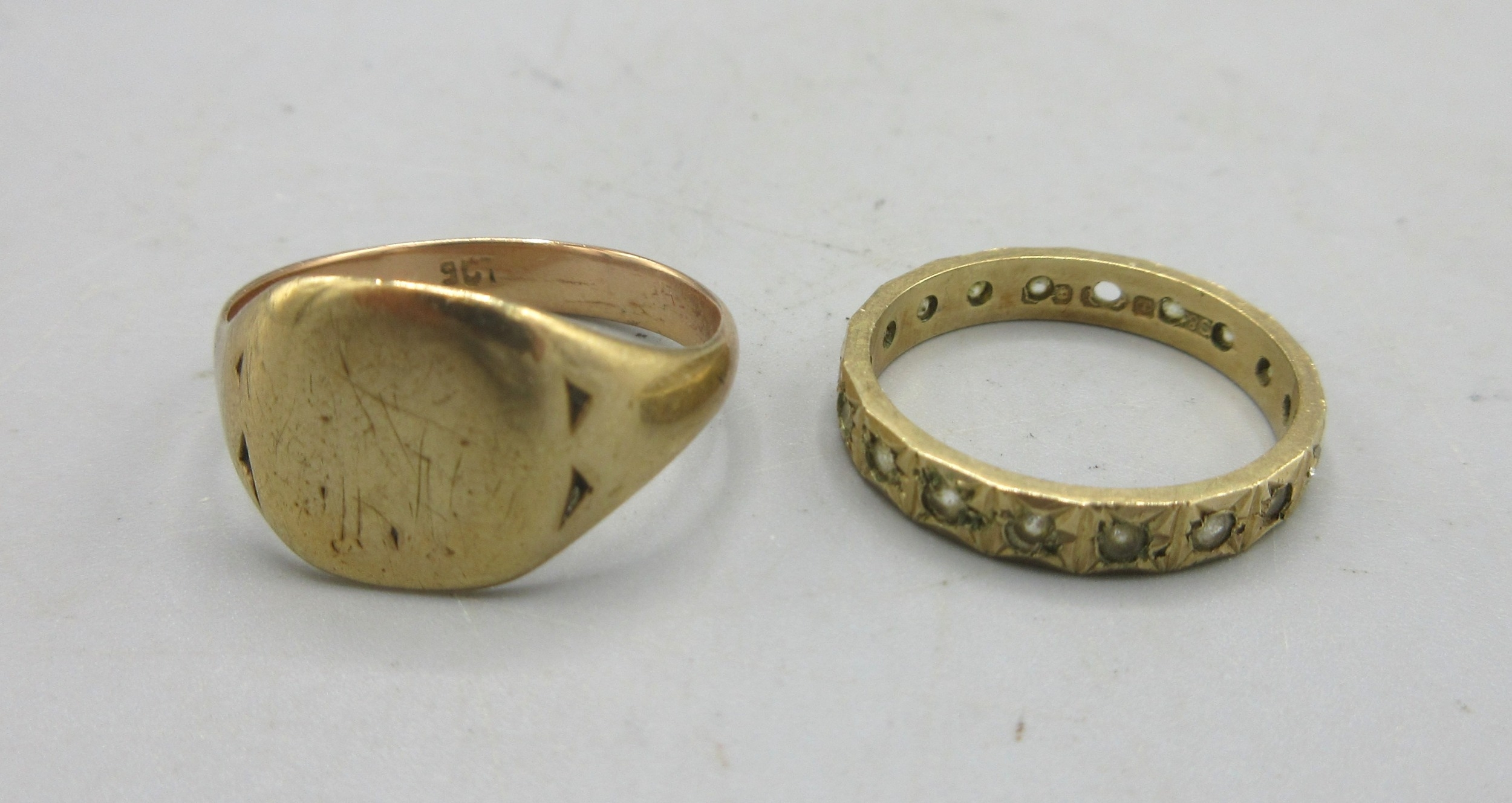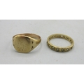 9ct yellow gold signet ring with square face, engraving worn, stamped 9ct, size R1/2, and a 9ct yellow gold eternity ring set with clear stones, stamped 375, size O, 5.83g