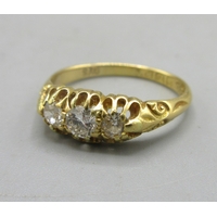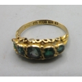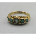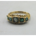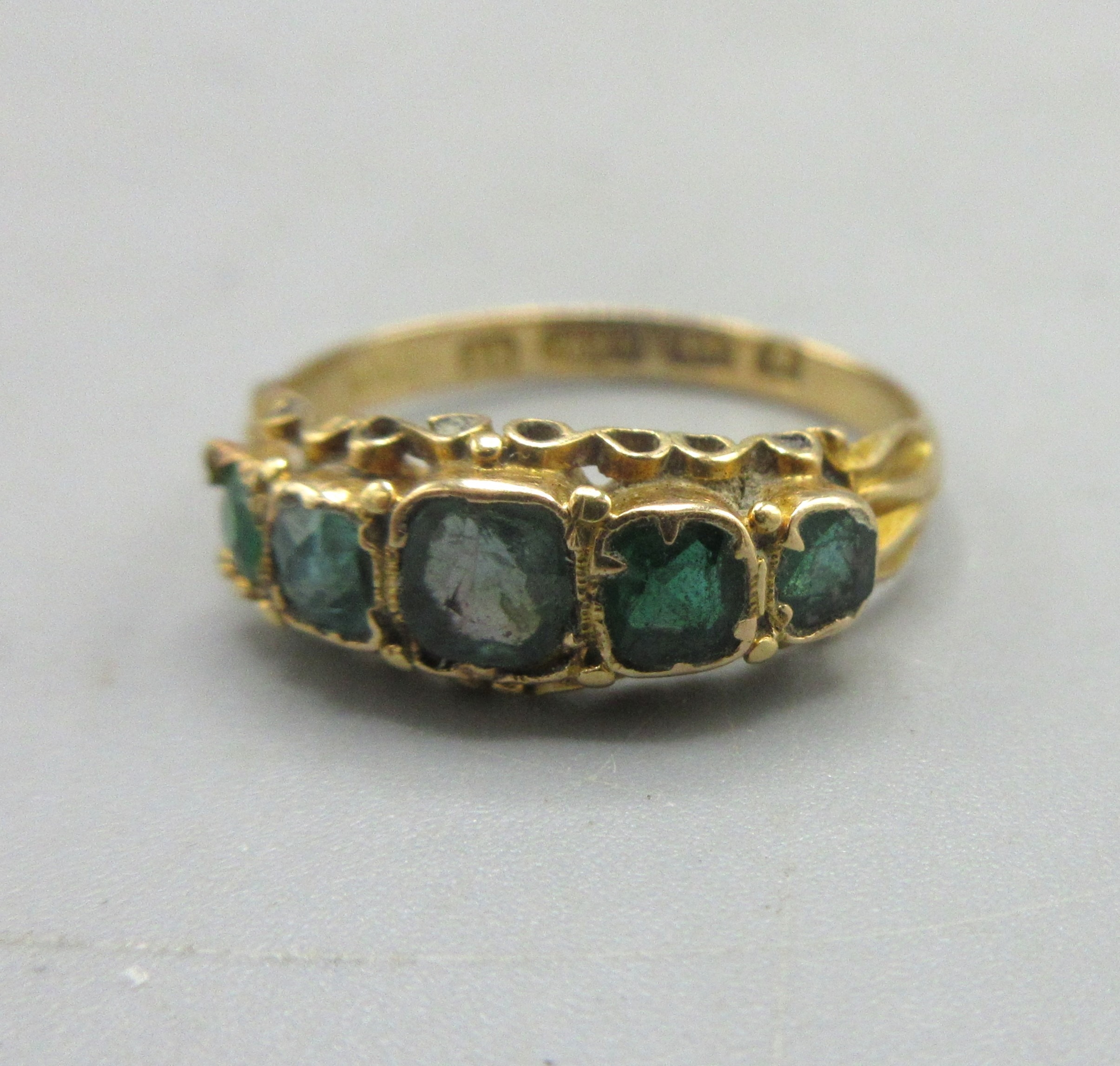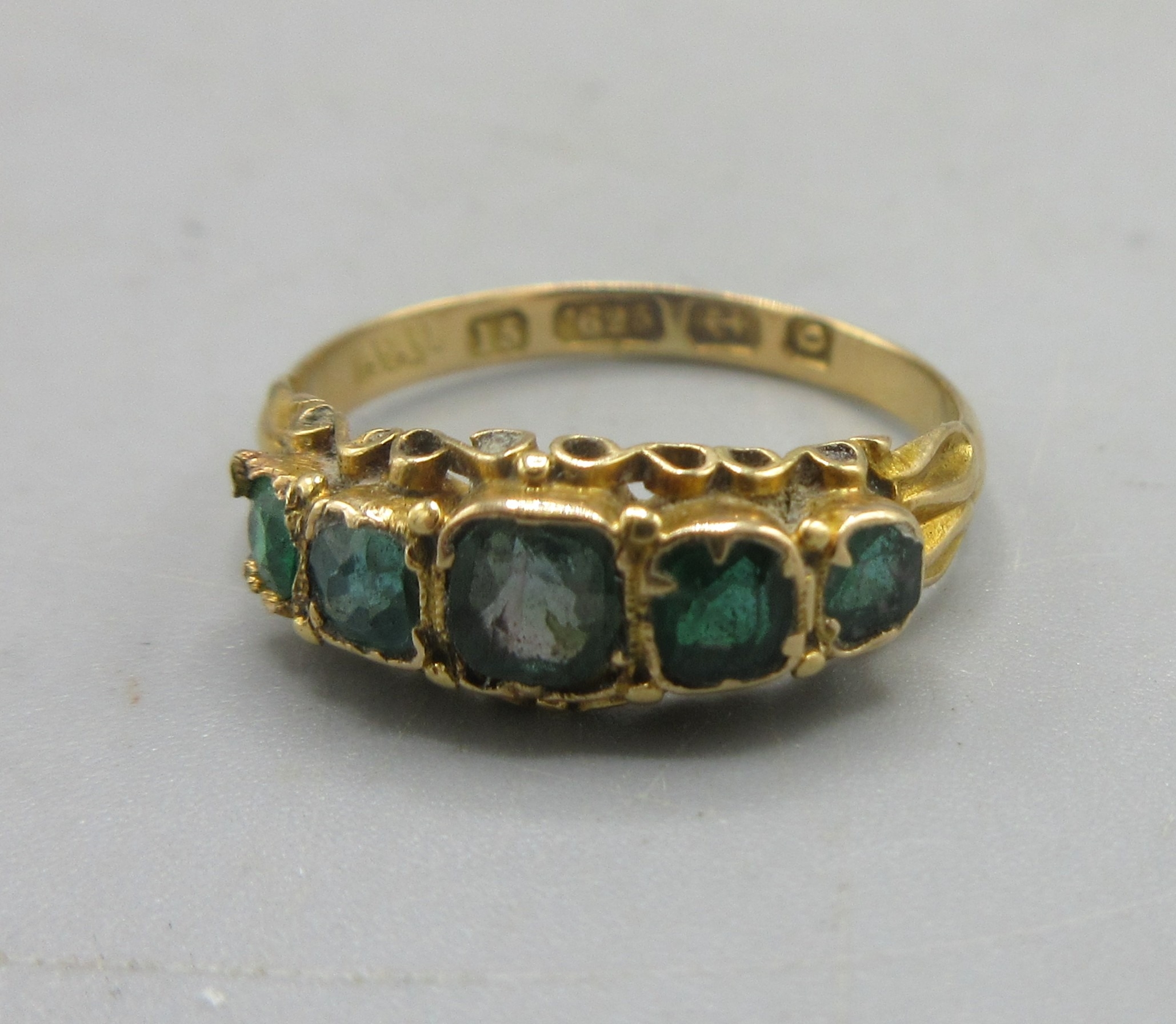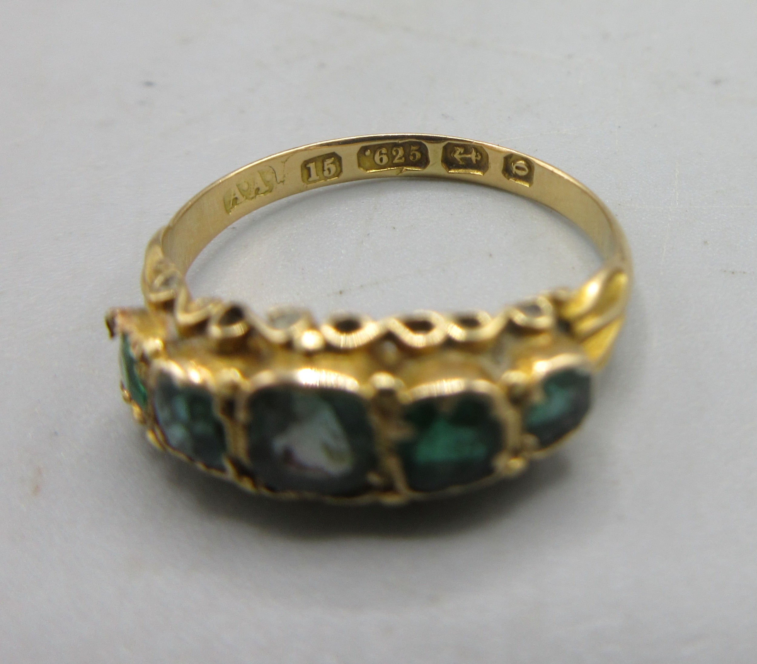 Antique 15ct yellow gold ring set with five emeralds, stamped 15, 1.75g