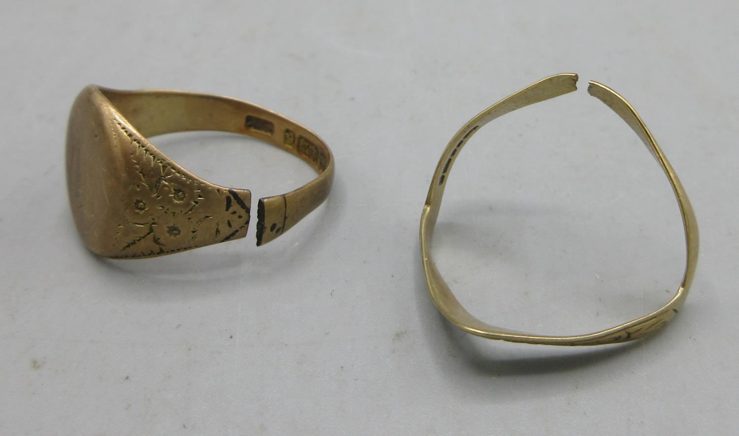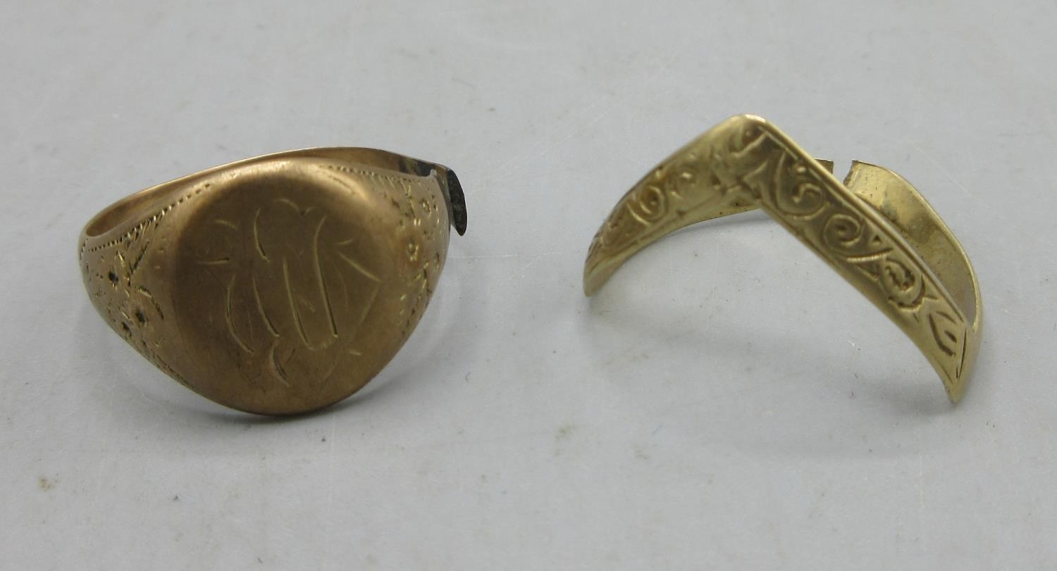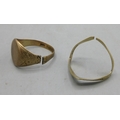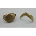 9ct yellow gold signet ring, and 9ct v shaped ring, both stamped 375, both AF, 5.86g