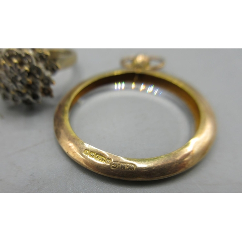 9ct yellow gold cluster ring set with diamonds, stamped 375, size M1/2, a 9ct yellow gold and silver ring, and a Victorian 9ct yellow gold photo pendant set with glass panel, gross 8.97g