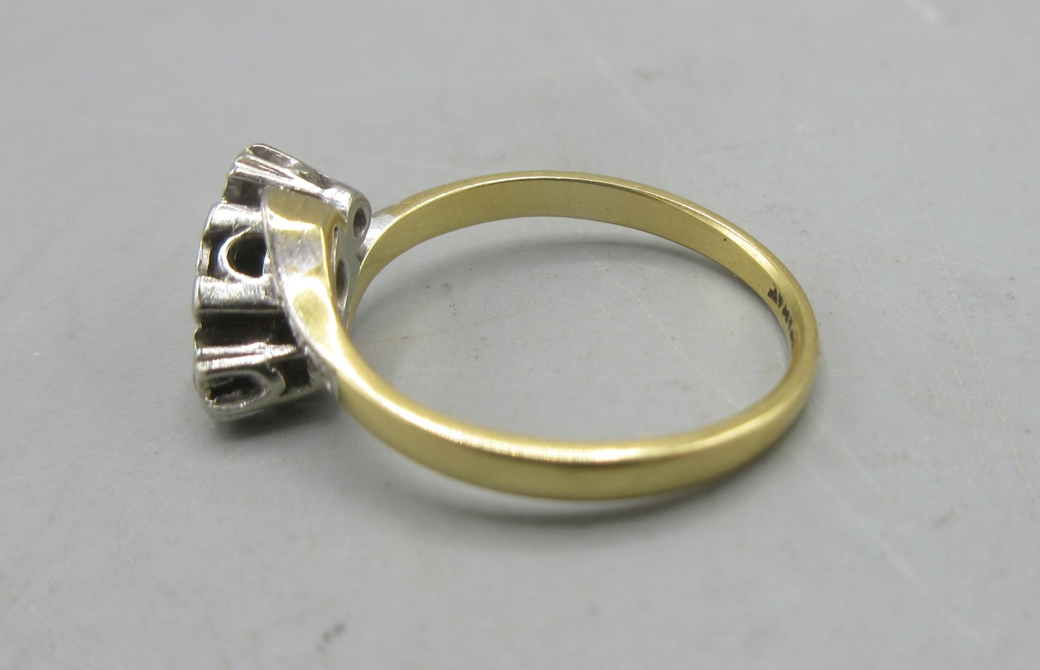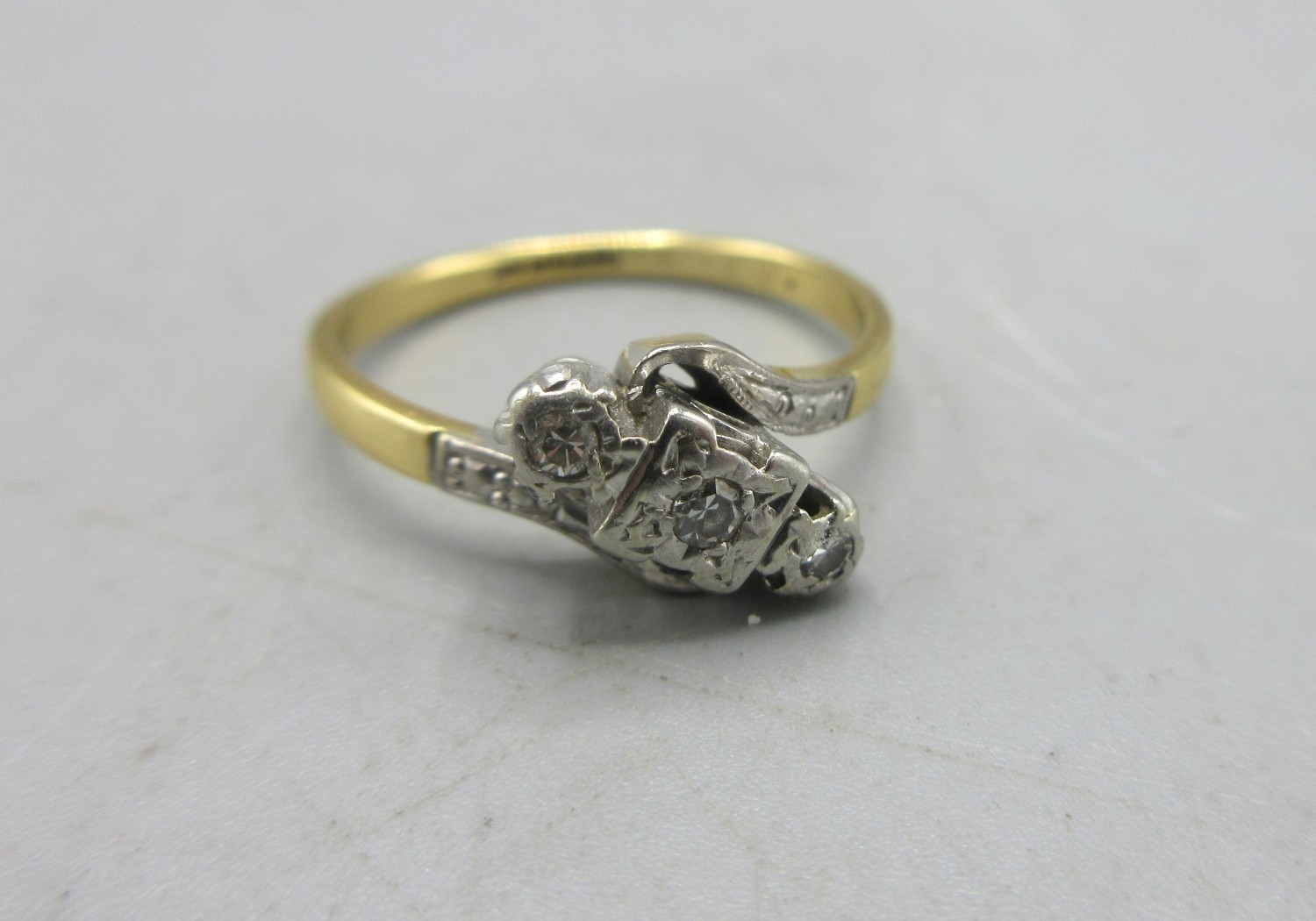 18ct and platinum three stone diamond ring, the three diamonds set in illusion mounts, stamped 18ct Plat, size O, 3.39g
