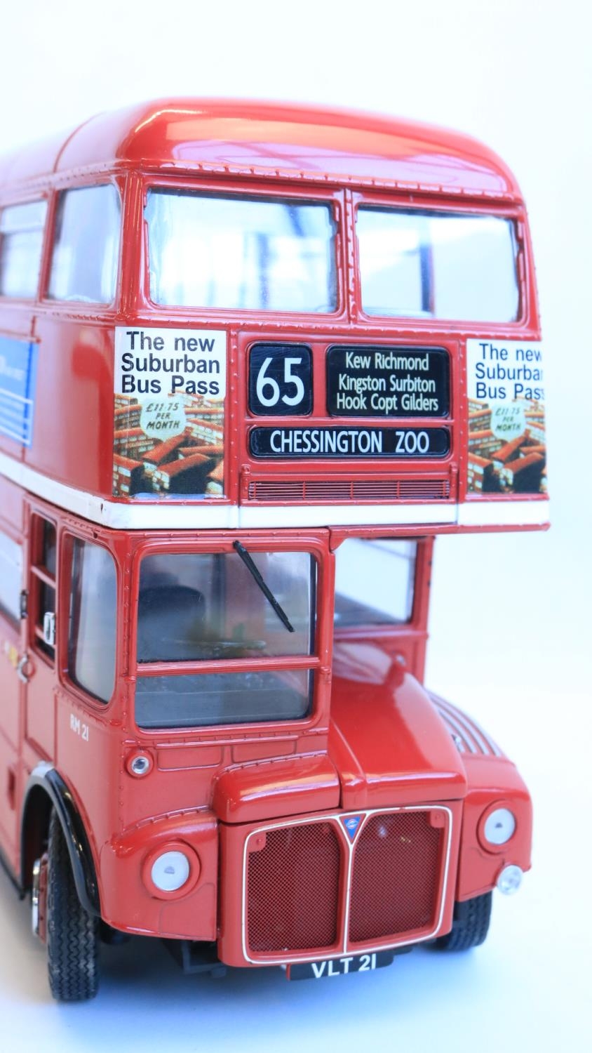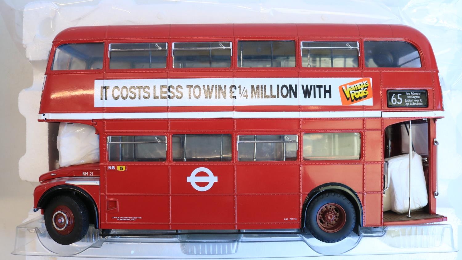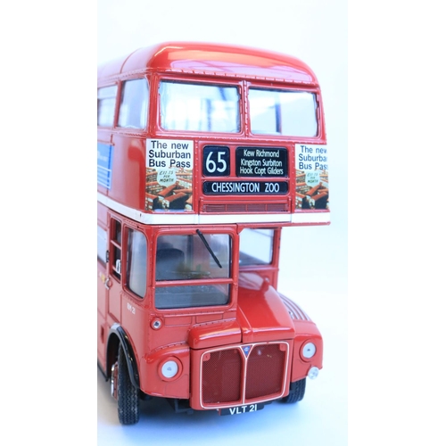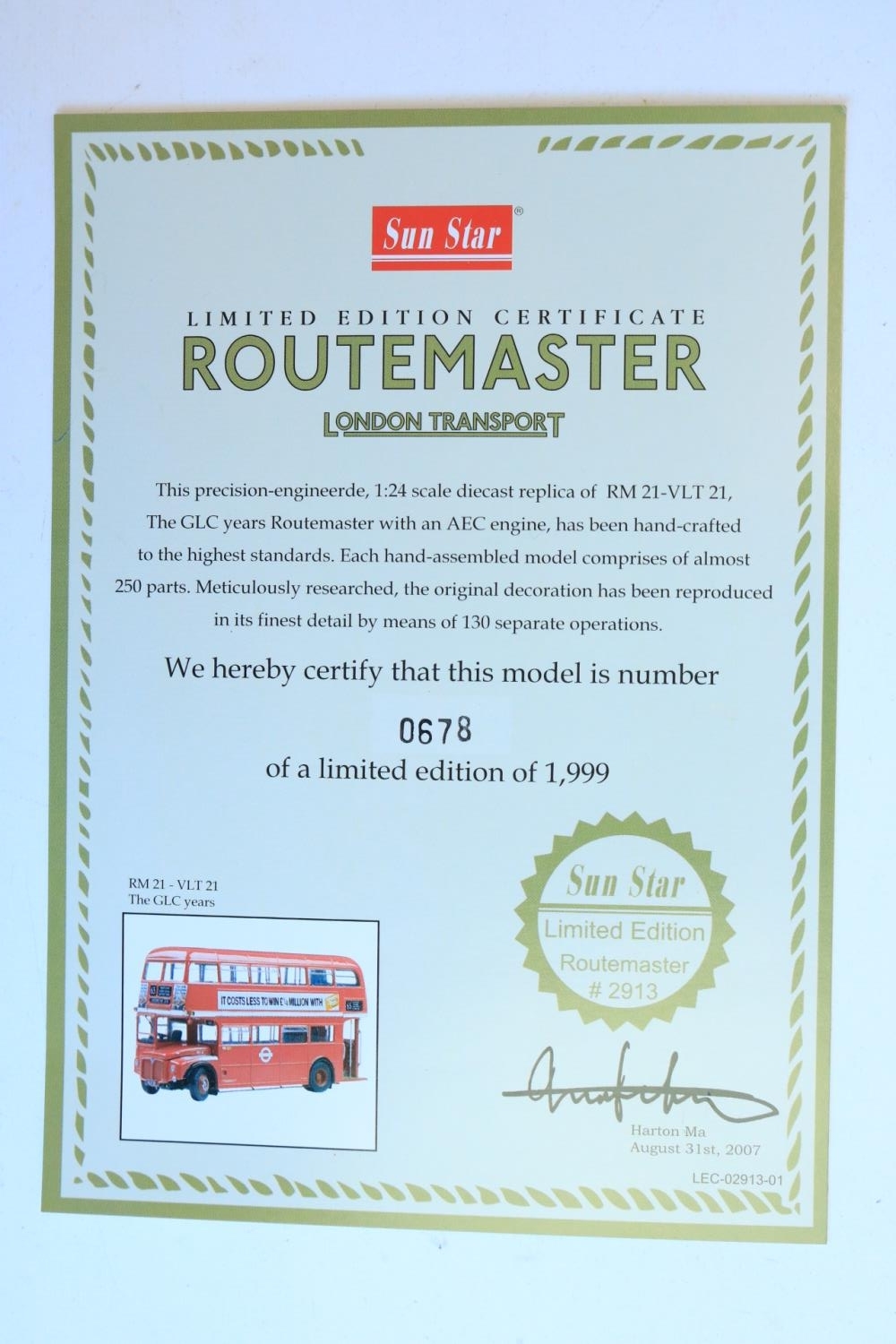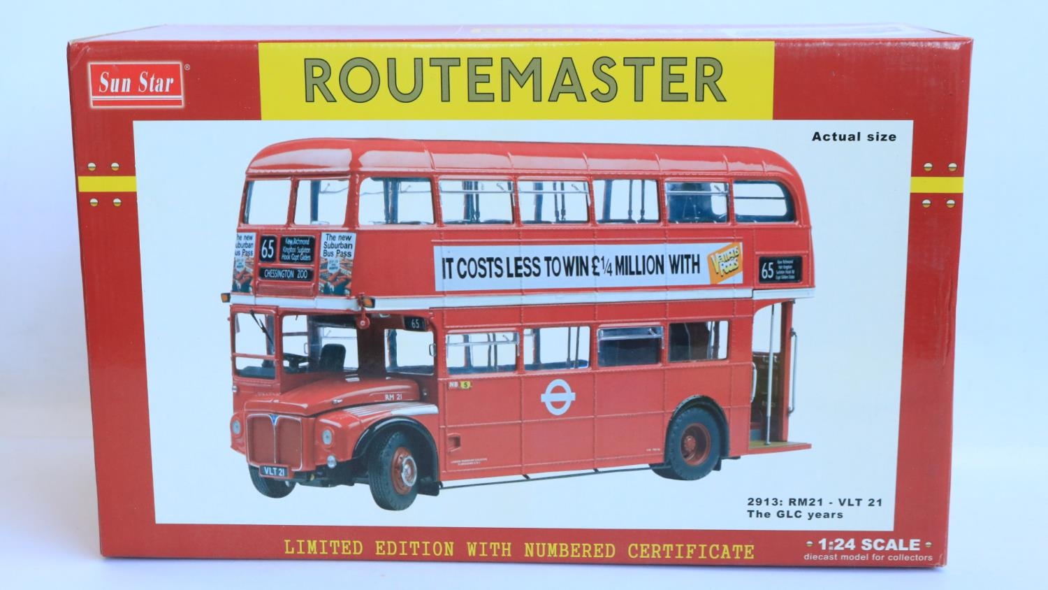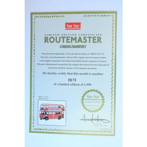 Boxed 1/24 scale diecast Sun Star limited edition Routemaster double decker bus model (678/1999), item no 2913, RM 21-VLT 21 'The GLC Years' in excellent previously displayed and slightly dusty condition, missing small chrome handle left bonnet side, complete with CoA and unused/sealed accessory pack, box excellent