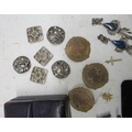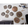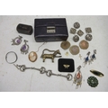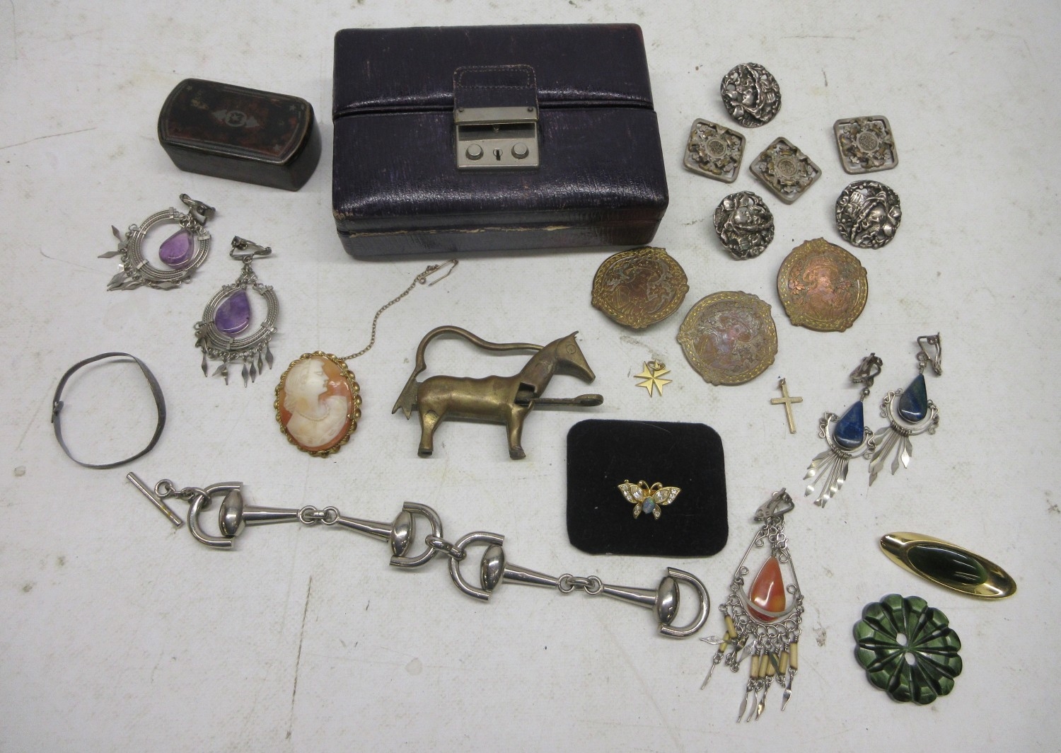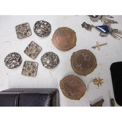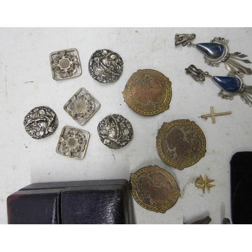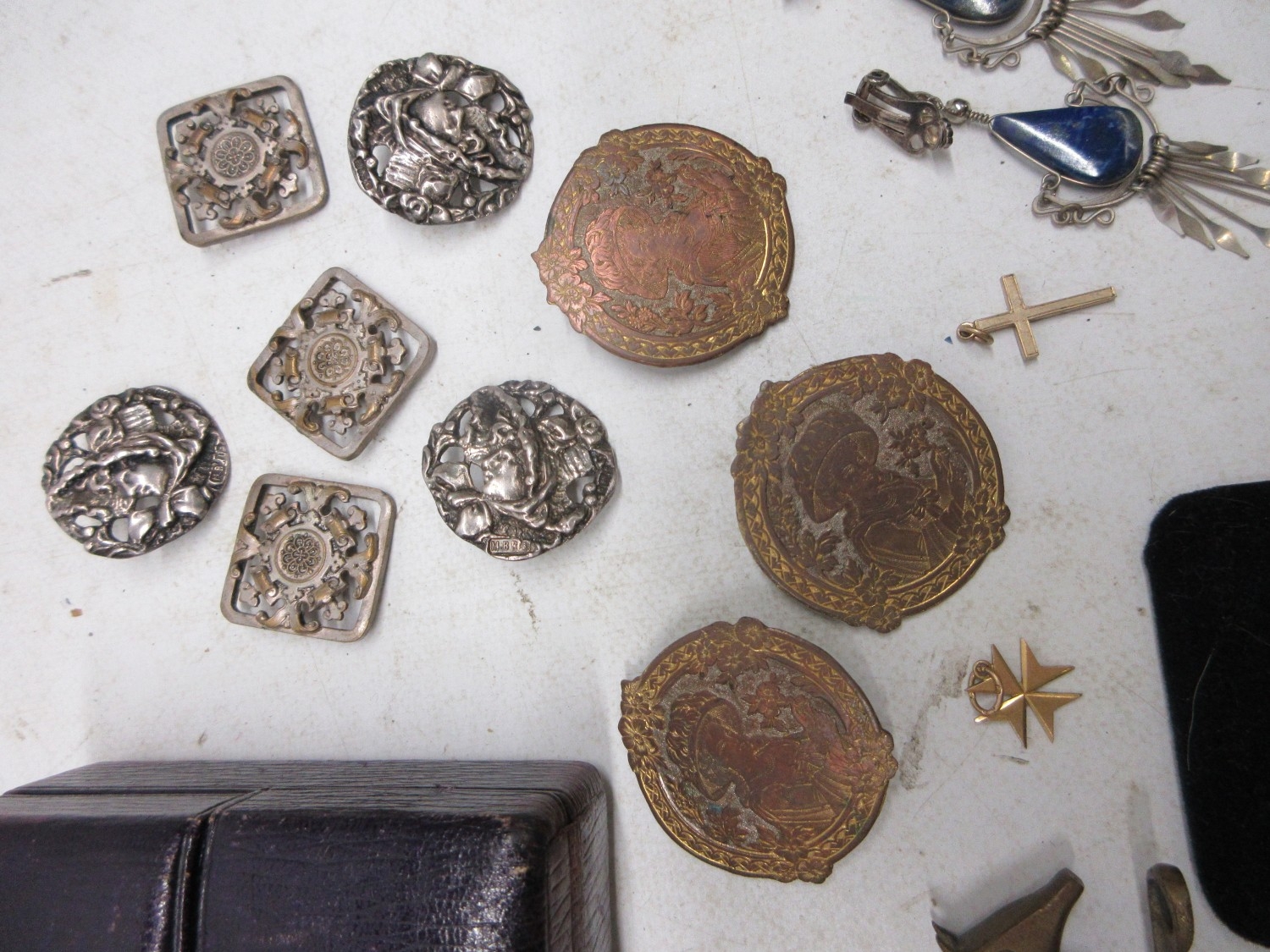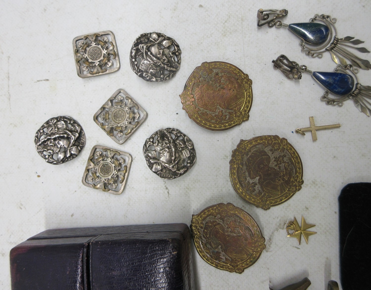 9ct yellow gold cross pendant, stamped 375, 1.09g, a yellow metal Maltese cross pendant, Art Noveau multi tone metal buttons depicting woman collecting flowers, similar white metal buttons, a brass lock in the form of a horse, and a collection of metal jewellery set with polished stones etc.