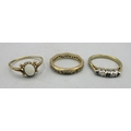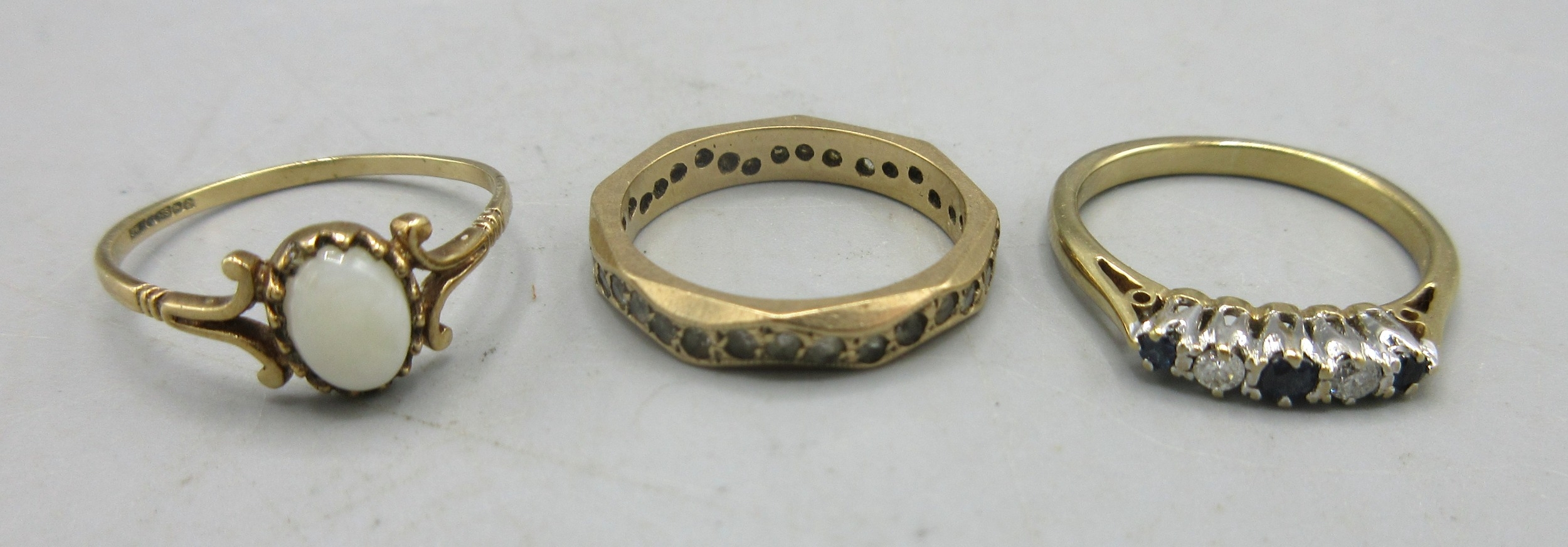9ct yellow gold ring set with sapphires and diamonds, size N, a 9ct yellow gold eternity ring set with clear stones, size M1/2, and a 9ct yellow gold ring set with opal, size P, all stamped 375, 6.13g gross (3)