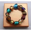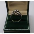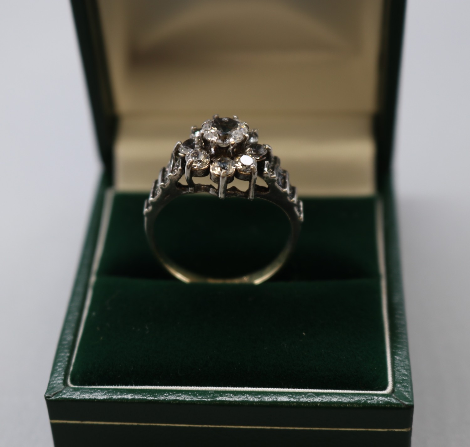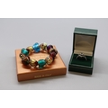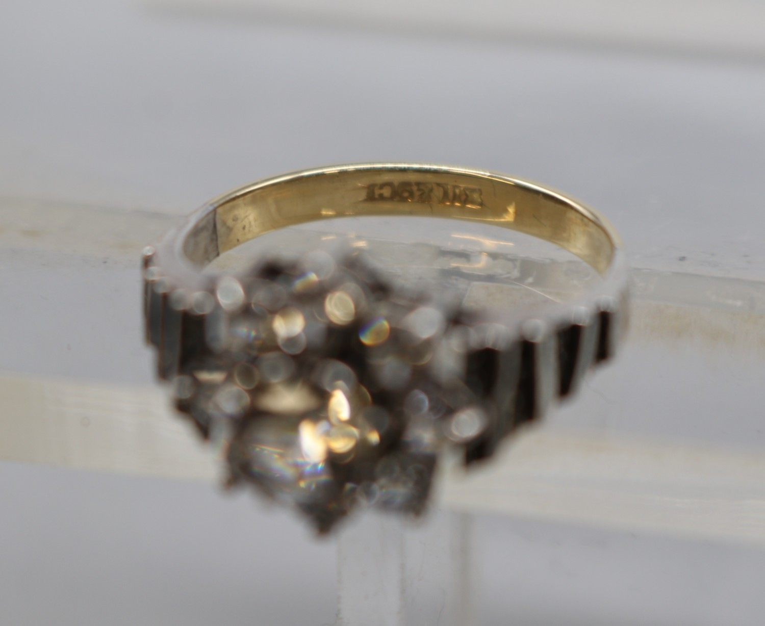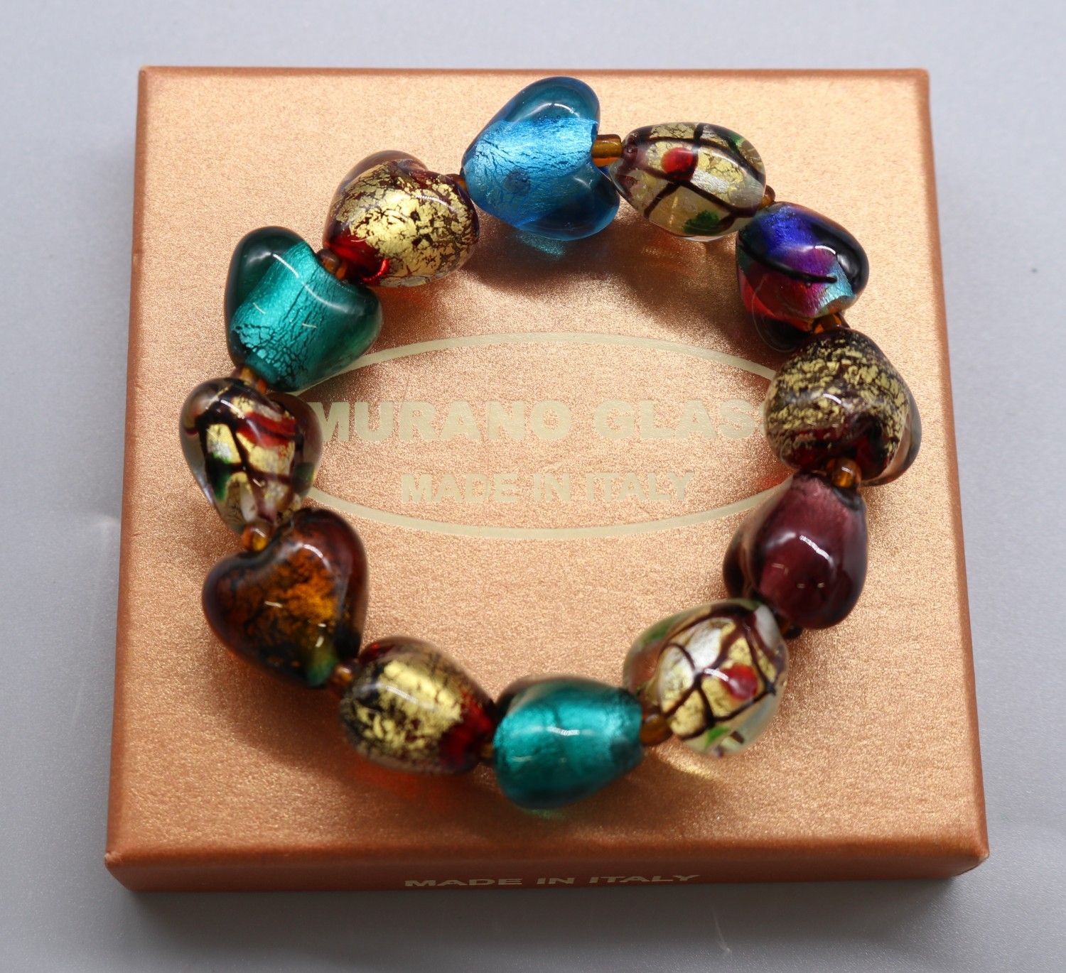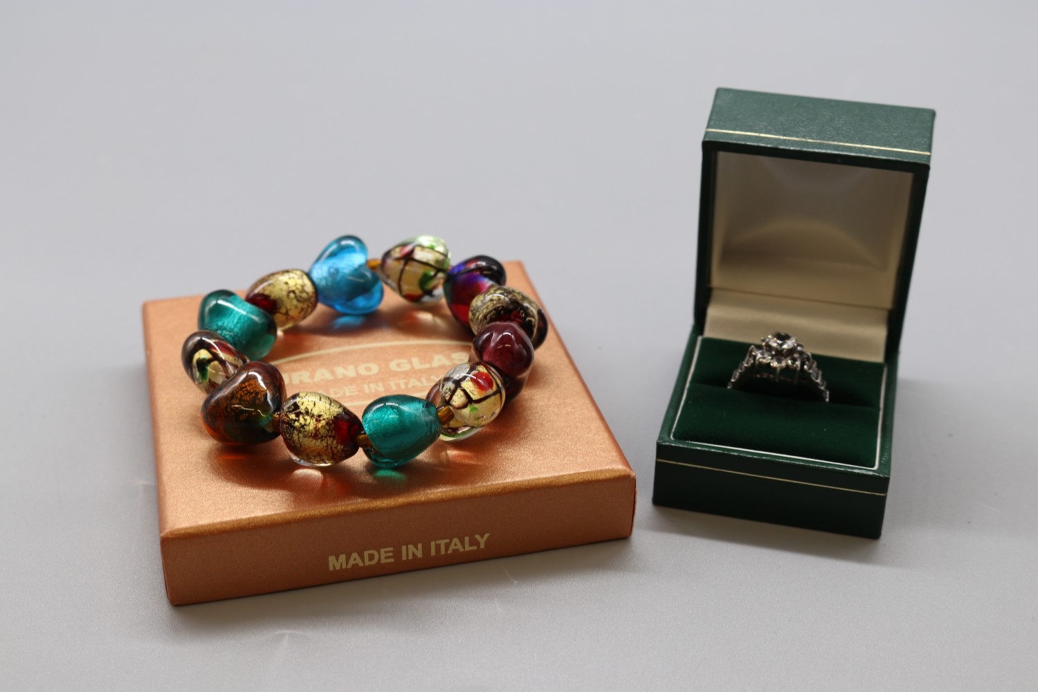 Silver and 9ct floral cluster ring, set with Clear stones, size O 1/2 (3.6g) and a Murano glass 12 love heart bracelet in original box