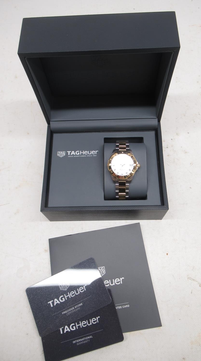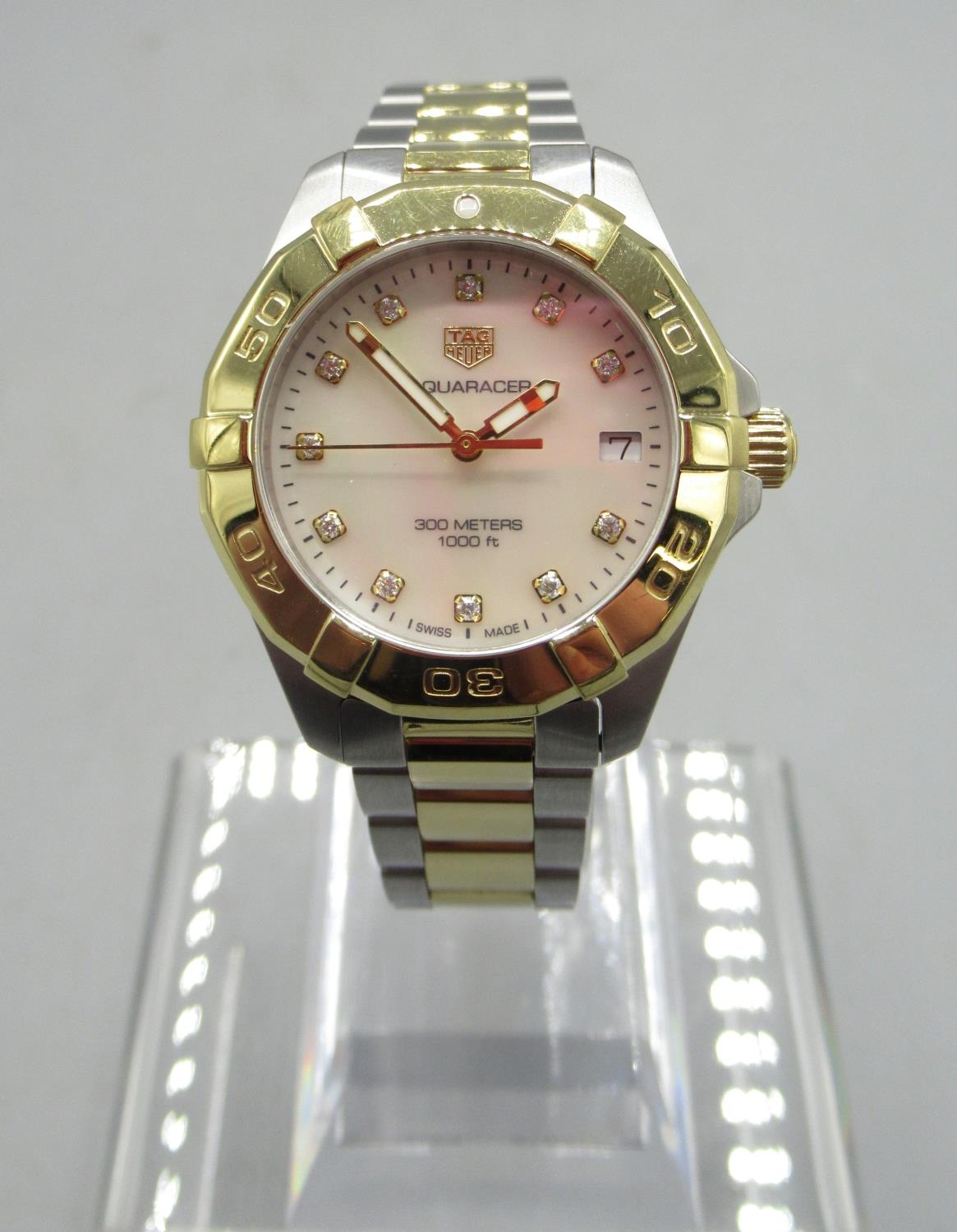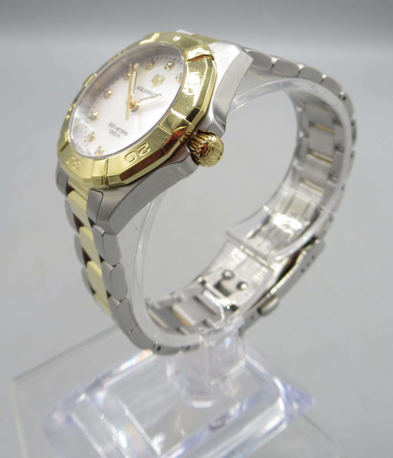 Tag Heuer 300m Aquaracer, Ladies stainless steel and gold plated quartz wristwatch with date on matching bracelet with signed deployment clasp, signed Mother of Pearl dial with diamond dot indices and centre seconds, signed screw on case back model ref. WBD1322, serial no. RTJ6914, D32.5mm