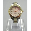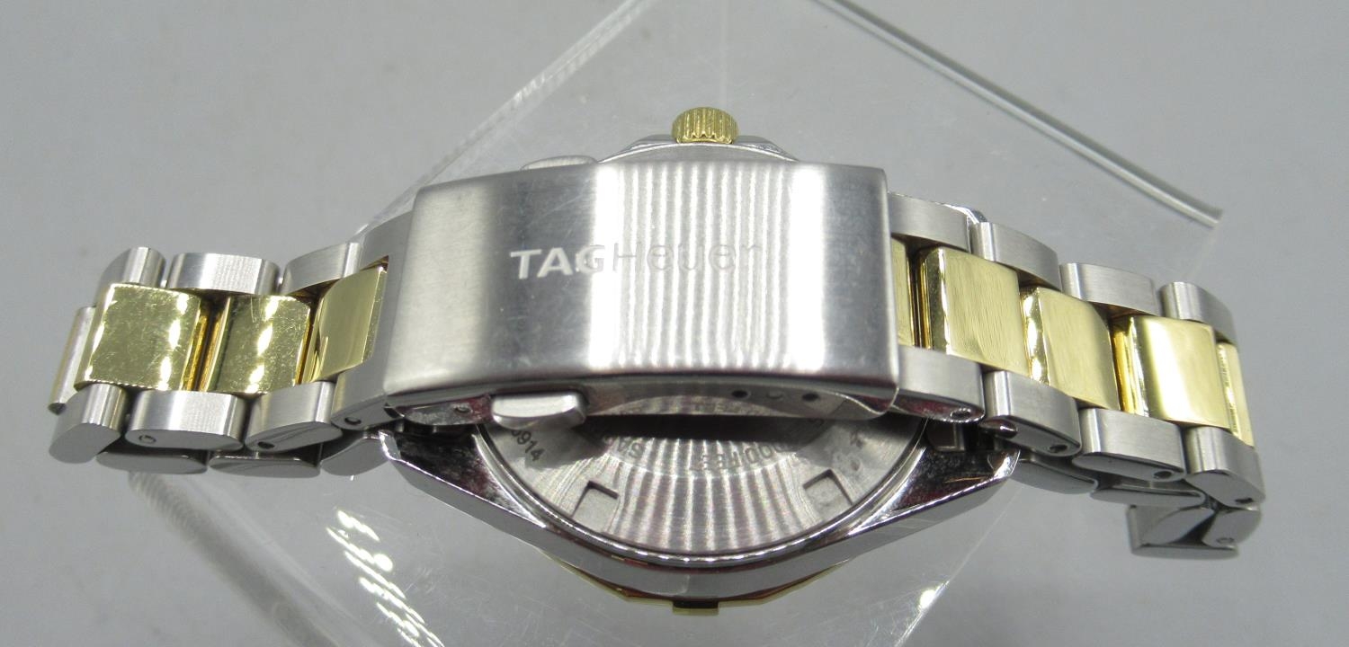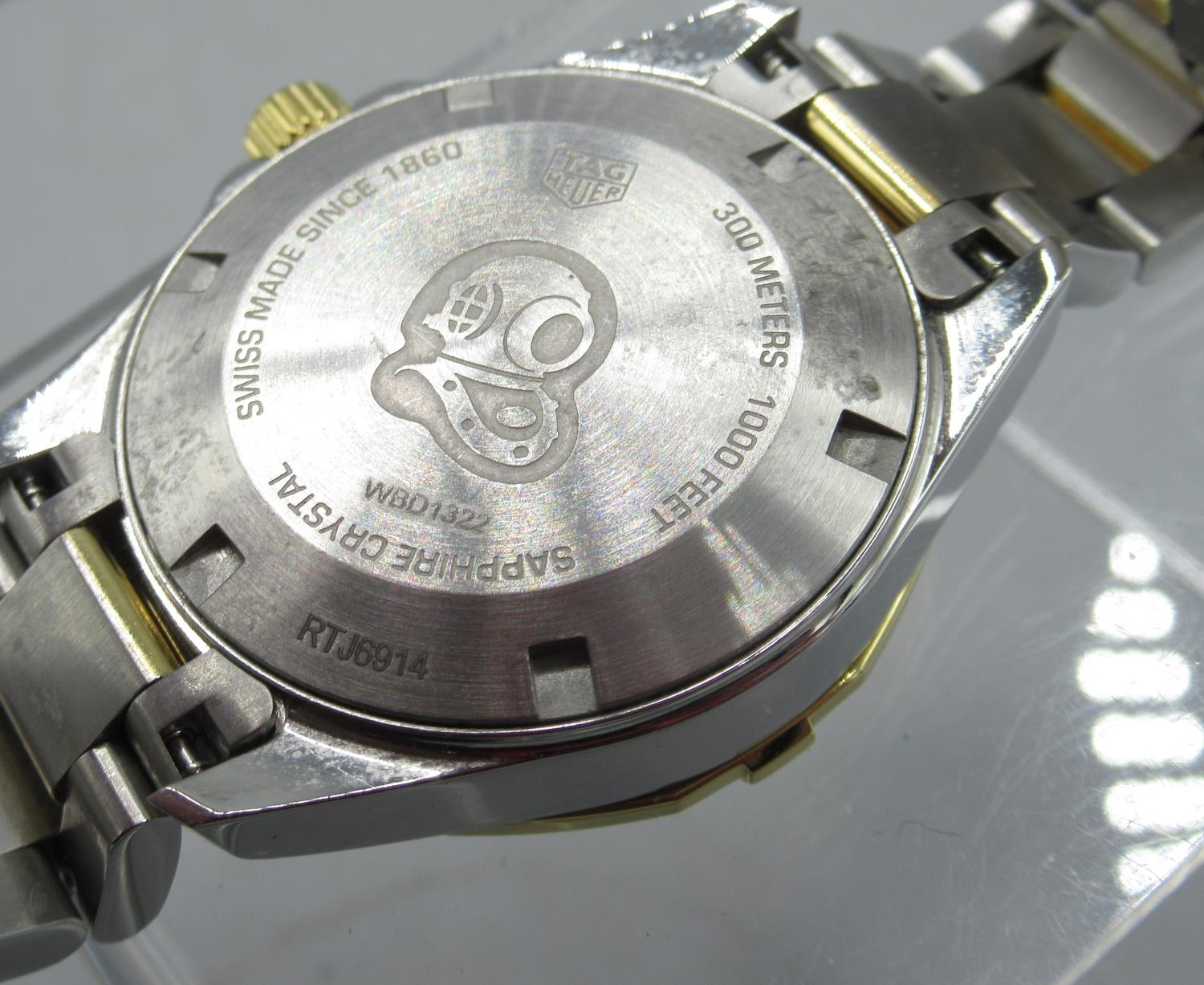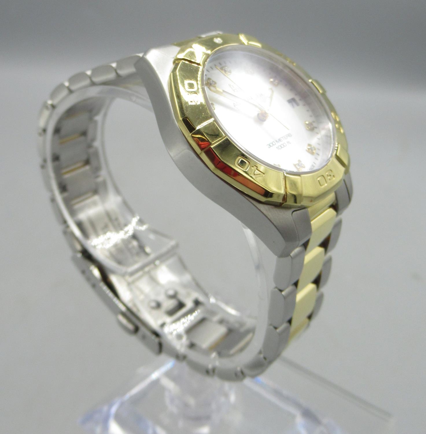 Tag Heuer 300m Aquaracer, Ladies stainless steel and gold plated quartz wristwatch with date on matching bracelet with signed deployment clasp, signed Mother of Pearl dial with diamond dot indices and centre seconds, signed screw on case back model ref. WBD1322, serial no. RTJ6914, D32.5mm