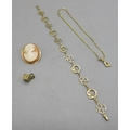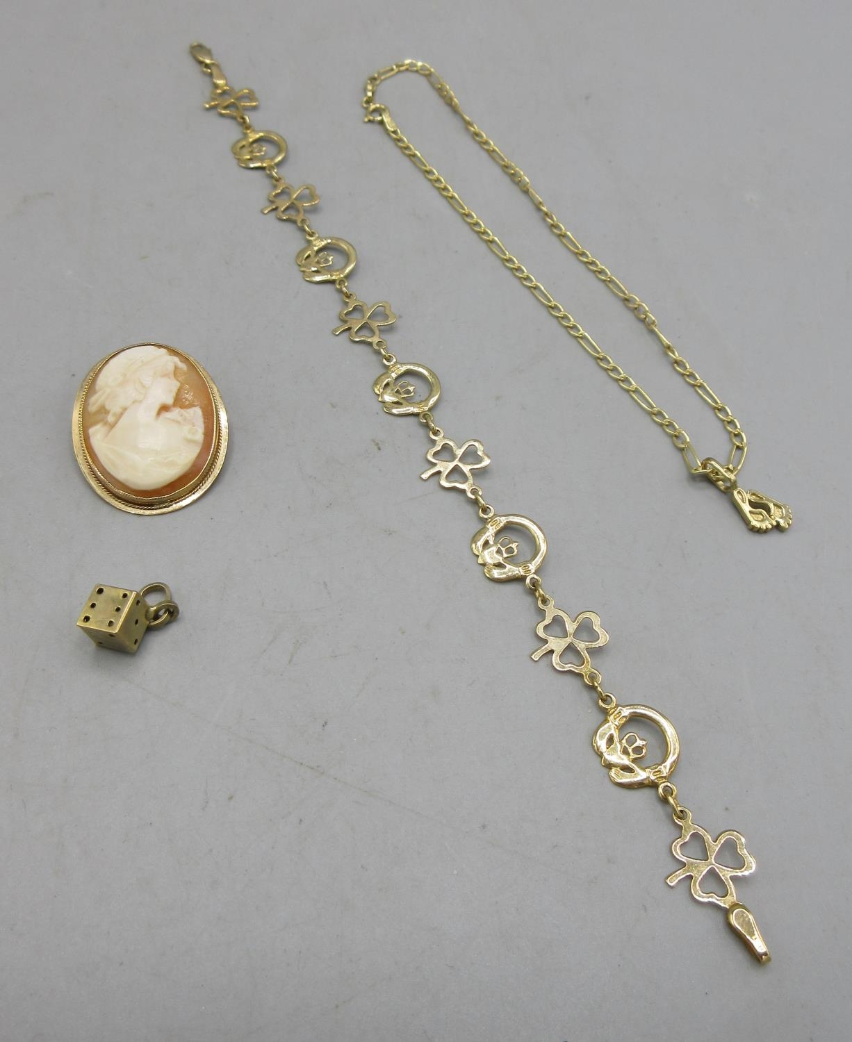 9ct yellow gold clover and claddagh link bracelet, L19cm, a 9ct gold bracelet set with feet charm, and a 9ct yellow gold dice charm, all stamped 375 and 9ct, 5.92g, and a 9ct yellow gold cameo brooch