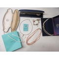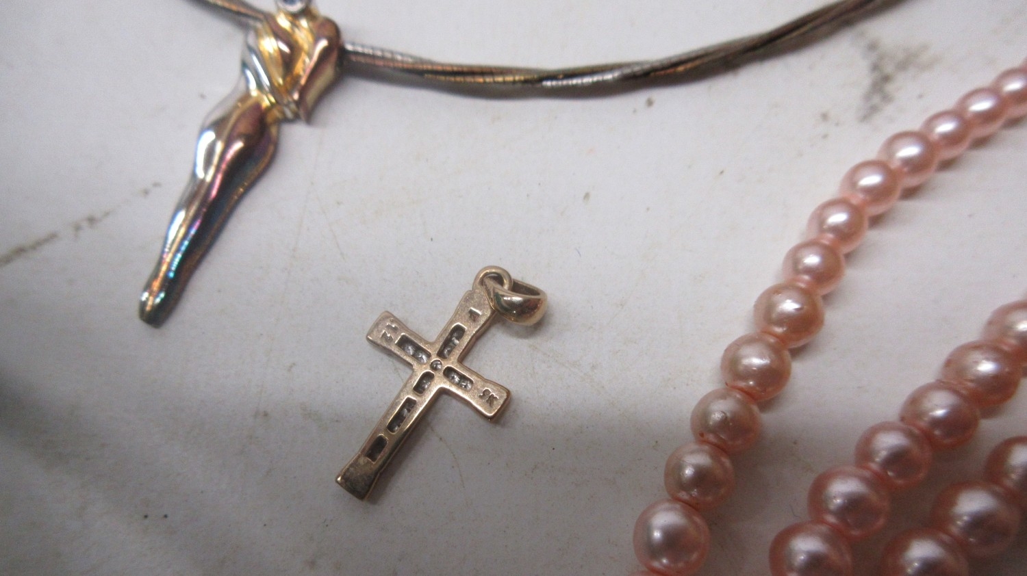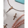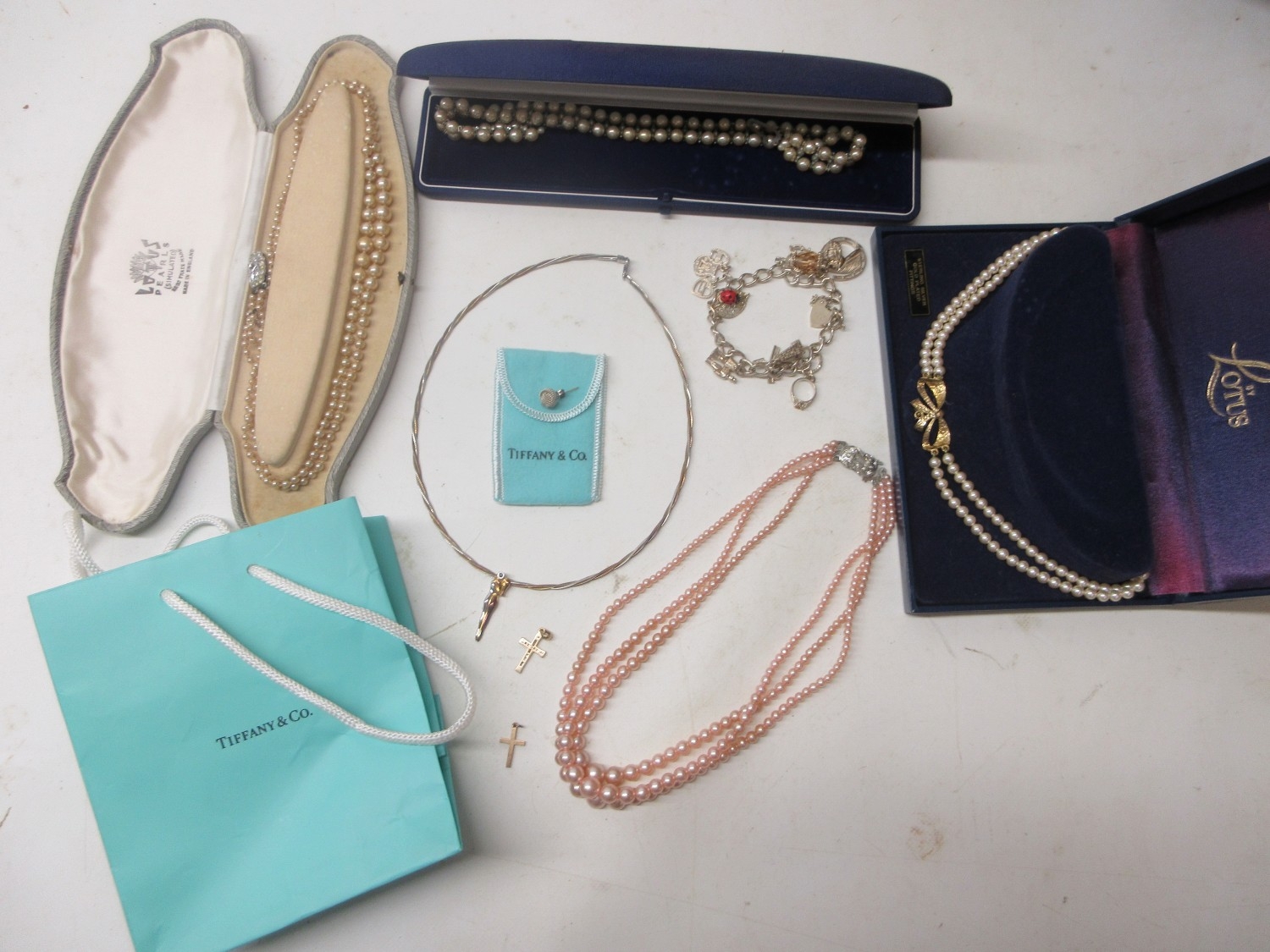 Two 9ct yellow gold cross pendants, one set with diamonds, both stamped 375, 2.25g, a single silver Tiffany's earring, boxed with receipt, a silver charm bracelet, a silver necklace with multi tone plating and figure pendant, costume pearls etc.