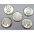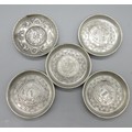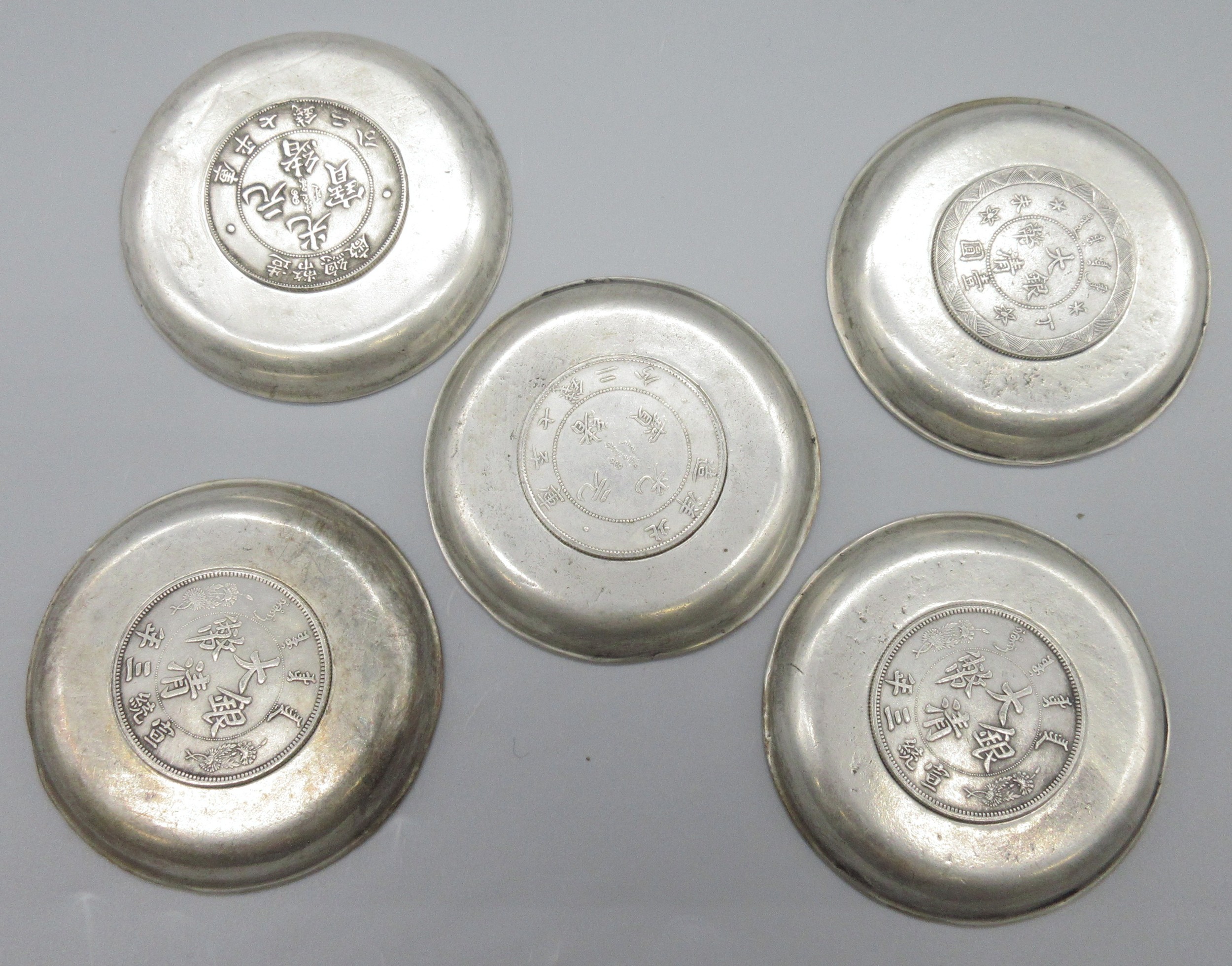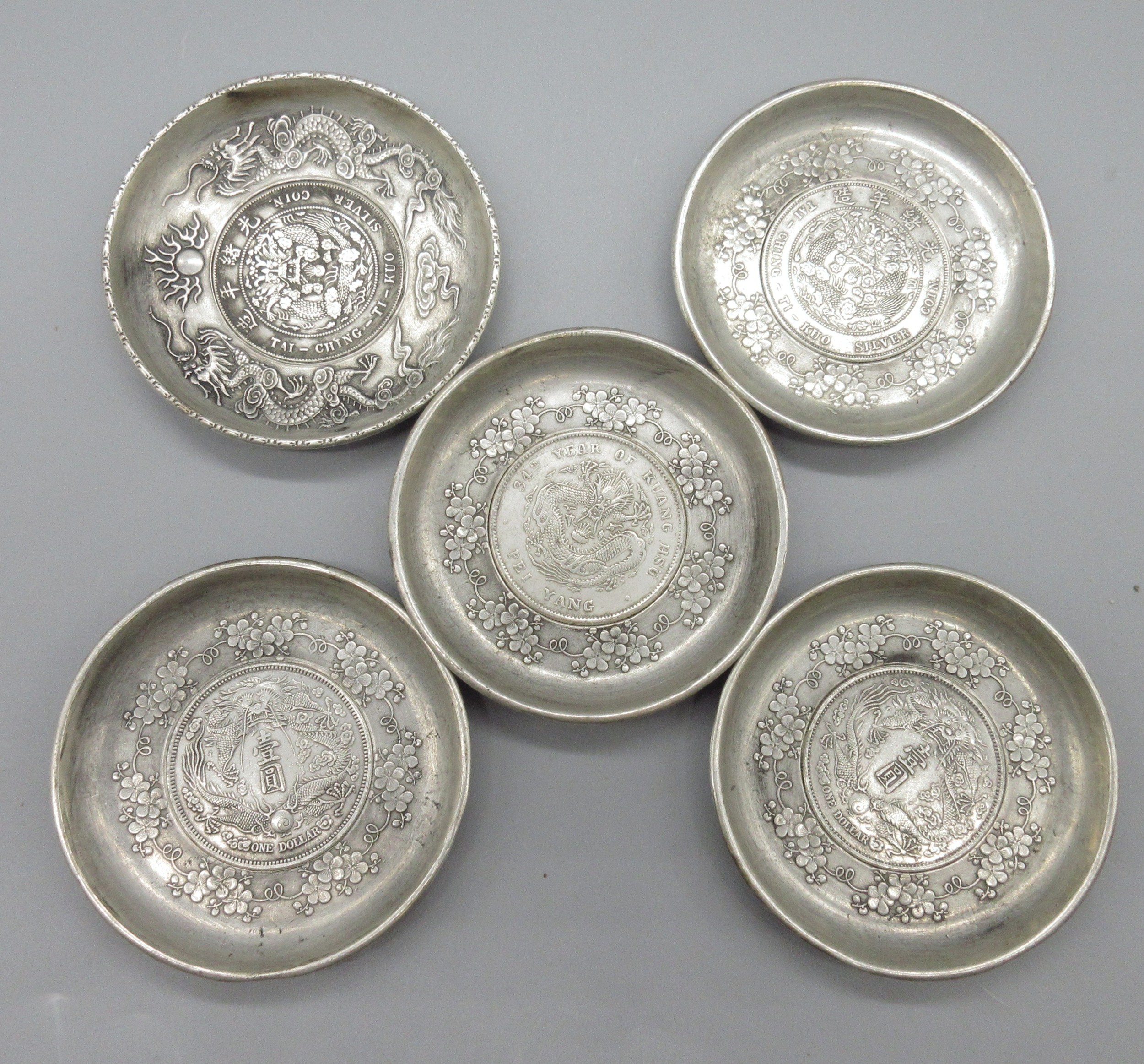 Five unmarked white metal dishes inset with various Chinese coins; two Tai-Ching-Ti-Kuo 'silver coins', two one dollar coins and one Pei Yang coin, decorated with blossom or dragon borders