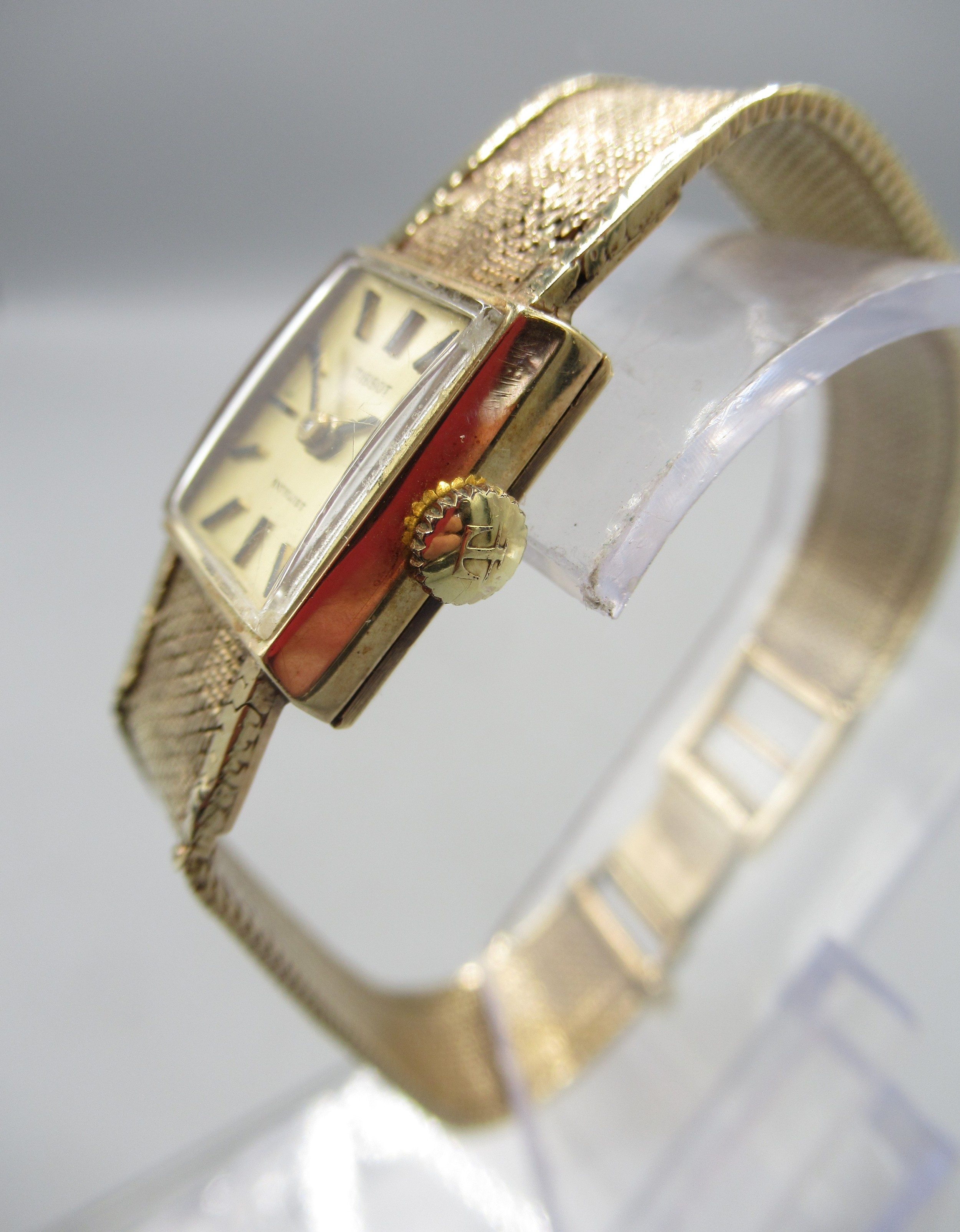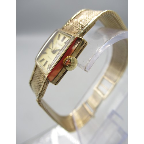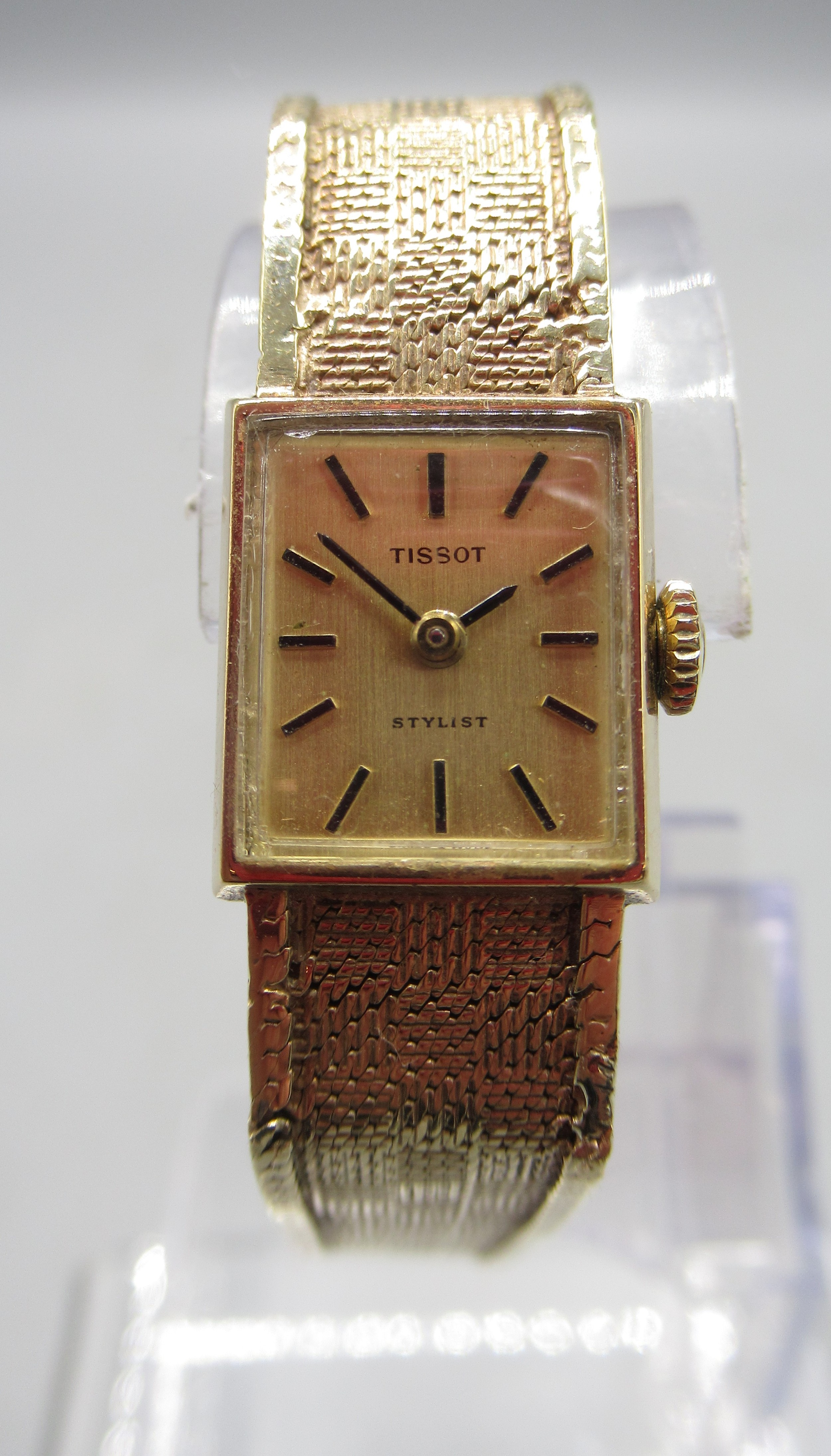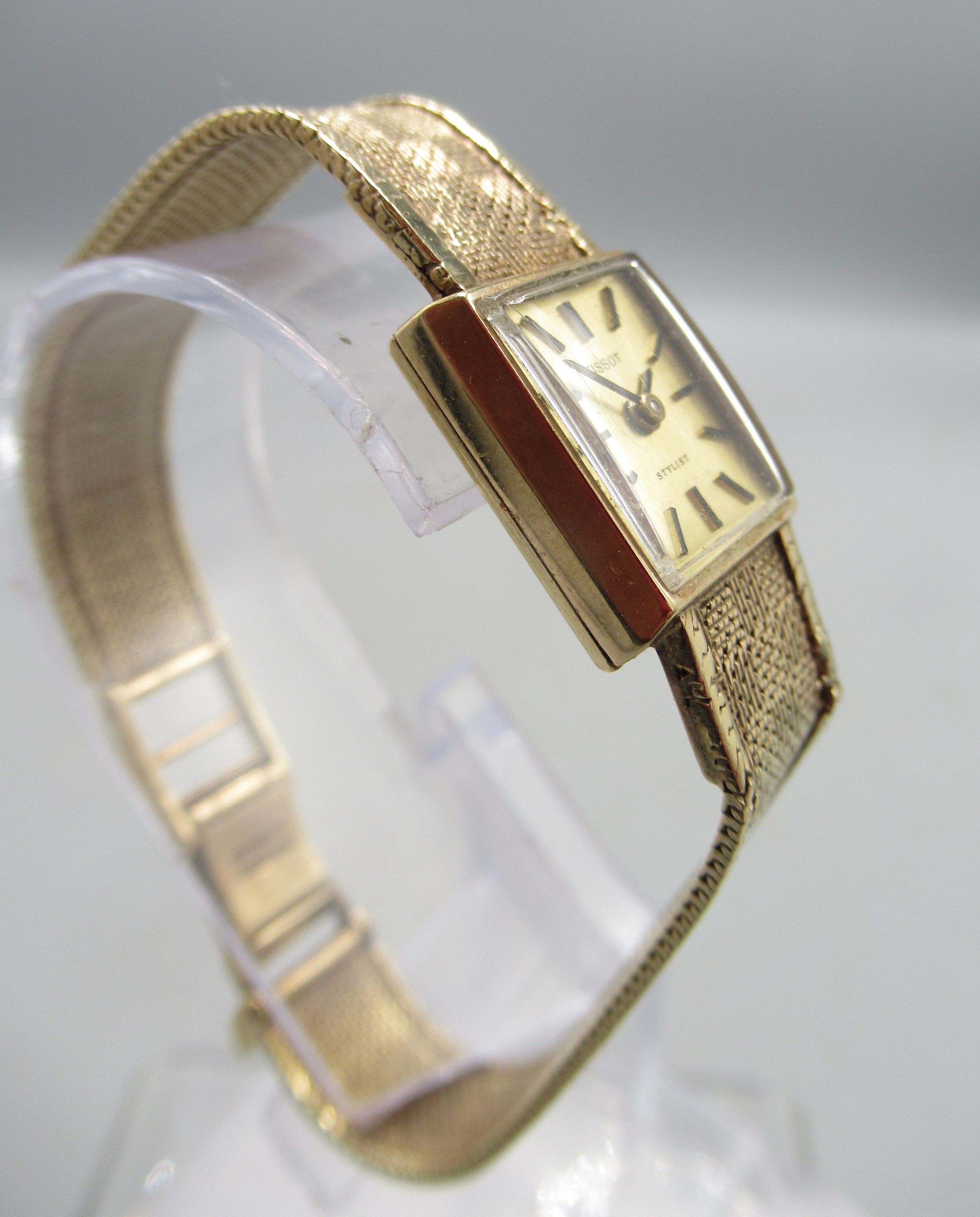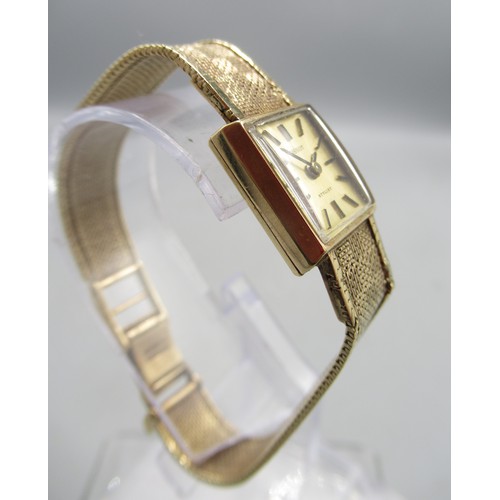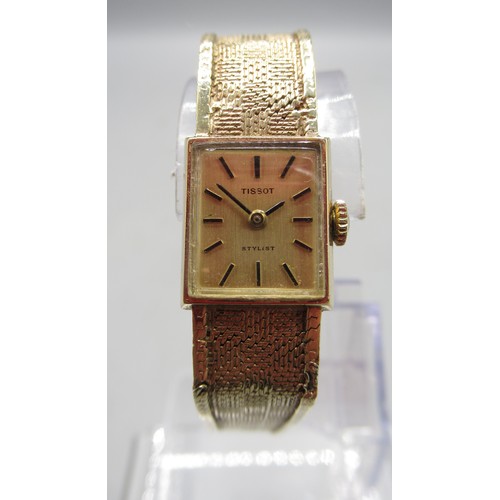 Tissot Stylist ladies 9ct gold wristwatch on integrated fine mesh bracelet, stamped .375, signed champagne dial with baton indices, signed snap on case back no. 1061/75202, Birmingham 1970, Tissot 17 jewel unadjusted movement, no. 11671263, gross weight 19.6g, D14.3mm
