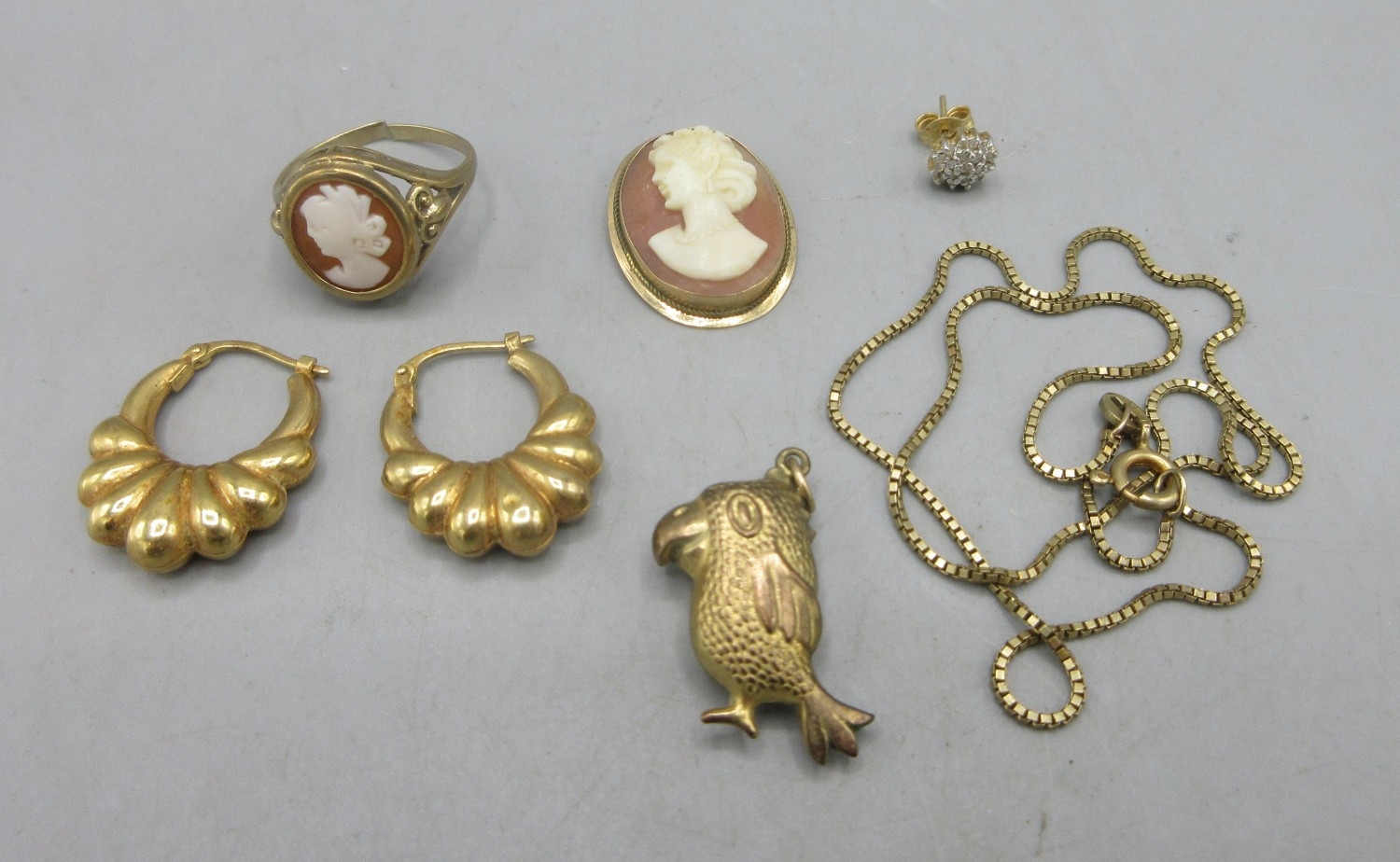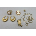 Pair of 9ct yellow gold hoop earrings, a 9ct yellow gold bird pendant, a 9ct yellow gold chain (A/F), a 9ct yellow gold single stud earring, a 9ct cameo ring, AF, all stamped 375, 9.05g, a cameo pendant in 18ct yellow gold surround, stamped 750