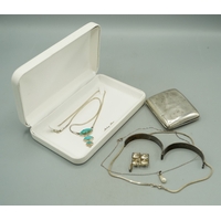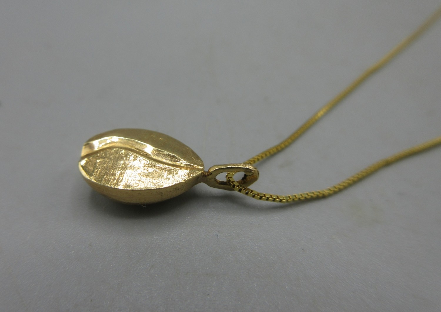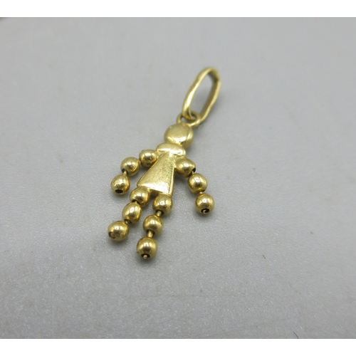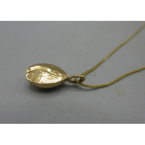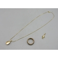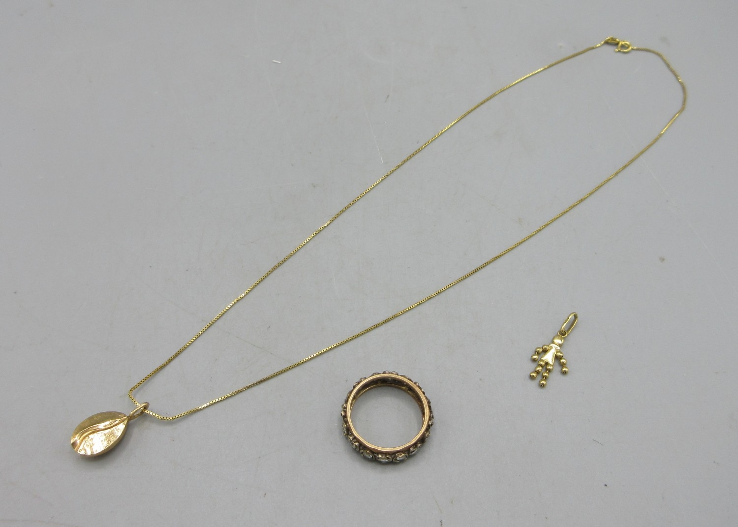 9ct yellow gold coffee bean pendant on box chain necklace, L40cm, stamped 375, a 9ct yellow gold ring set with clear stones, stamped 9ct, 5.25g, and an 18ct yellow gold charm, stamped 750, 0.67g