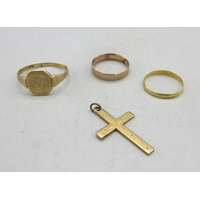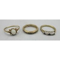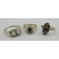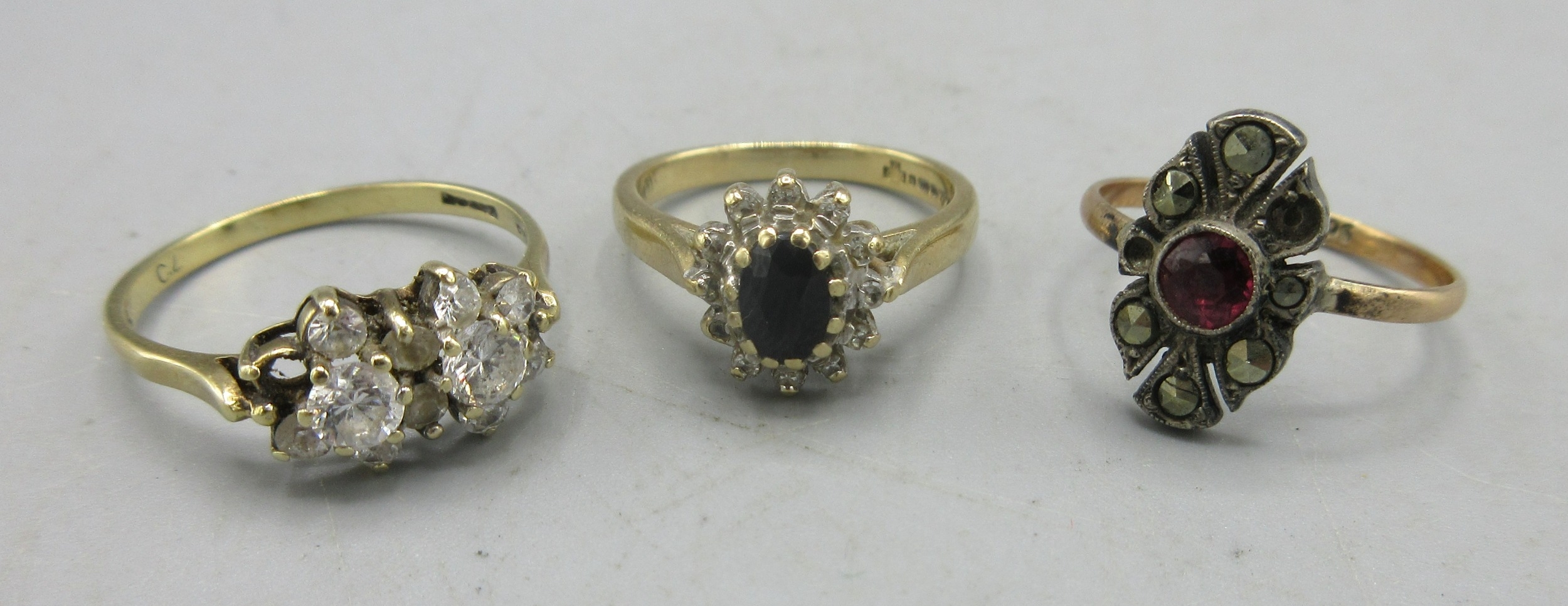 9ct yellow gold sapphire and white stone cluster ring, size J, another 9ct yellow gold ring with clear stones, size P1/2, both stamped 375, and a 9ct rose gold and silver ring set with clear stone and marcasite, size M, stamped 9ct & silv, 6.66g
