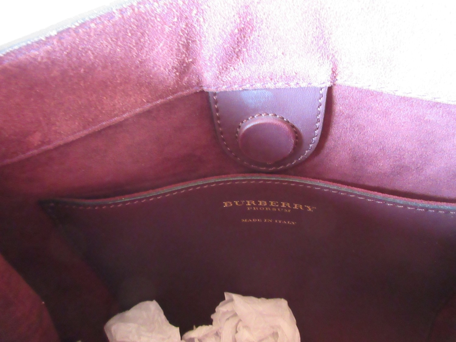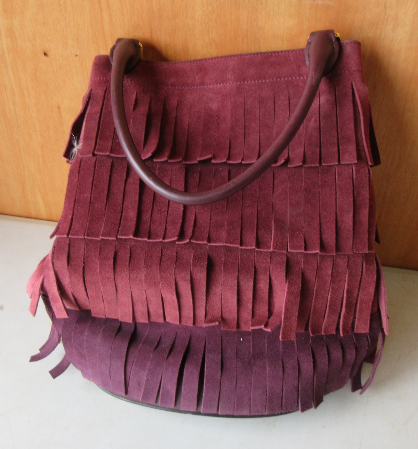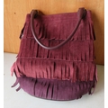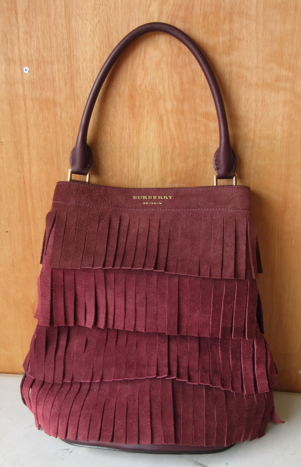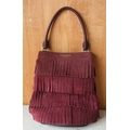 The Janet Street Porter Collection: Burberry Prorsum suede fringe bucket bag in Elderberry, tiered fringe with rolled leather handle, H54cm, W33cm, D11cm