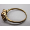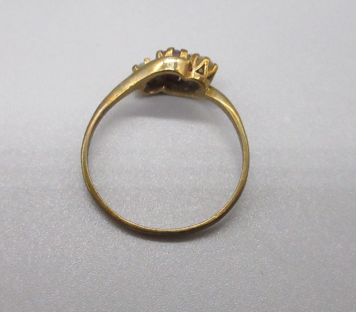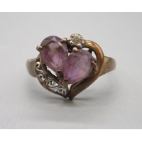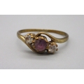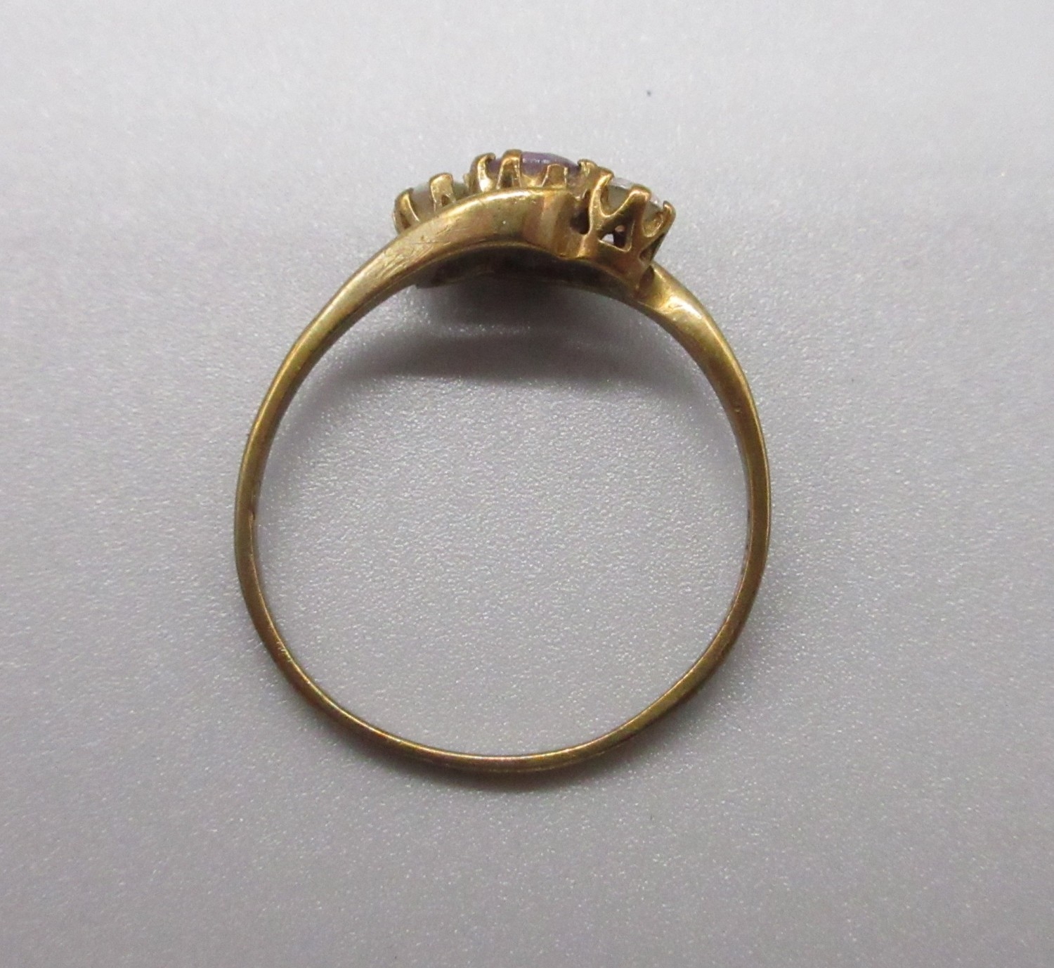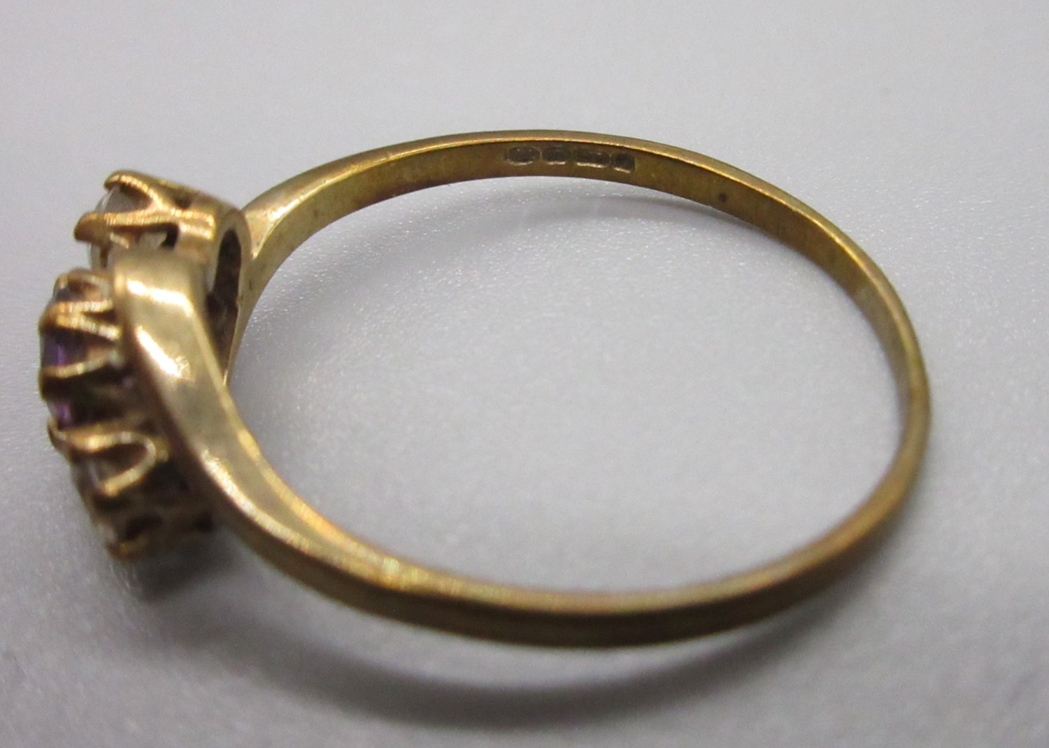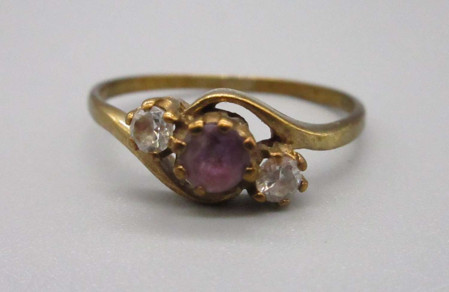 9ct stamped 3 stone ring with central amethyst stone ring, size P (1.4g)