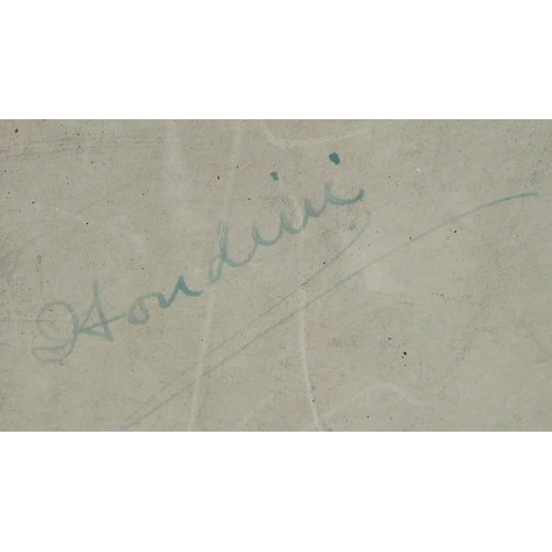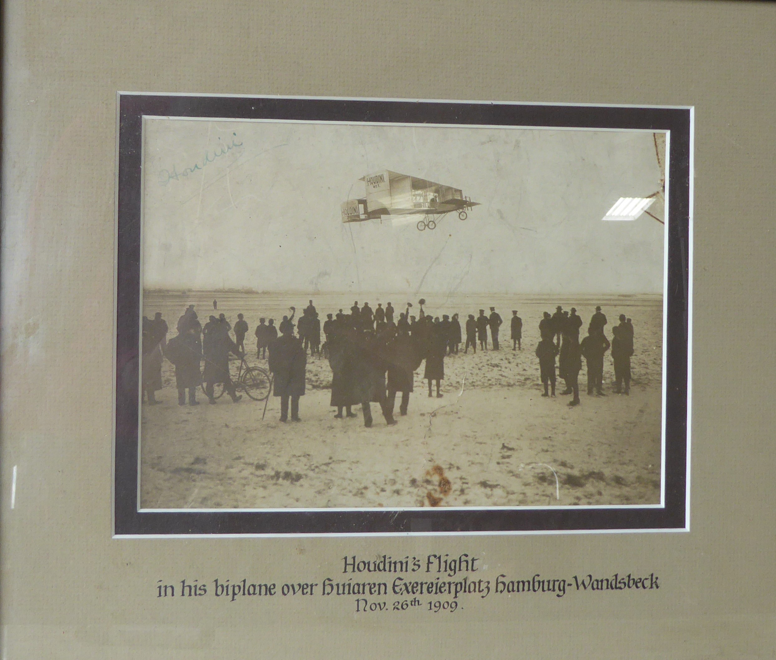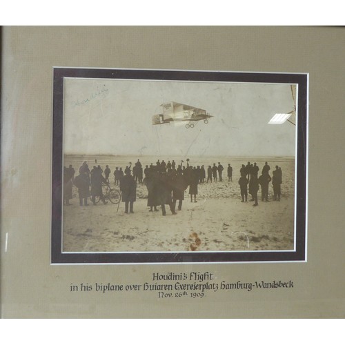 Harry Houdini (1874-1926) interest, signed framed photograph, 'Houdini's flight in his biplane over Huiaren Exereierplate hamburg-Wandsbeck Nov. 26th 1909', 36.5cm x 32cm
