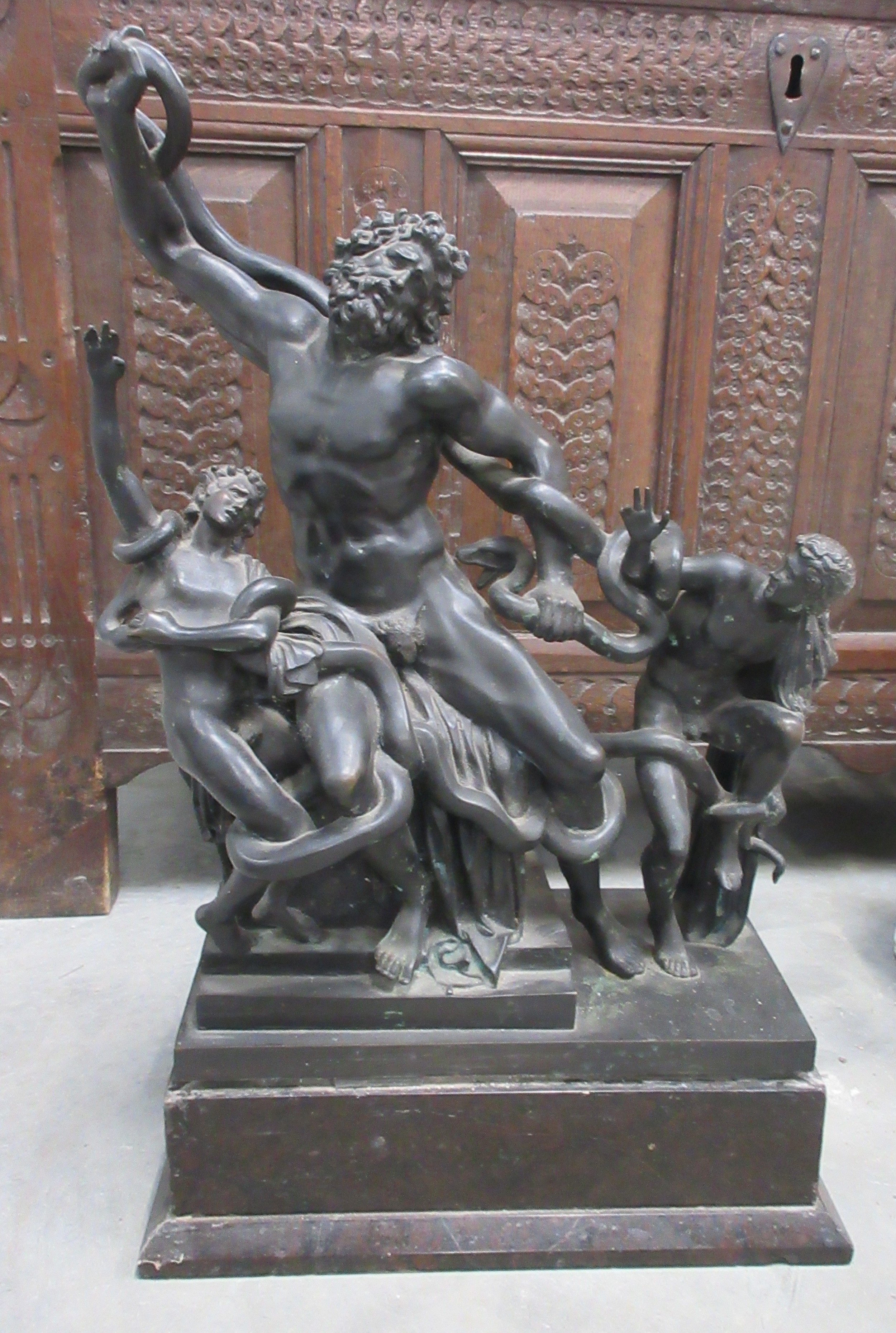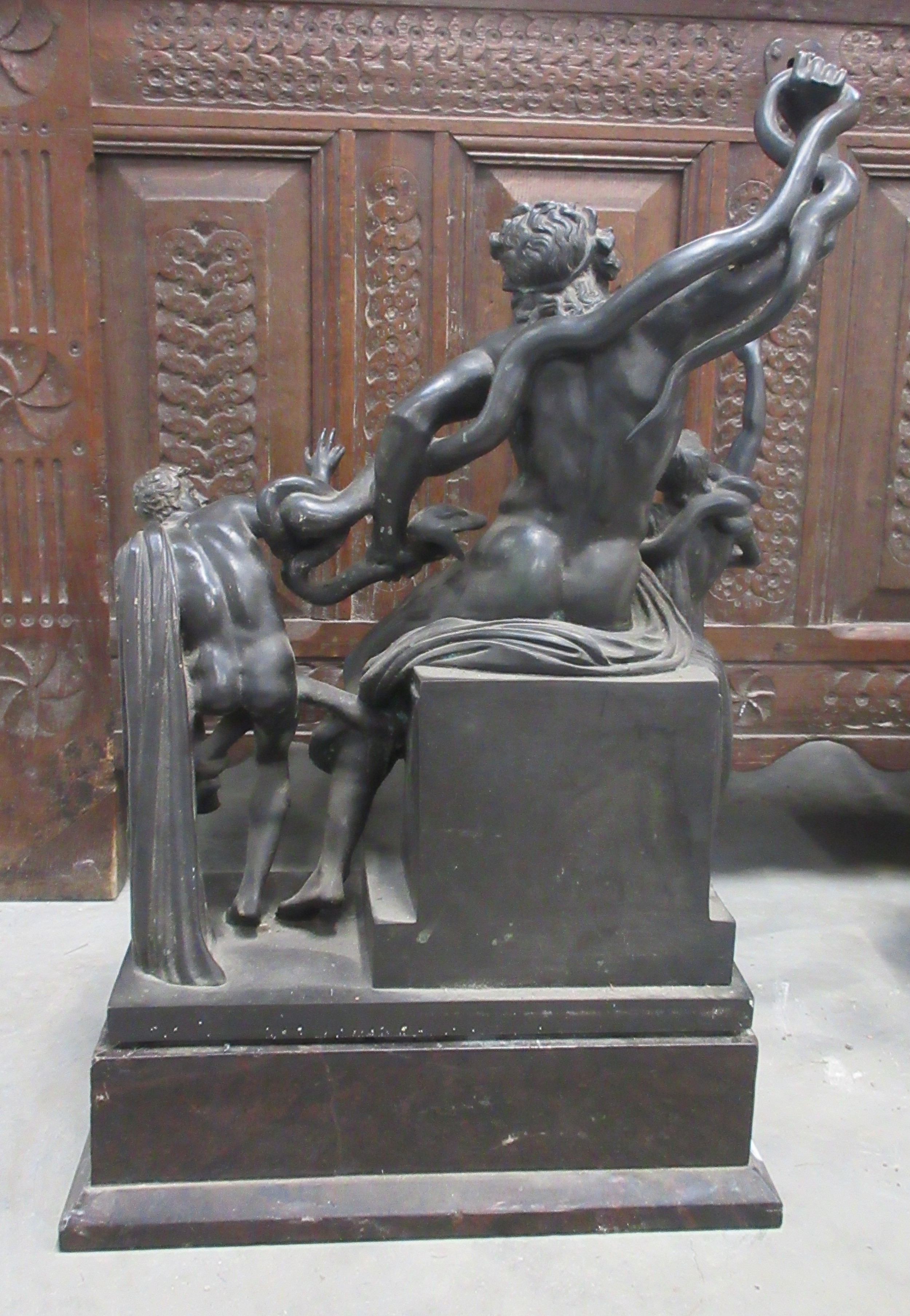 Bronze statue of The Laocoon, depicting Laocoon and his two sons being attacked by snakes, on a plinth base, approx. H68cm W38cm [AF]