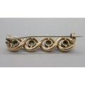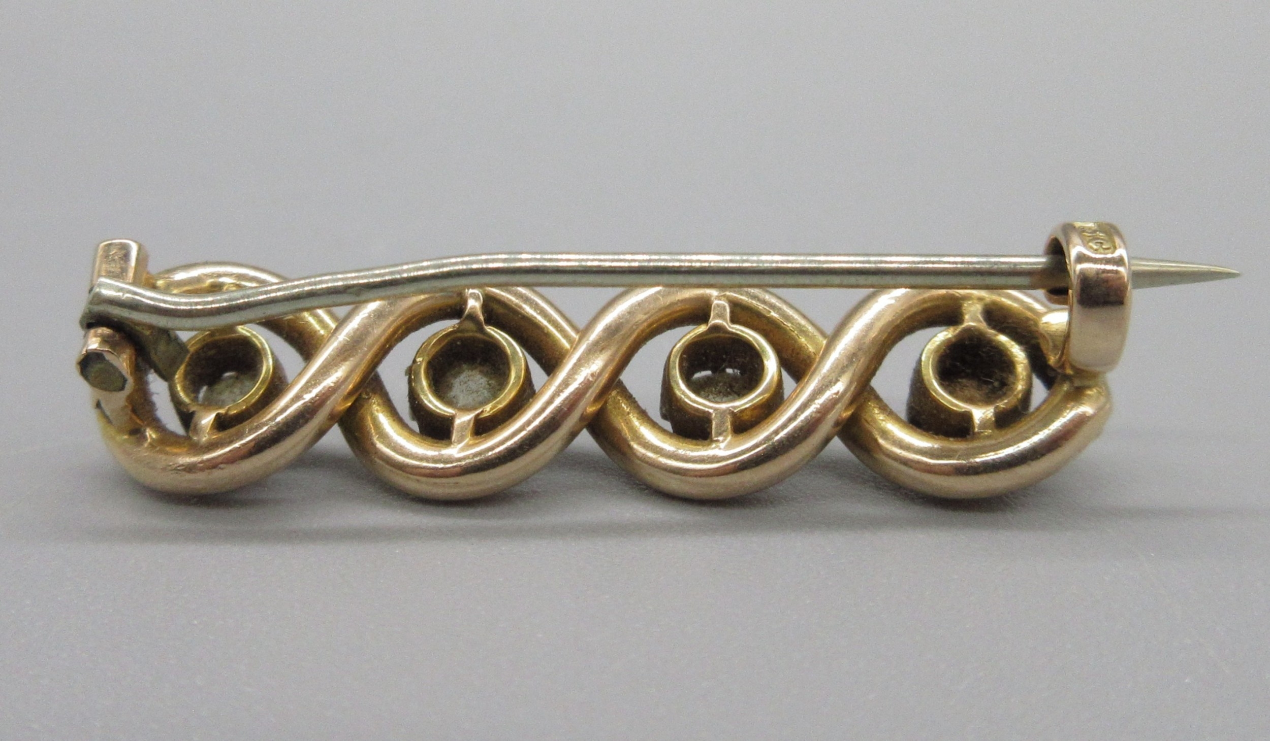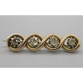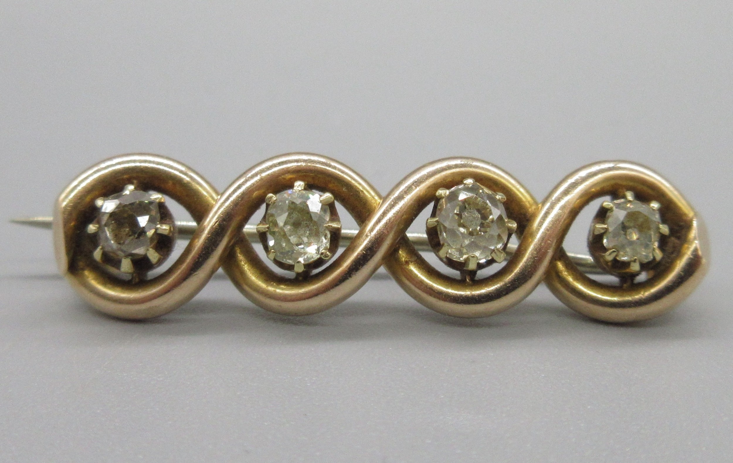 15ct rose gold twist brooch set with four moissanite, stamped 15c, L3.5cm, 5.0g