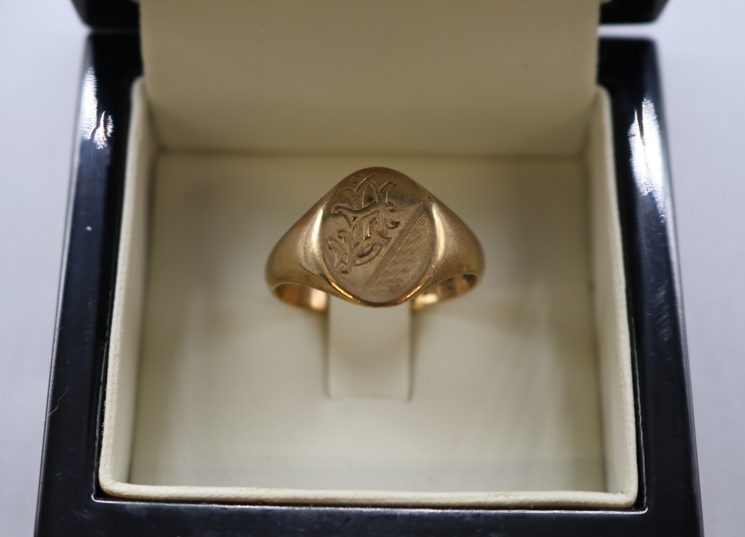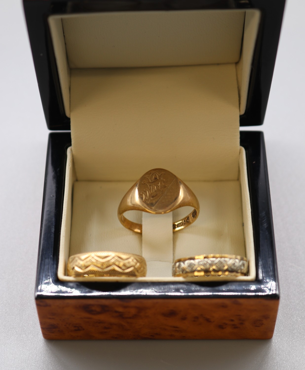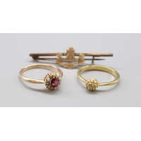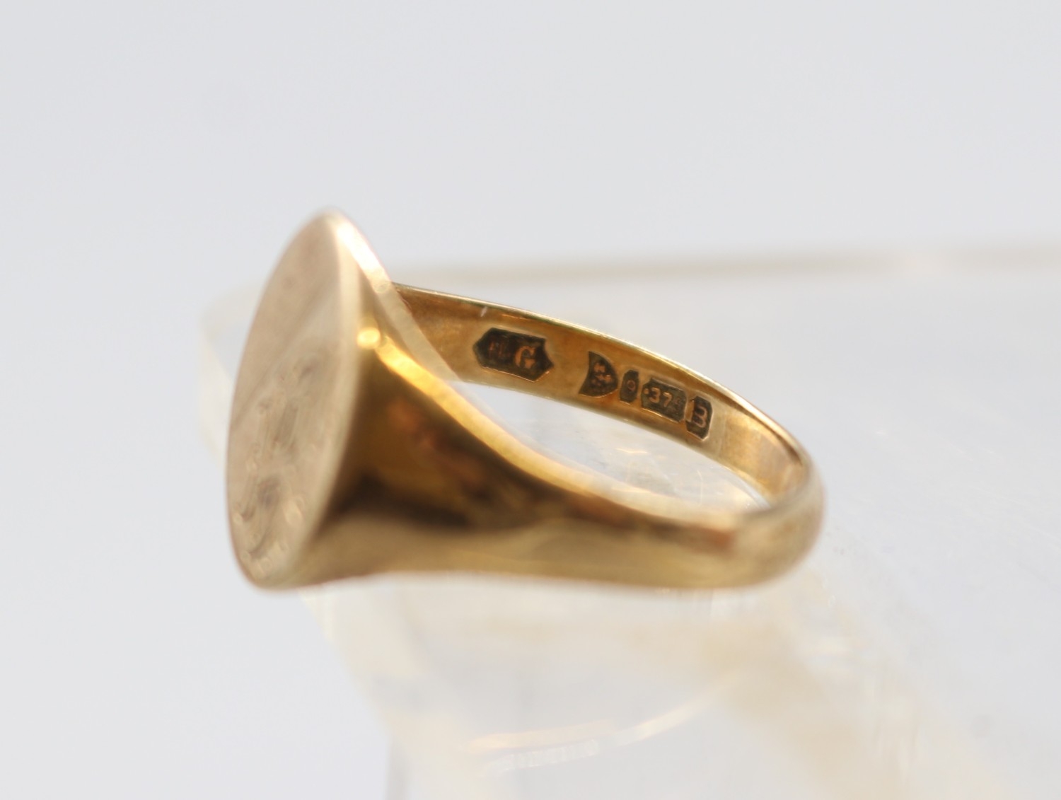 Three 9ct rings, 9ct hallmarked signet ring by H.G. Chester size R, J.Bros stamped .375 gold ring size P and a 17 stone stamped 9ct ring size M (gross 11g)
