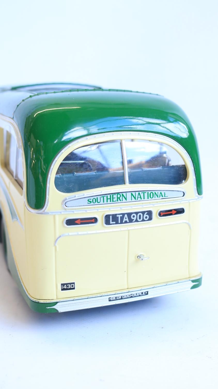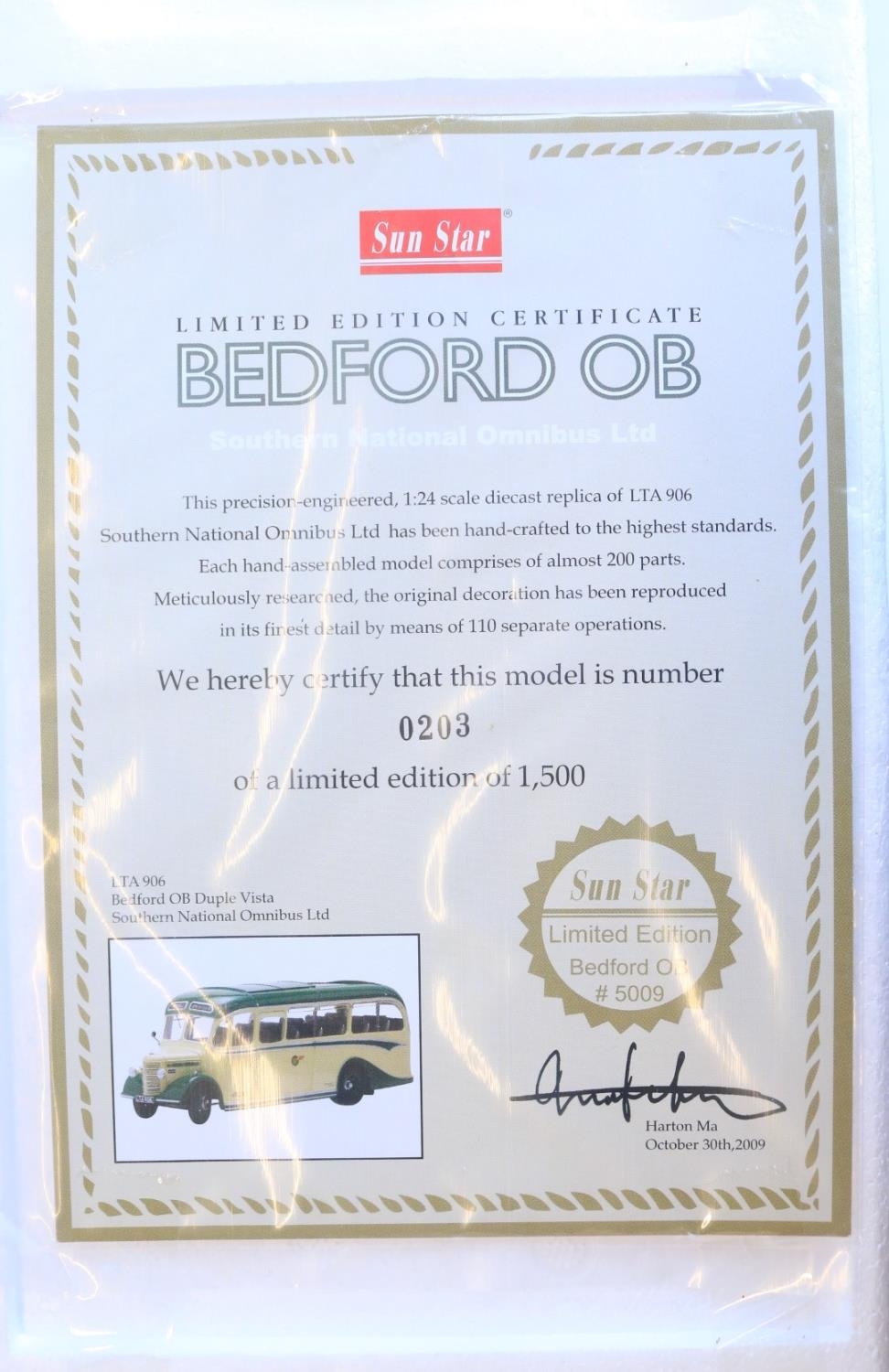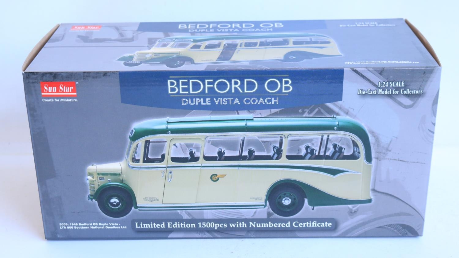 Boxed 1/24 scale limited edition diecast 1949 Bedford OB Duple Vista coach model from Sun Star, item no 5009, reg LTA 906 Southern National Omnibus Ltd (203/1500), model in at least very good overall condition, would be better but for snapped off and missing small front left light (see photos) and one clear upper window section detached with 2 snapped location pins, model a little dusty/dirty, complete with CoA and wing mirror, box at least excellent