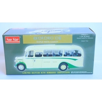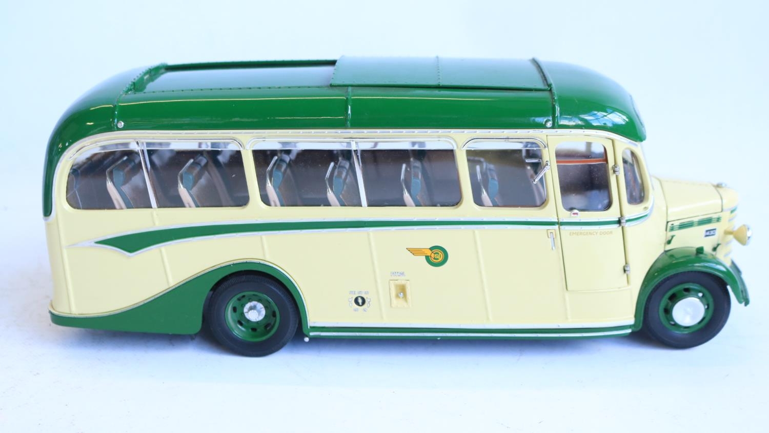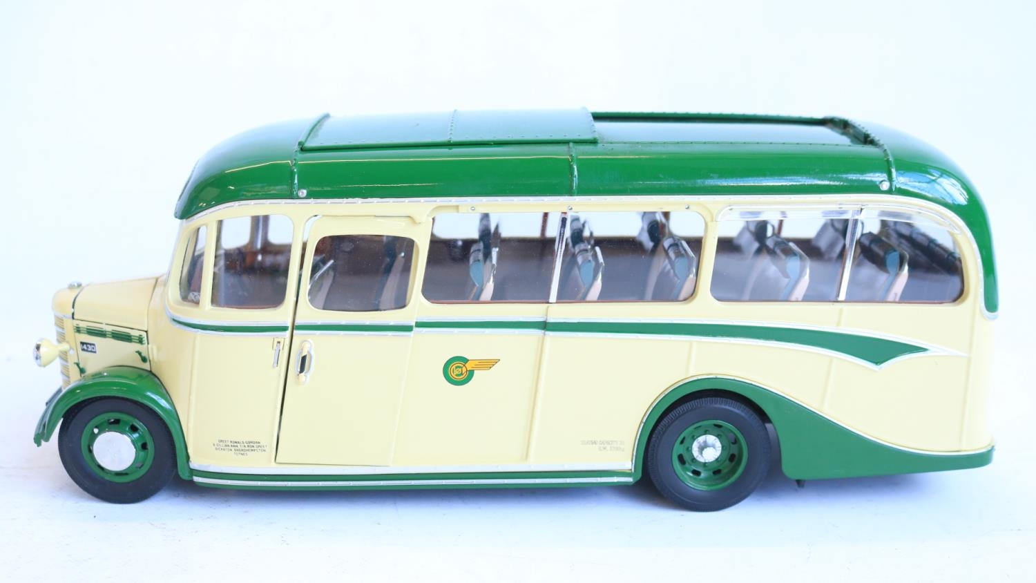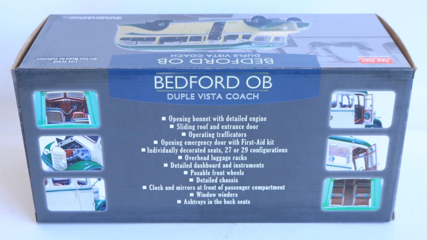 Boxed 1/24 scale limited edition diecast 1949 Bedford OB Duple Vista coach model from Sun Star, item no 5009, reg LTA 906 Southern National Omnibus Ltd (203/1500), model in at least very good overall condition, would be better but for snapped off and missing small front left light (see photos) and one clear upper window section detached with 2 snapped location pins, model a little dusty/dirty, complete with CoA and wing mirror, box at least excellent