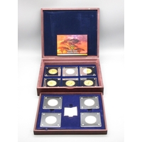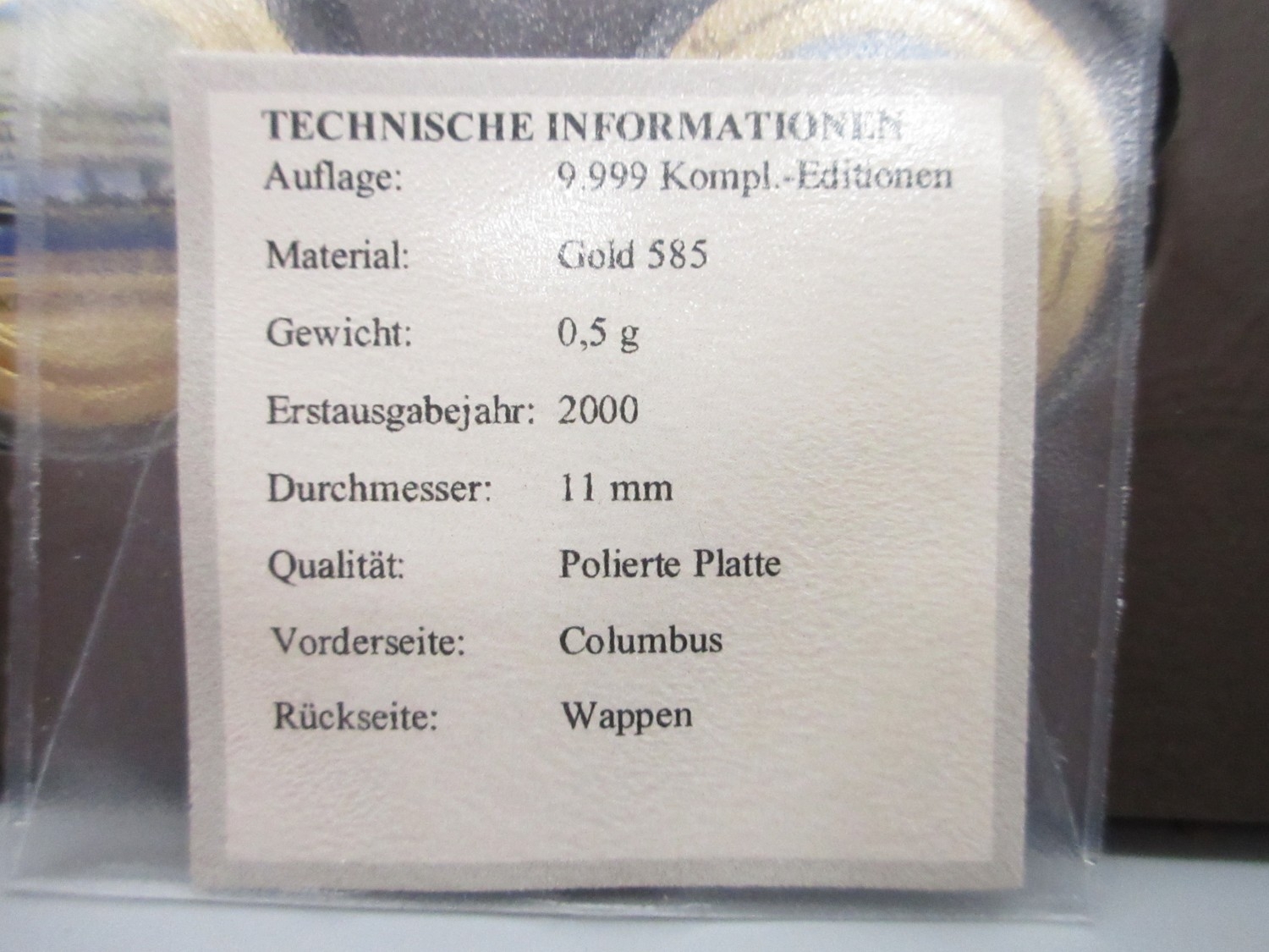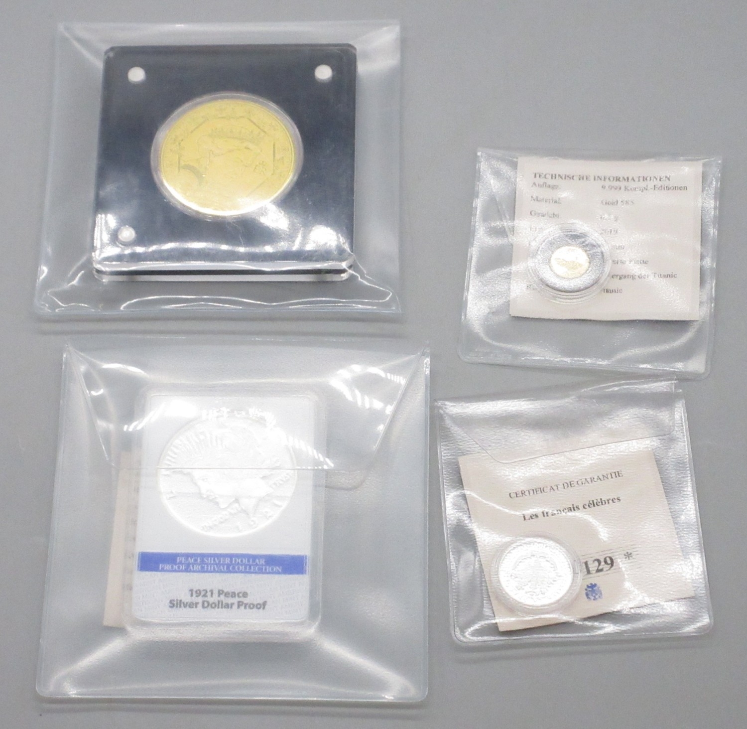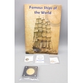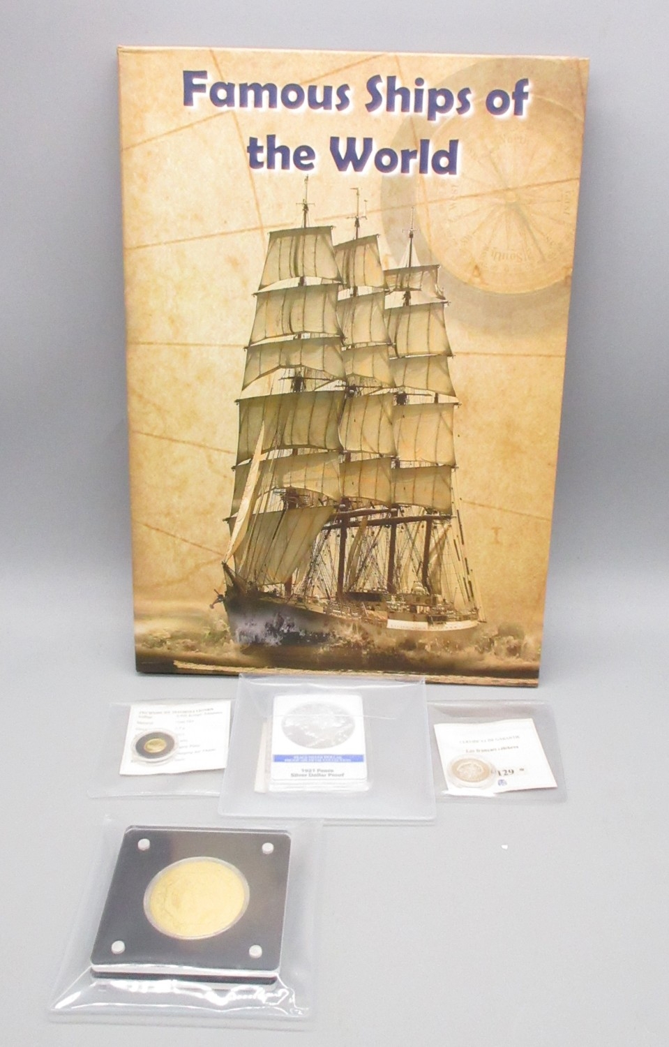 Windsor Mint Famous Ships of the World coin set cont. .585 0.5g coin, a .585 0.5g coin, encapsulated 1921 Peace silver dollar French encapsulated silver coin with COA (3.1g) and 24ct 1/200oz gold coin