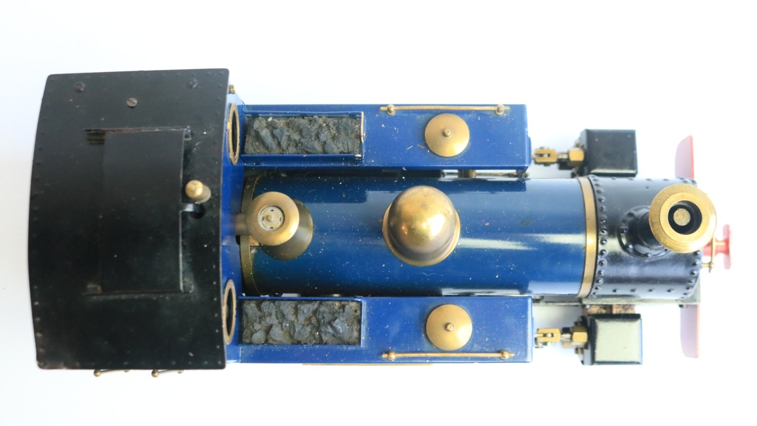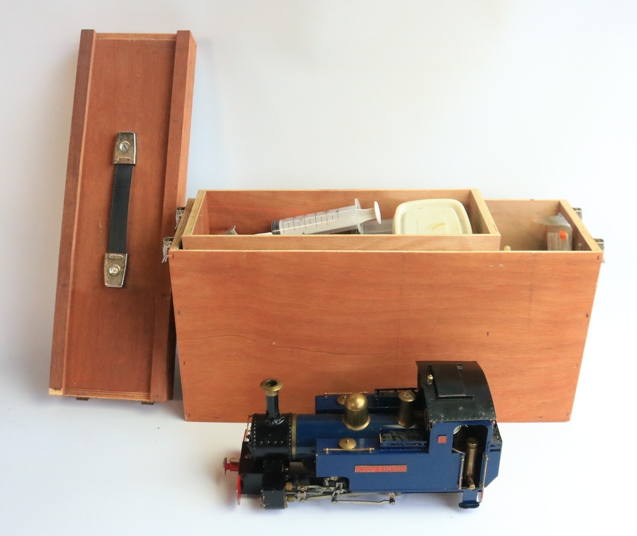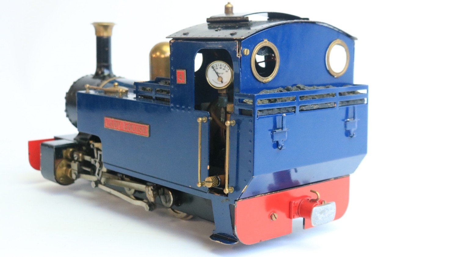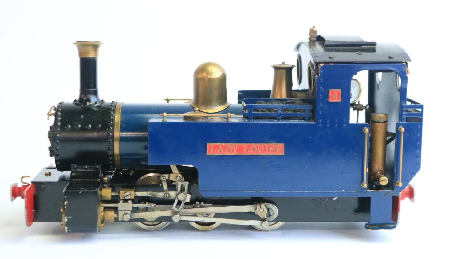 Roundhouse Engineering Co. G gauge gas powered live steam 0-6-0 freelance designed Lady Anne Classic Series "Lady Louise" narrow gauge locomotive model with fitted radio control and a Summerlands Chuffer unit, model in very good overall previously run condition (please refer to photos), overall length 32cm with adjustable wheel spacing (32-45mm) complete with sturdy carry box and various spare parts and tools, not tested but vendor assures all in full working order, also included a Fly Sky 3 channel handheld transmitter