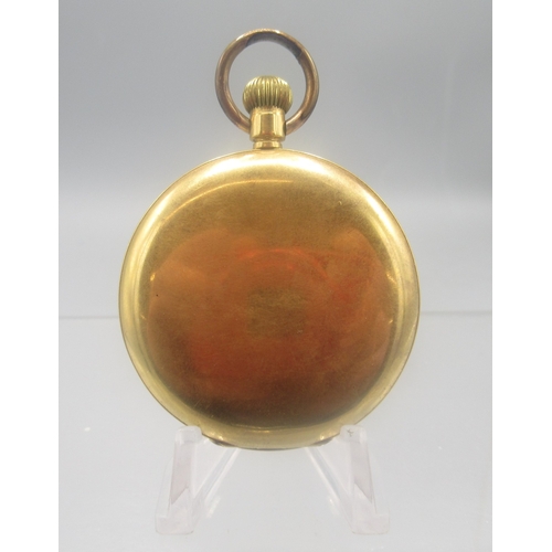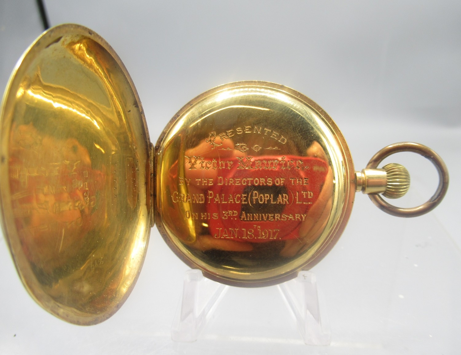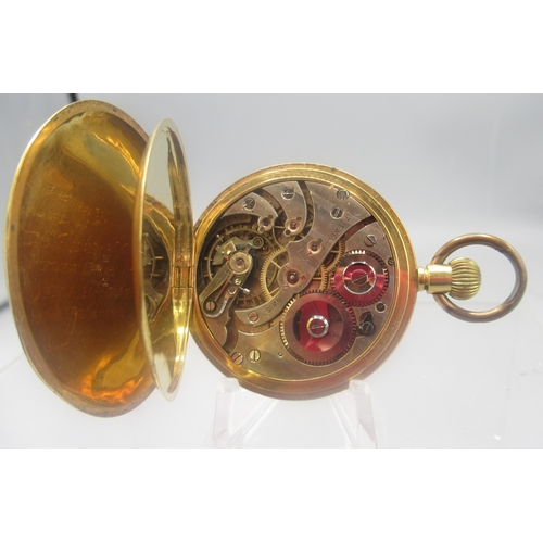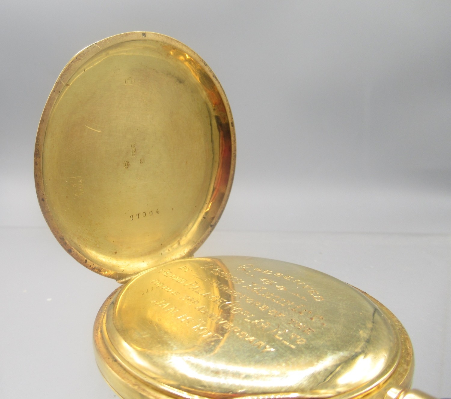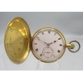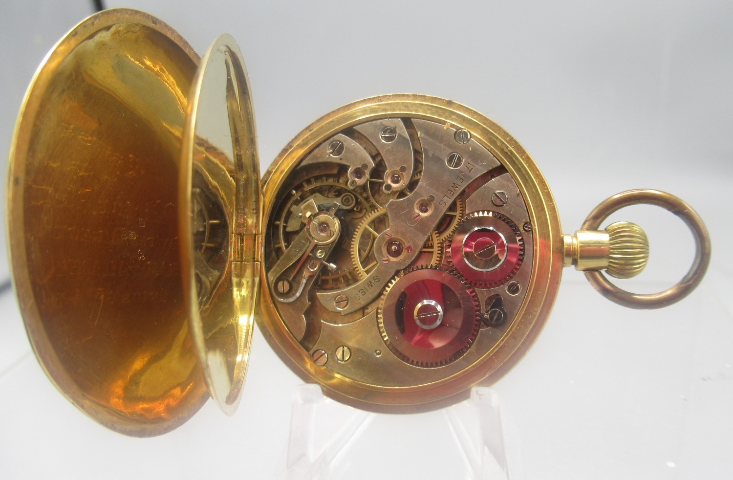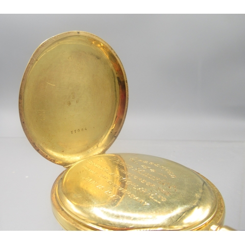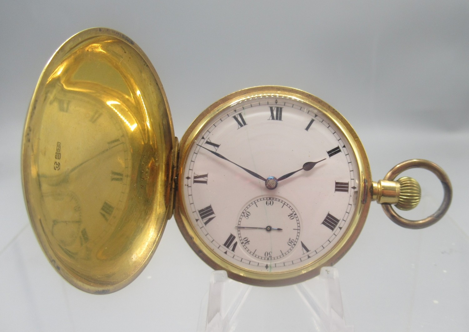 Swiss, presentation 18ct gold keyless hunter pocket watch, white enamel Roman dial with subsidiary seconds, hinged case back and cuvette no. 77004, London Import Mark 1913, Swiss bridge plate 17 jewel movement, gross weight 81.6g, D49.2mm