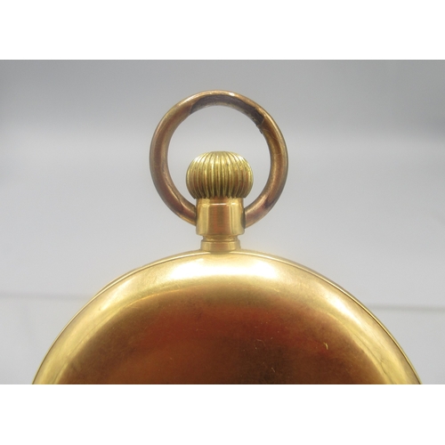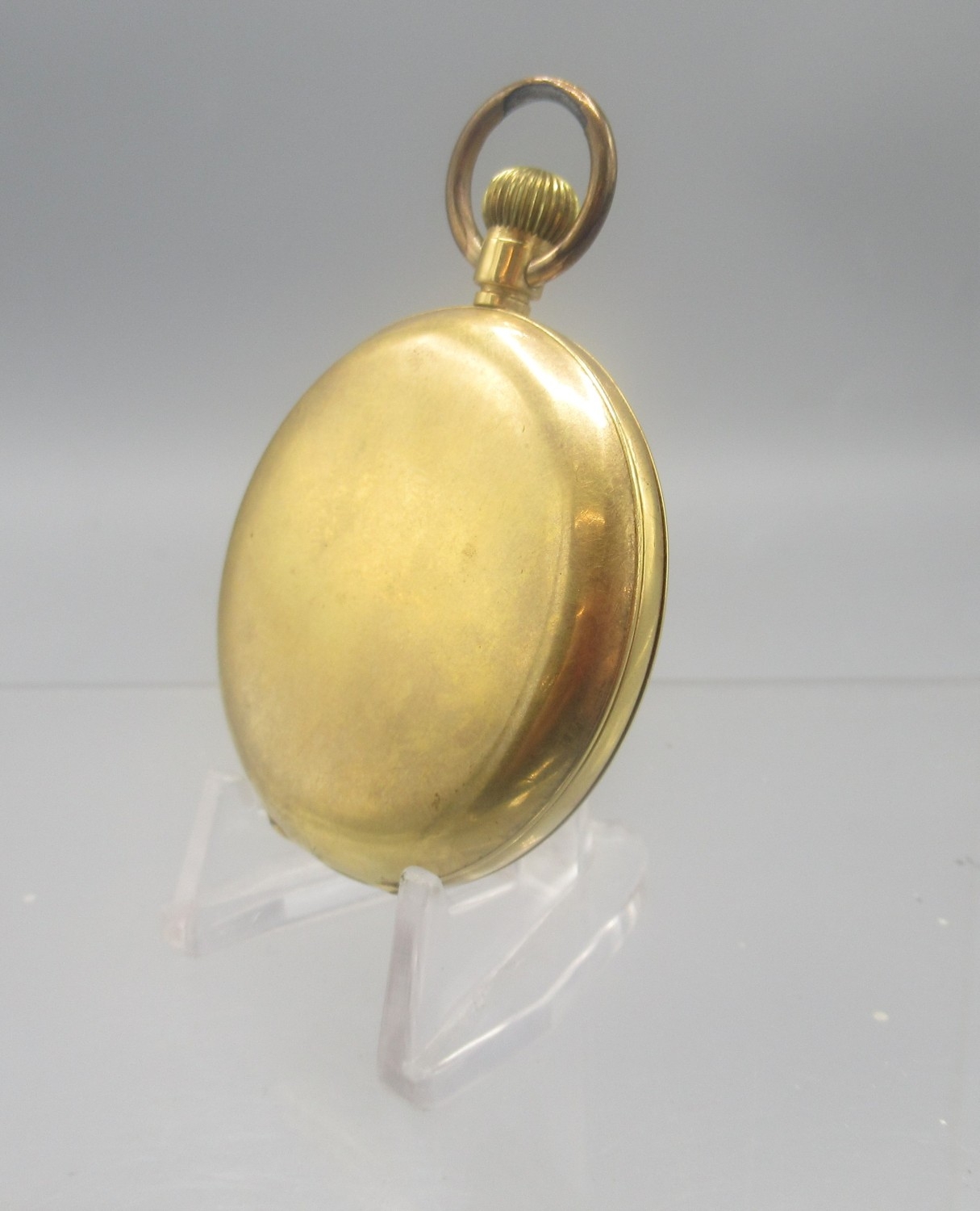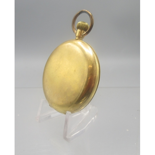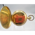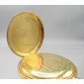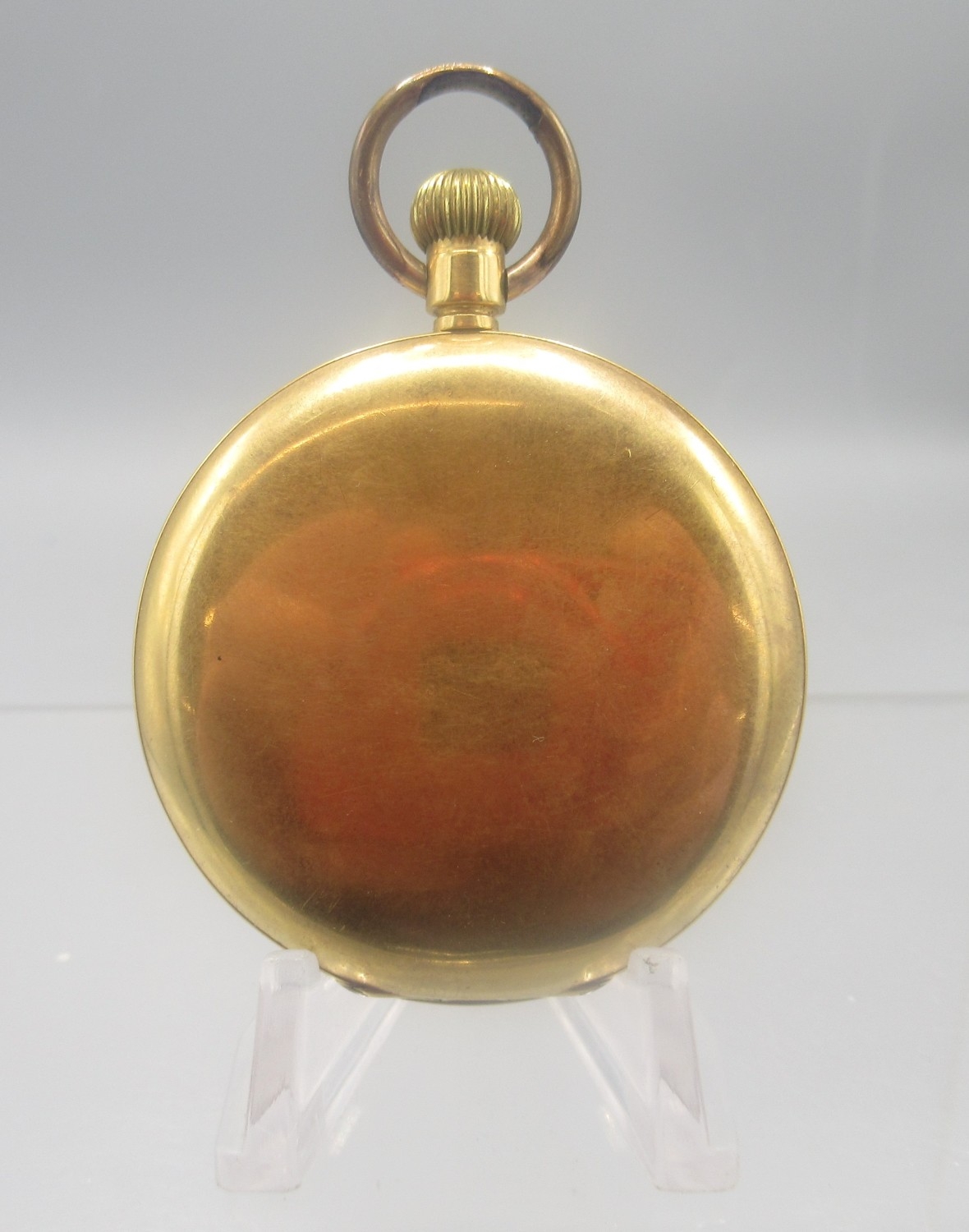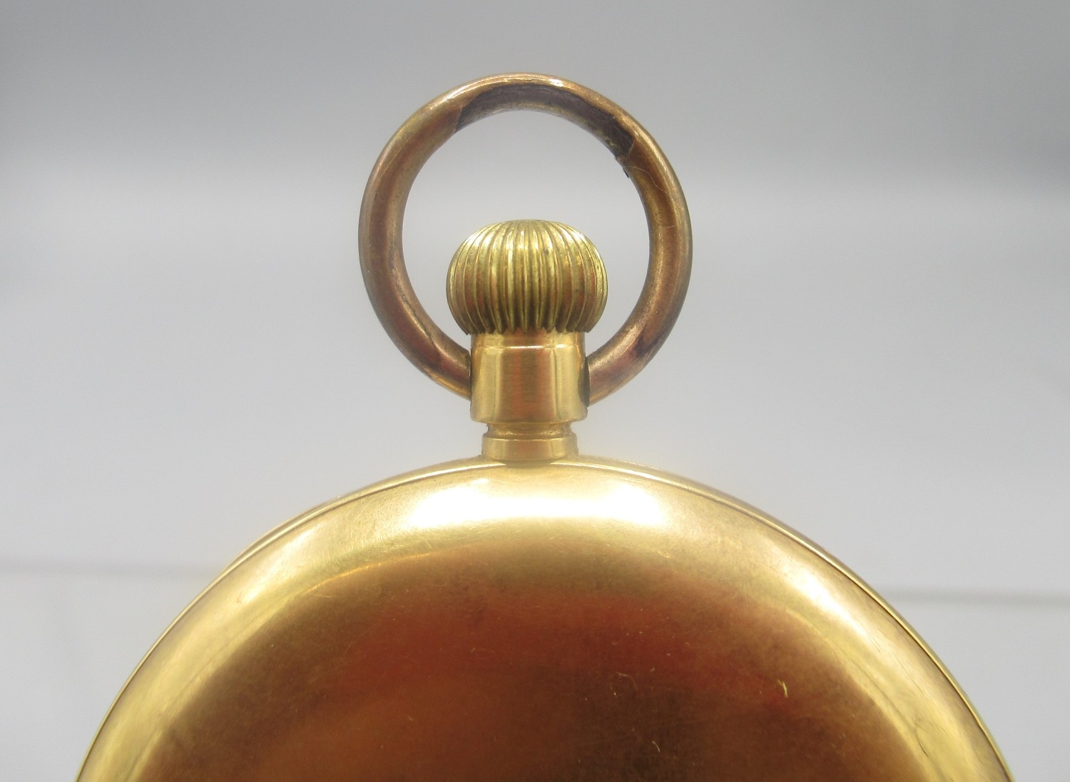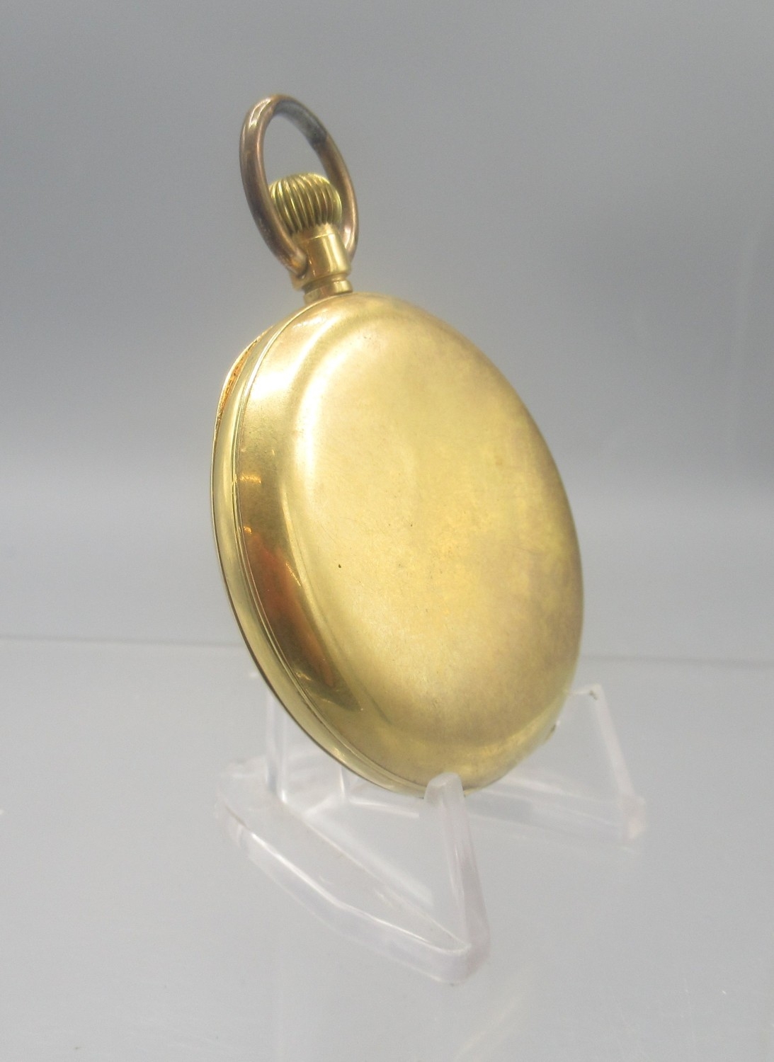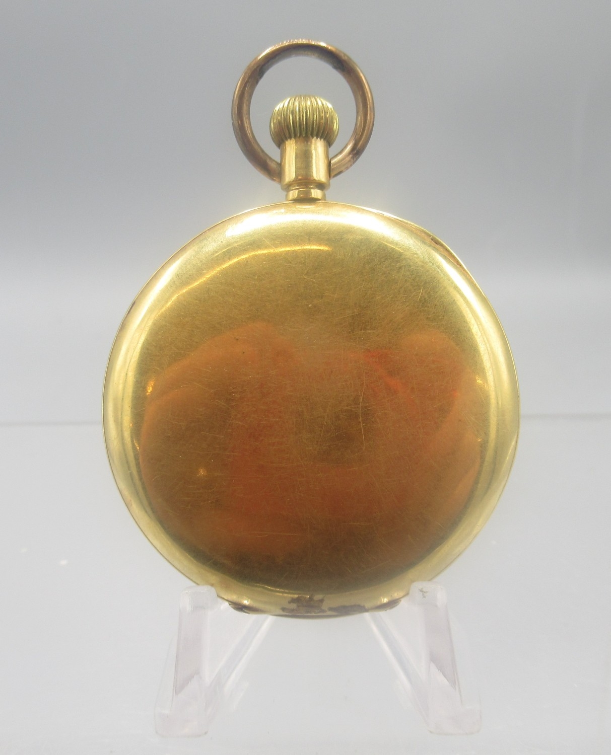 Swiss, presentation 18ct gold keyless hunter pocket watch, white enamel Roman dial with subsidiary seconds, hinged case back and cuvette no. 77004, London Import Mark 1913, Swiss bridge plate 17 jewel movement, gross weight 81.6g, D49.2mm