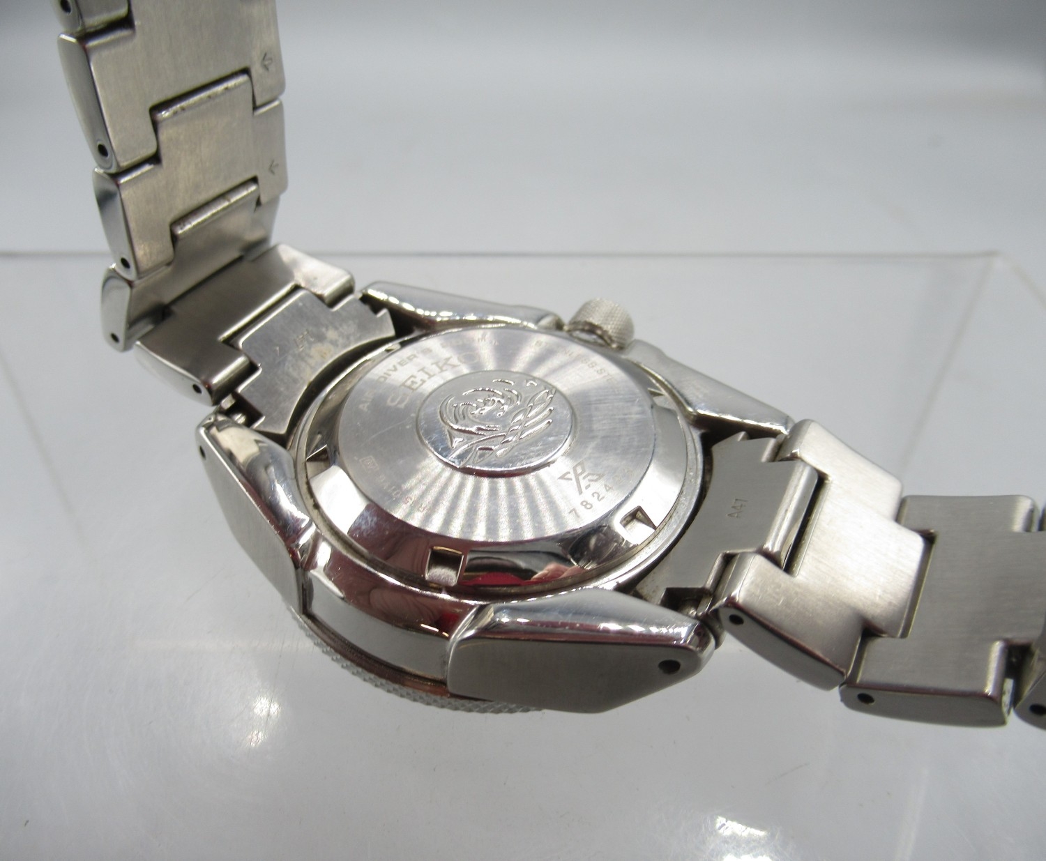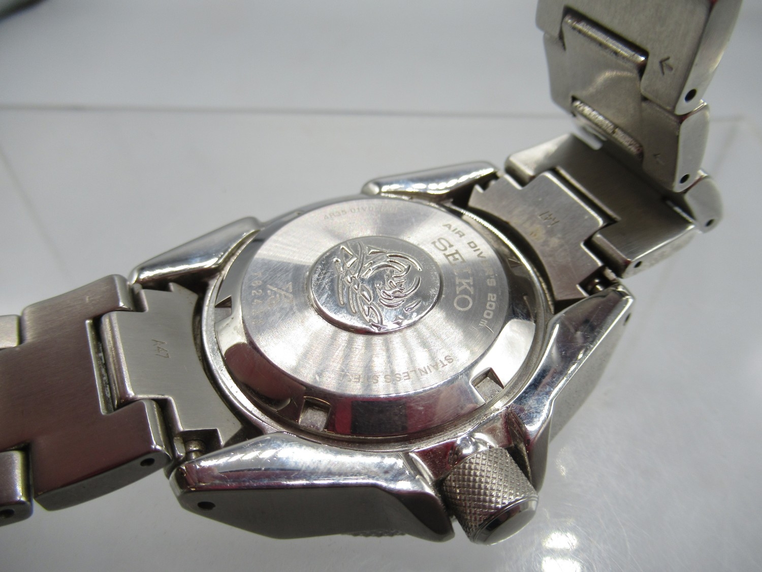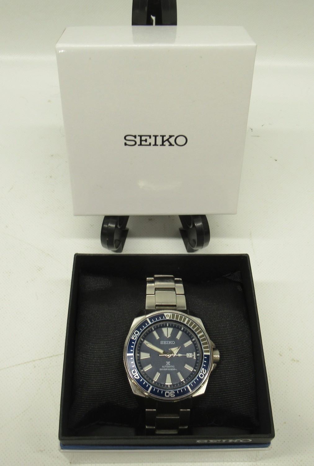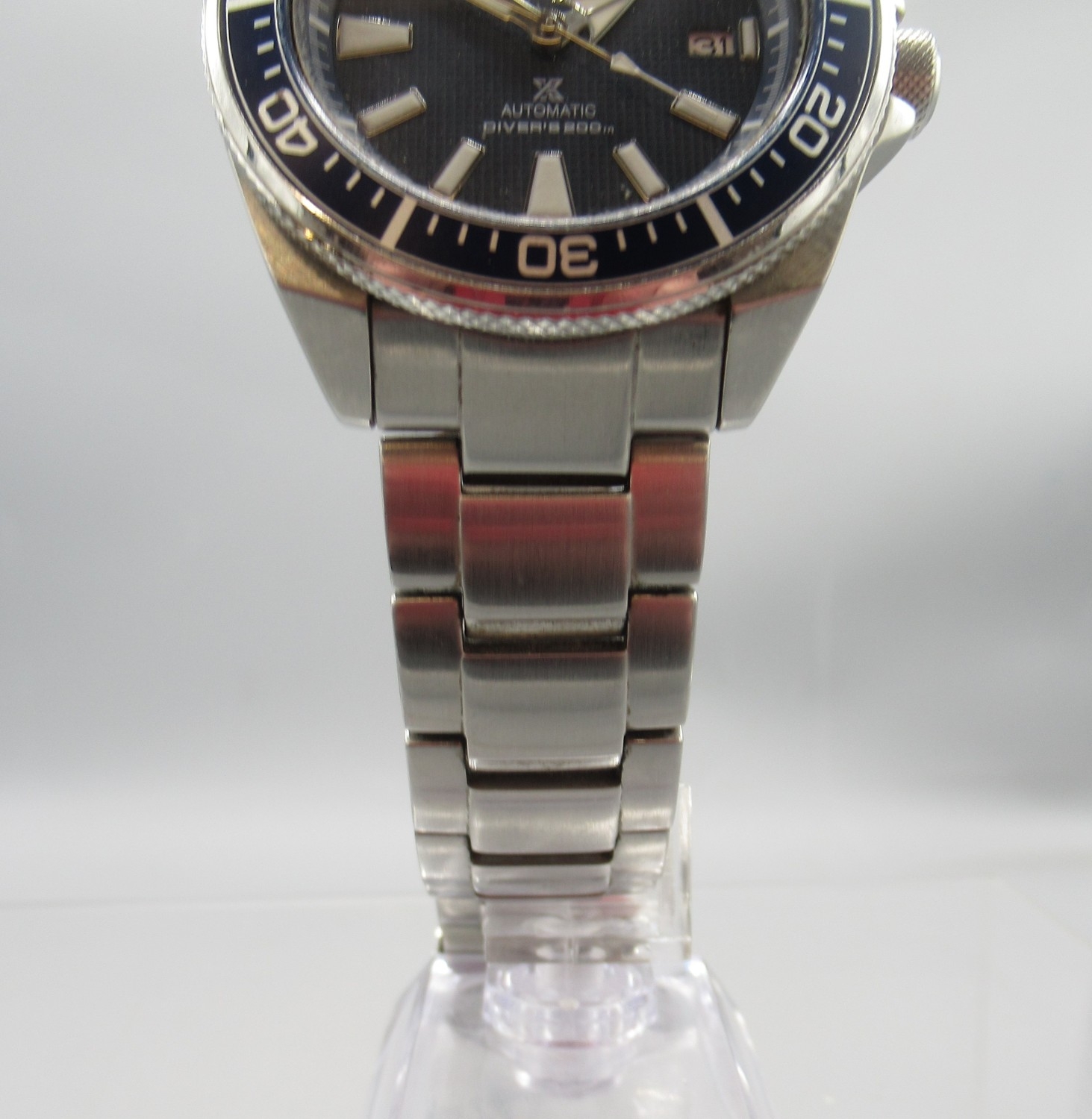 Seiko Prospex Samurai 200m stainless steel air dive automatic wristwatch with date on original bracelet with signed clasp, signed blue waffle texture dial with baton indices and centre seconds, signed screw on case back ref. 4R35-01V0, no. 782423, D44.4mm with associated box