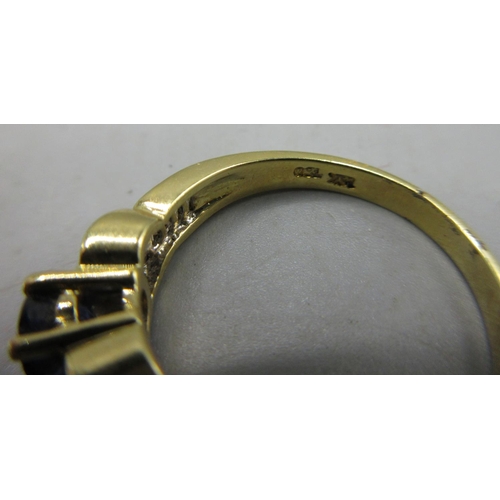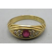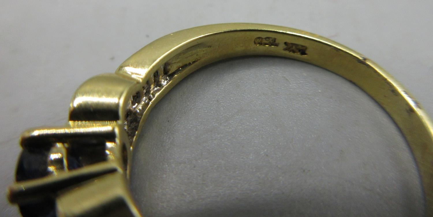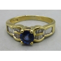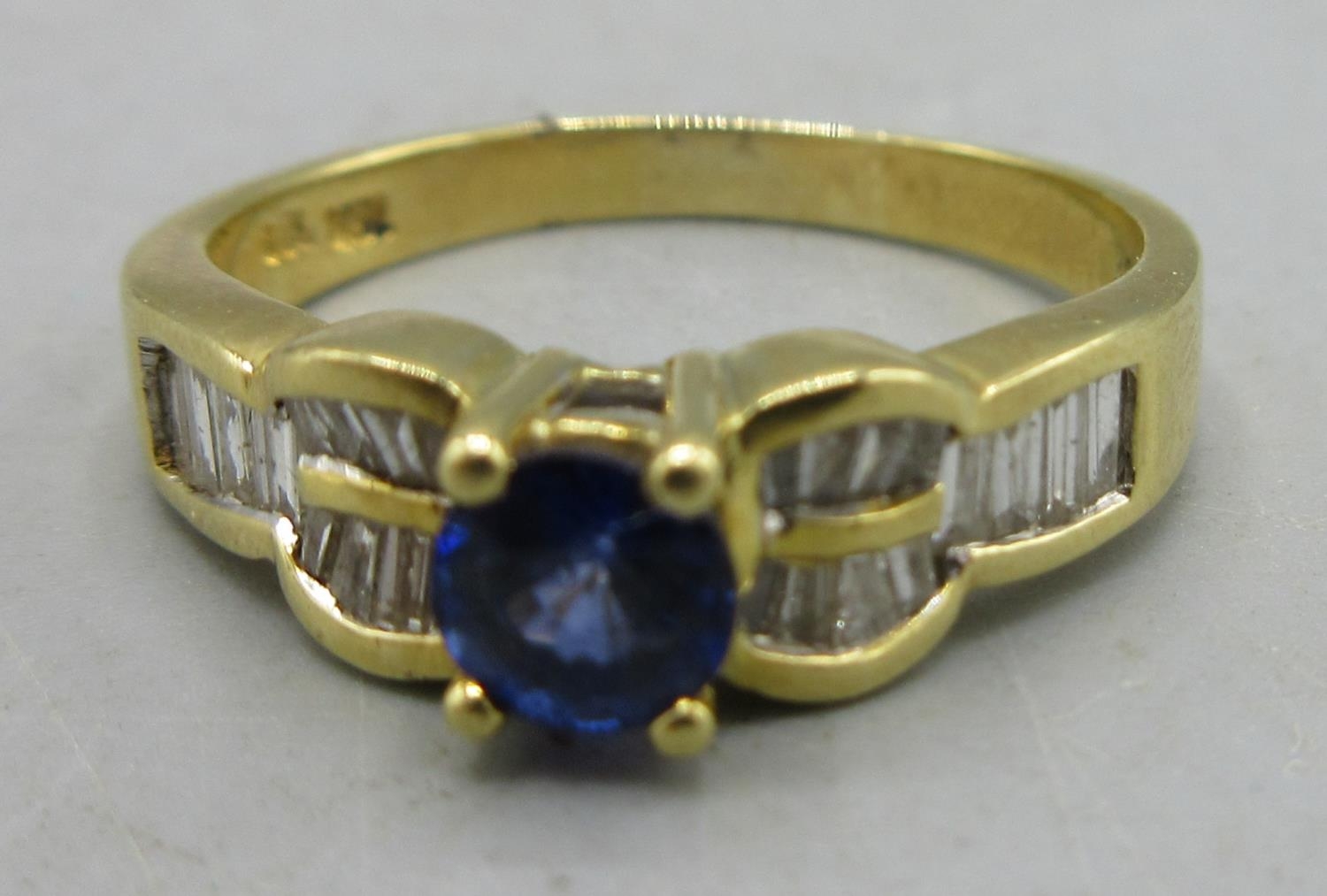 18ct yellow gold ring set with round cut sapphire on diamond set shoulders, stamped 750, size R, 4.66g
