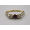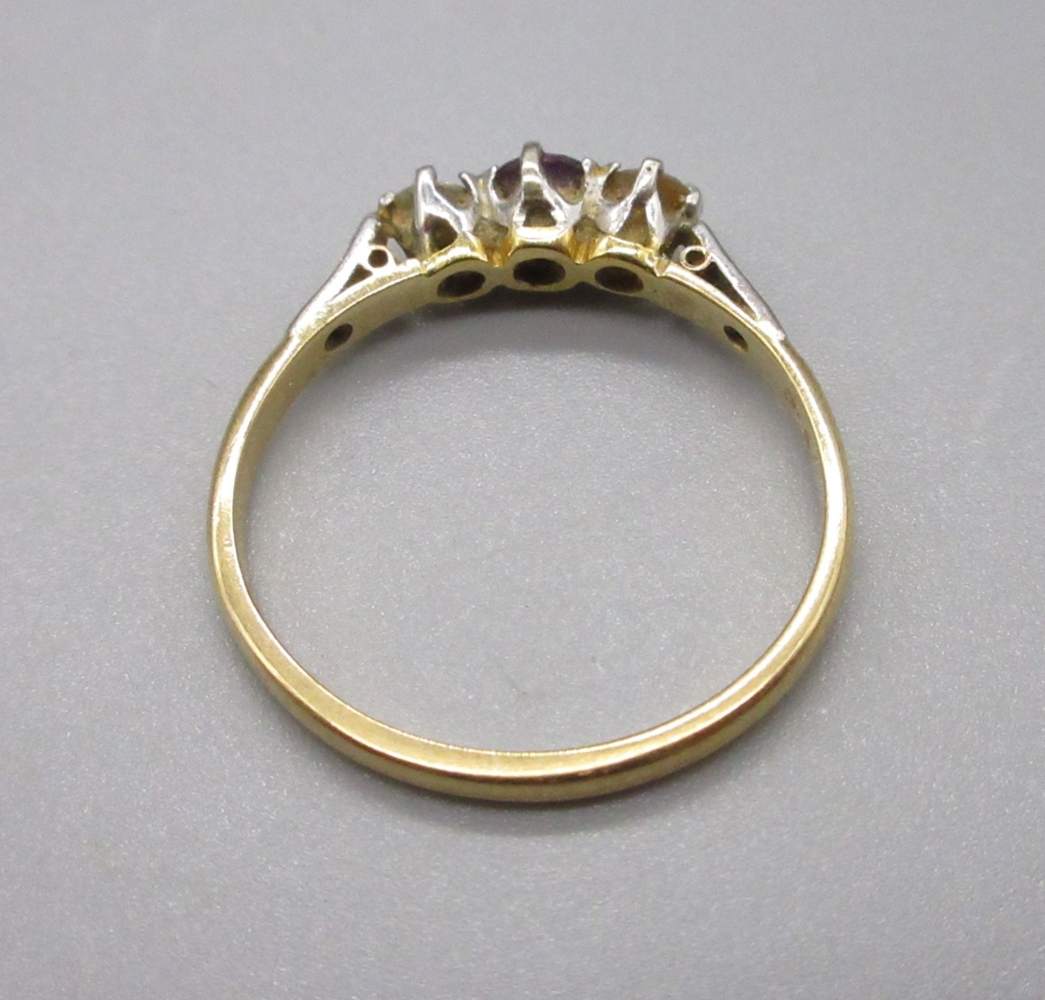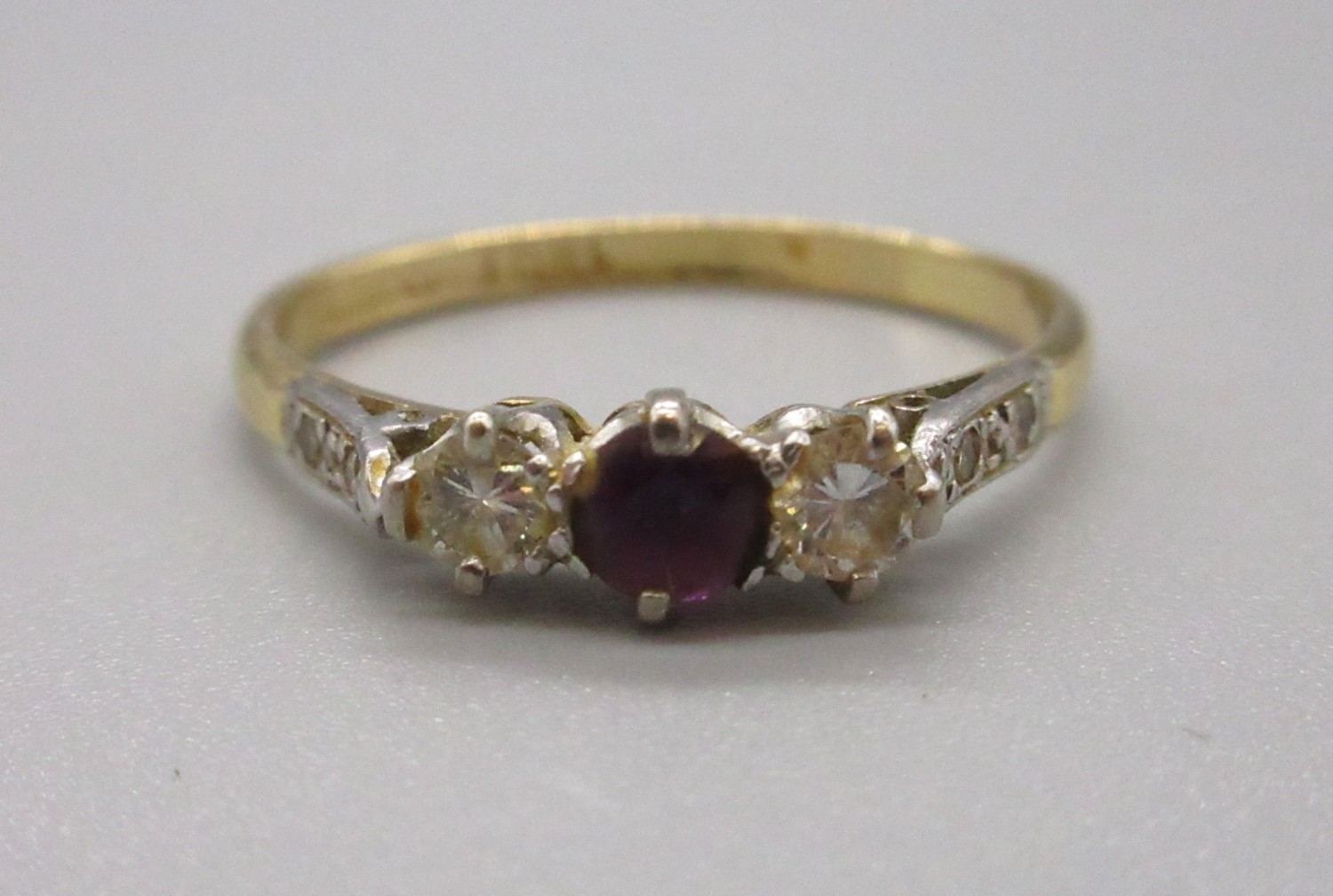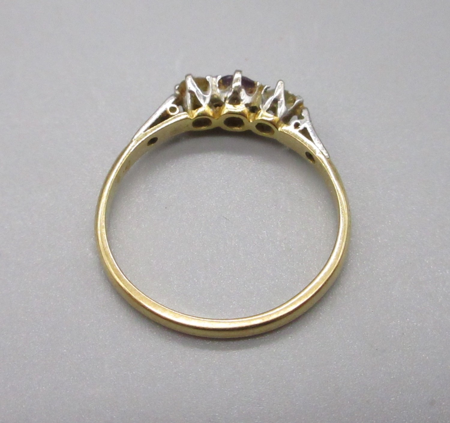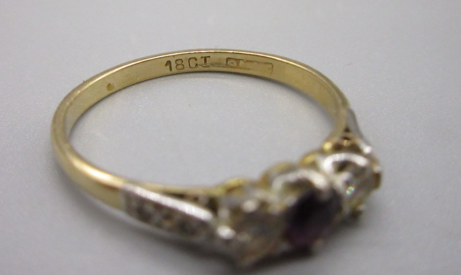 18ct and platinum stamped amethyst and diamond ring, size O (2.1g)