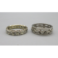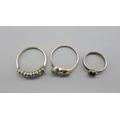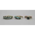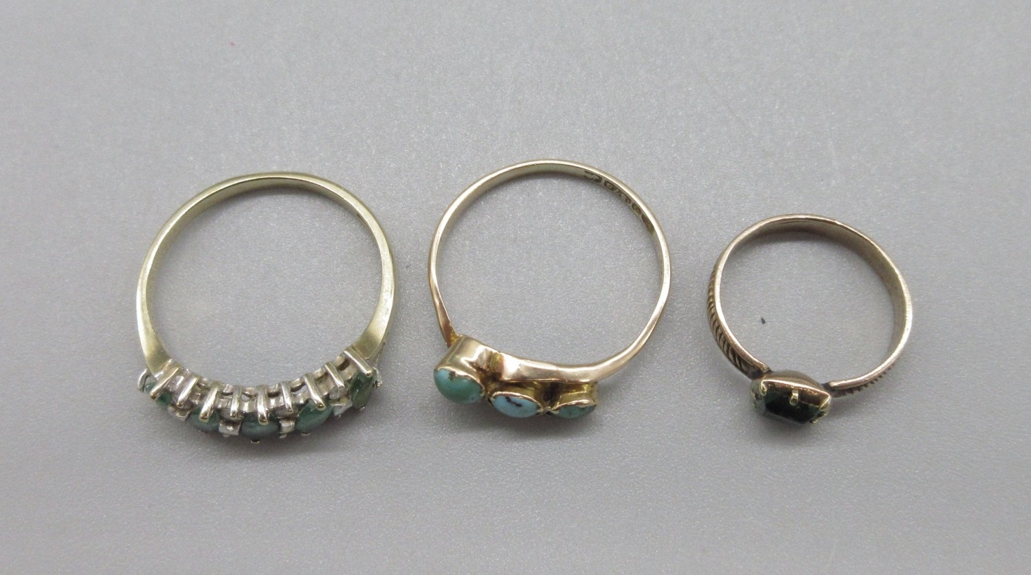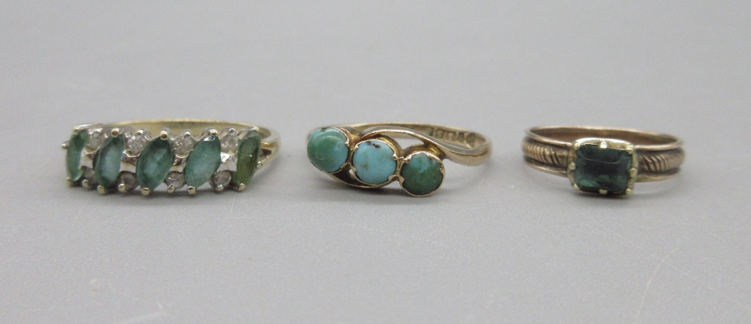 9ct yellow gold ring set with turquoise, stamped 375, size M, 9ct yellow gold ring set with marquise cut emeralds and diamonds, stamped 375, size N, 3.3g, unmarked rose tone metal ring set with emerald, size D, 1.0g