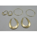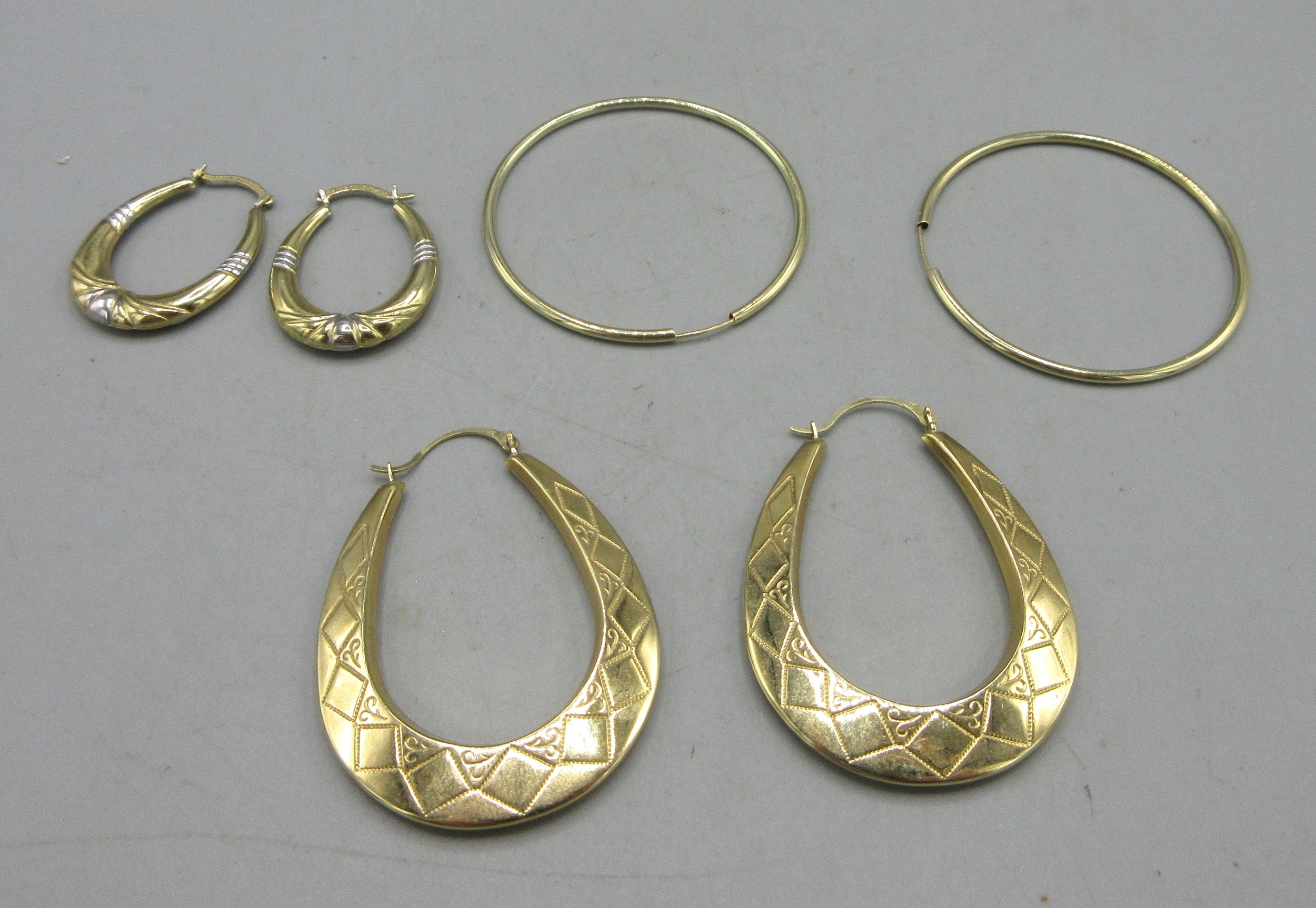 Two pairs of 9ct yellow gold large hoop earrings, both stamped 375, and a pair of silver and gold hoops, stamped silv 9ct, gross 5.44g