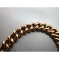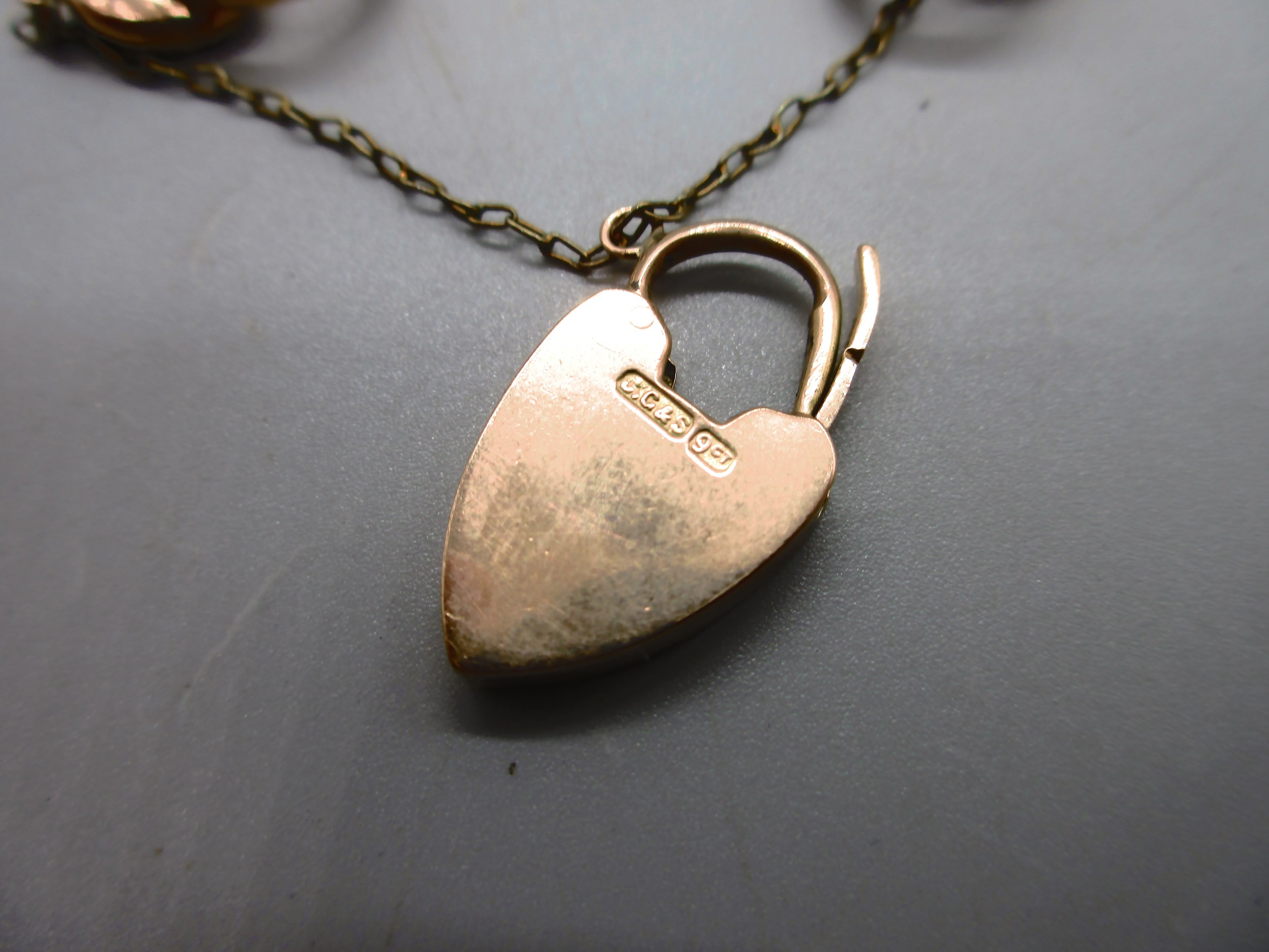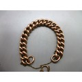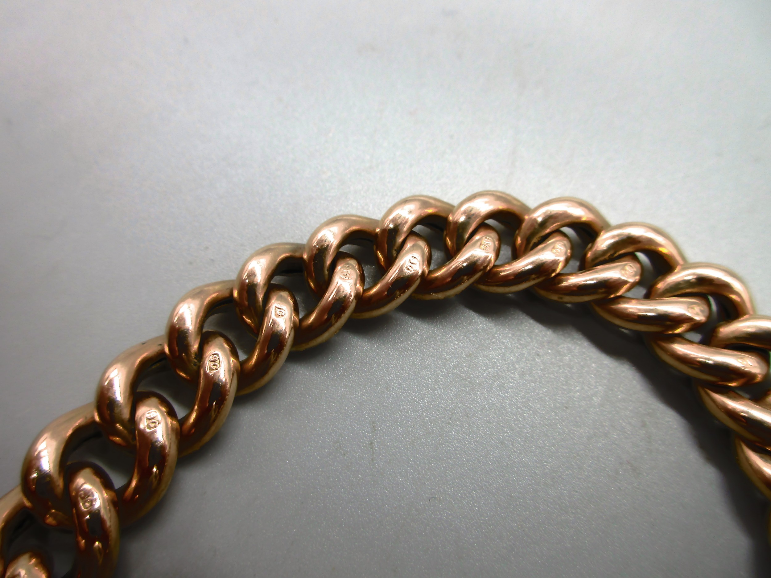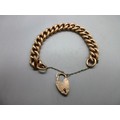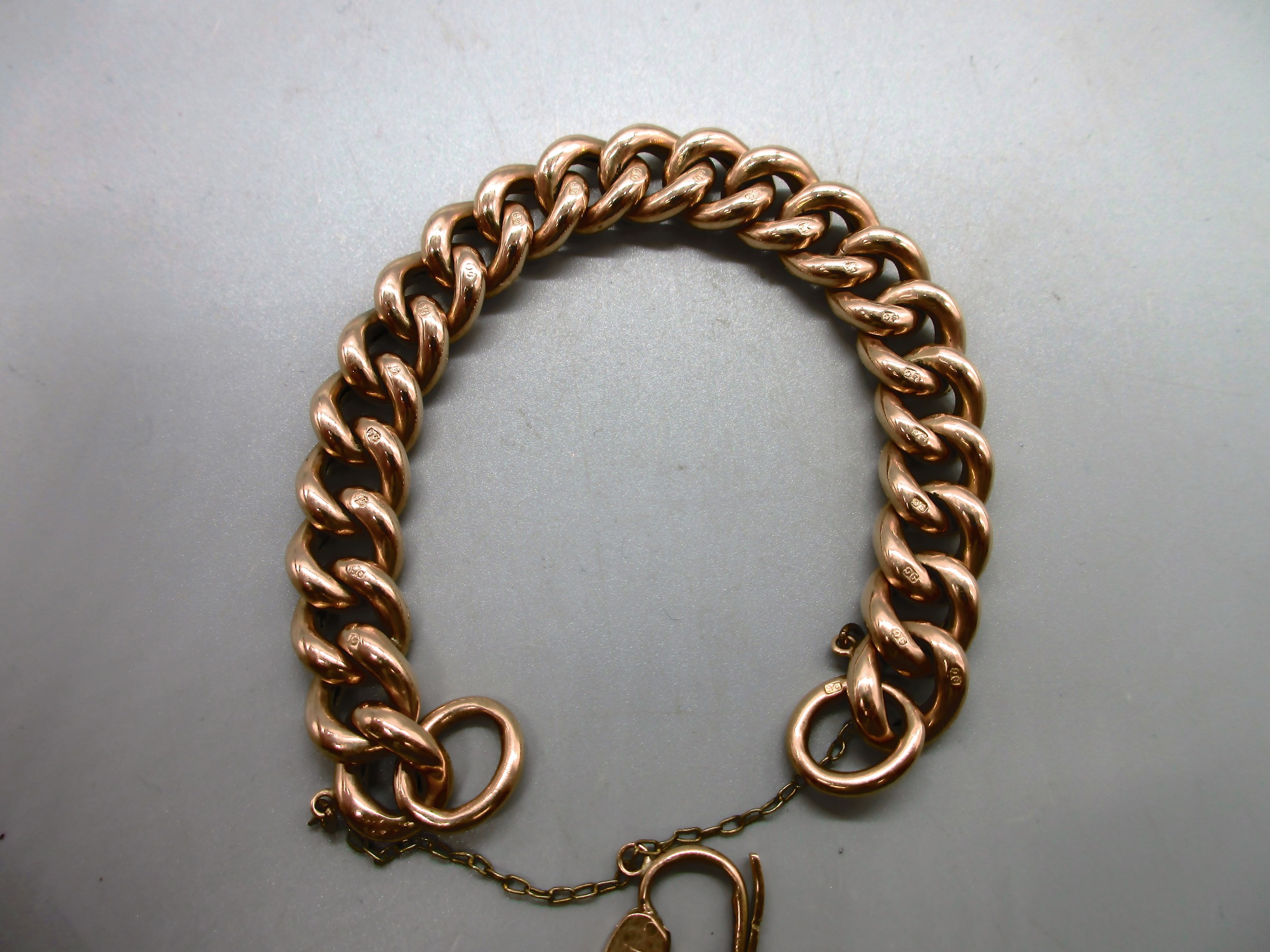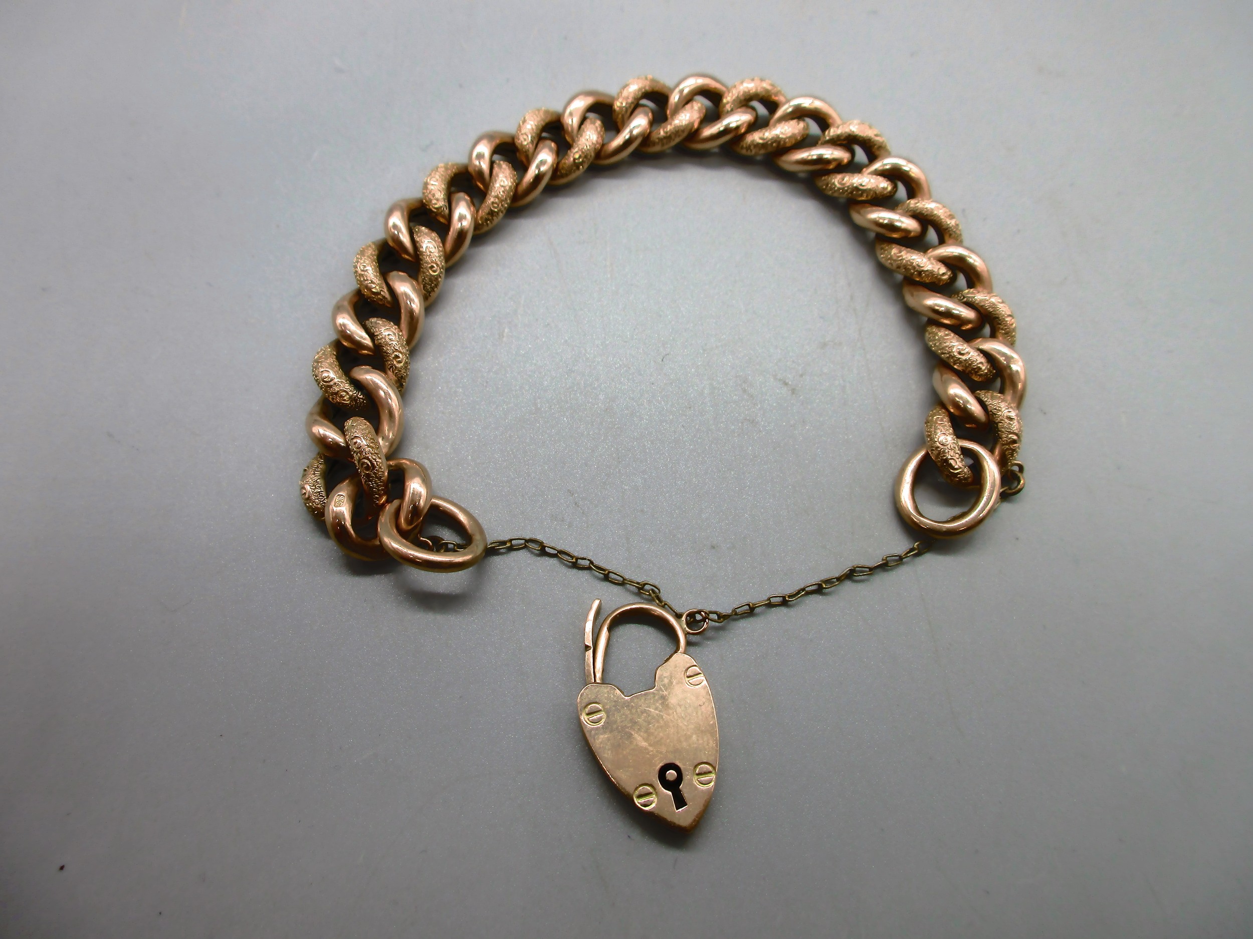 Hallmarked 9ct yellow gold curb chain bracelet with engraved links and padlock style clasp with safety chain, each link is individually stamped 9k, weight 26.9g