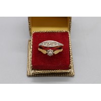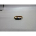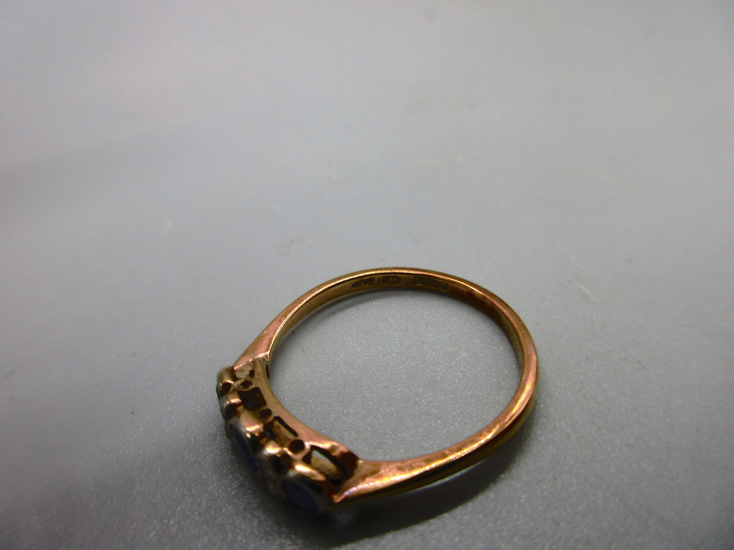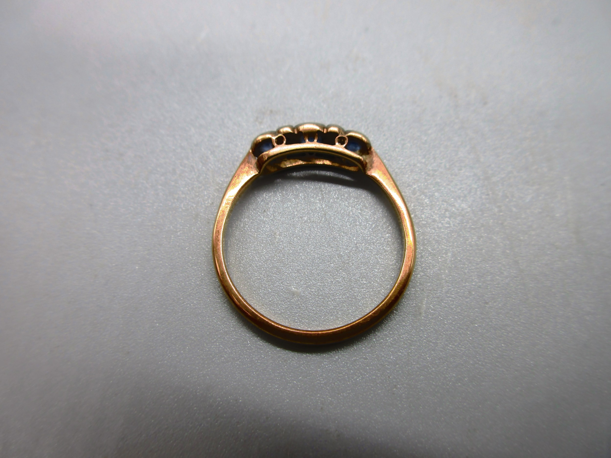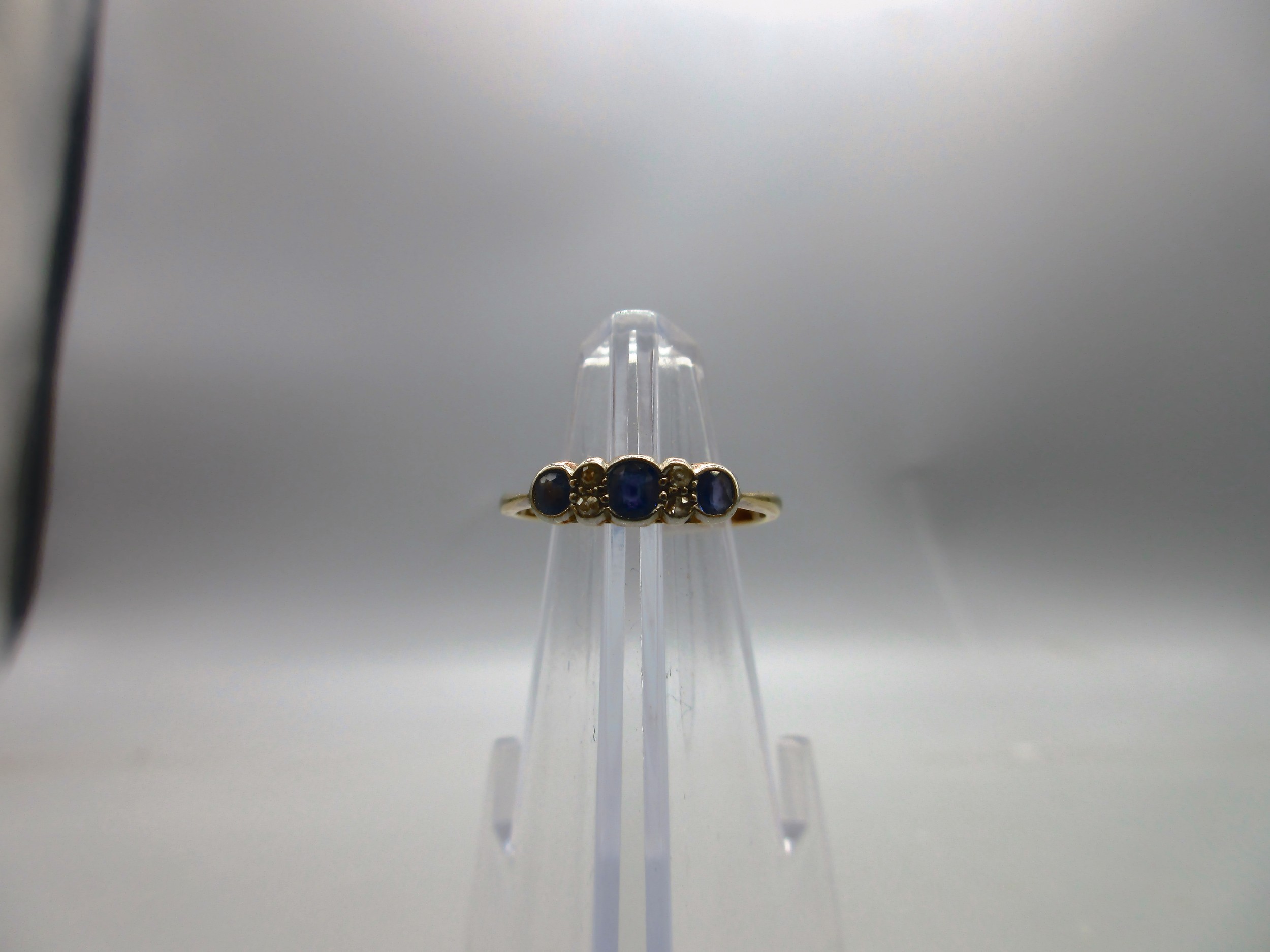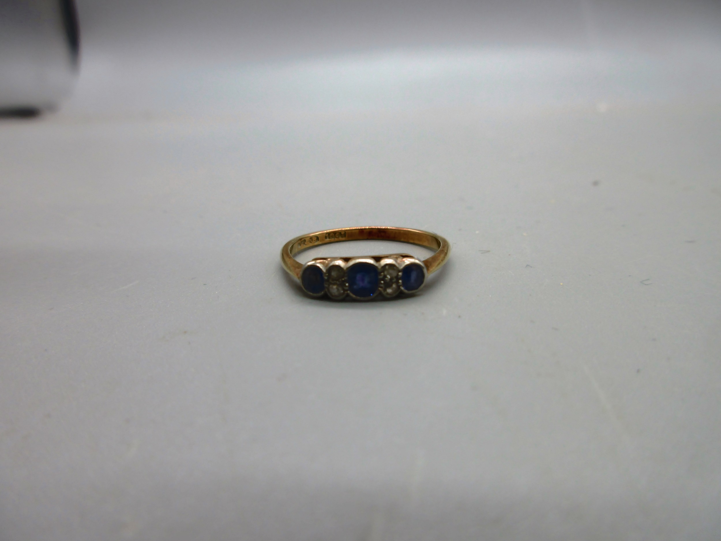 18ct yellow gold sapphire and diamond bezel-set trilogy ring, comprising three pale blue sapphire stones separated by four diamonds, ring size P, weight 2.12g