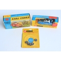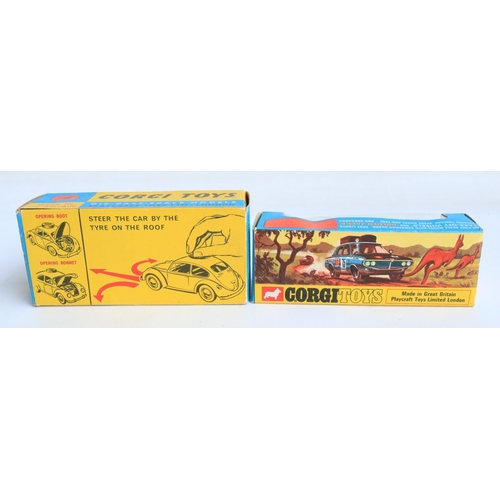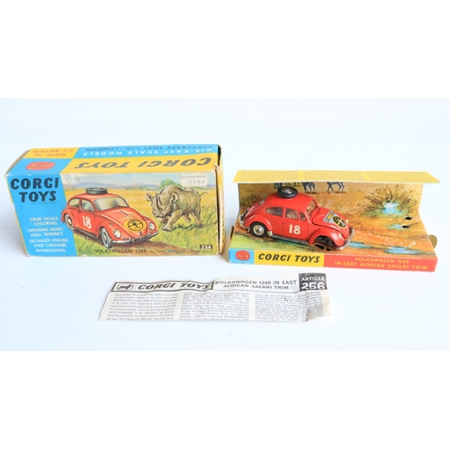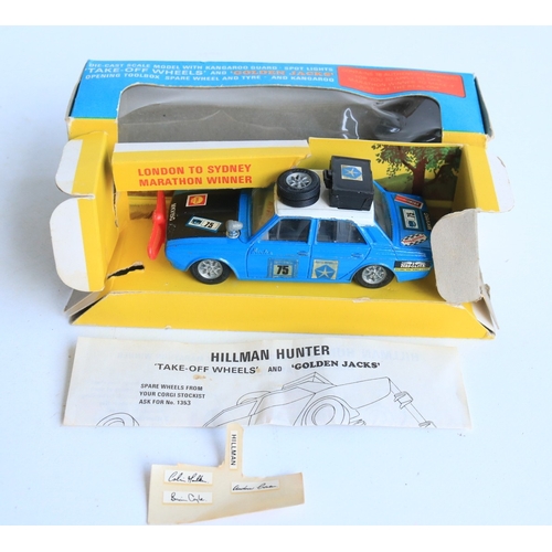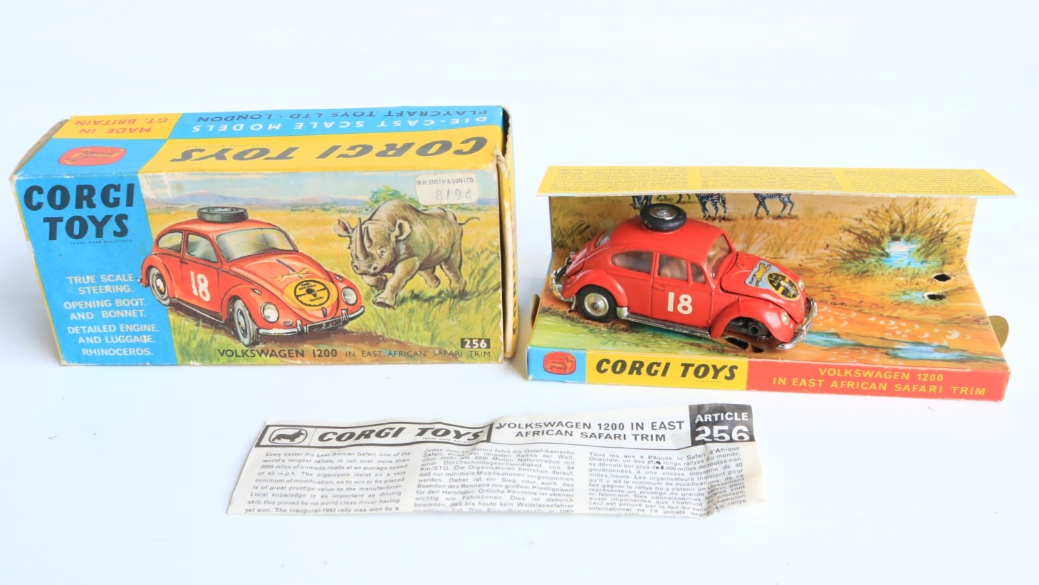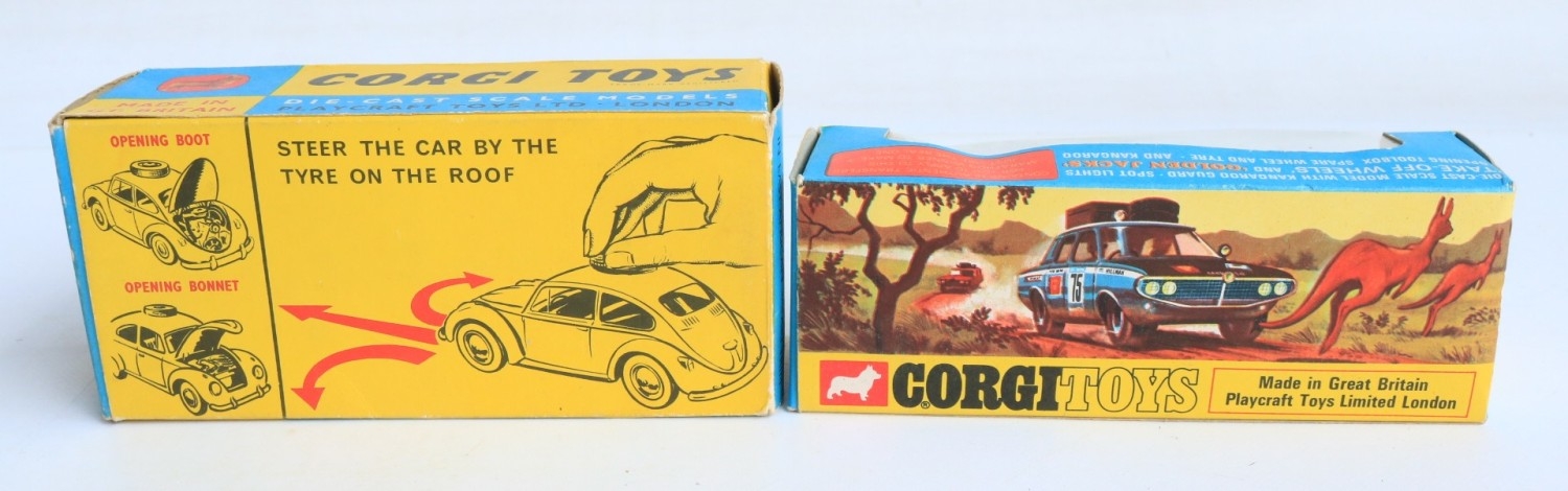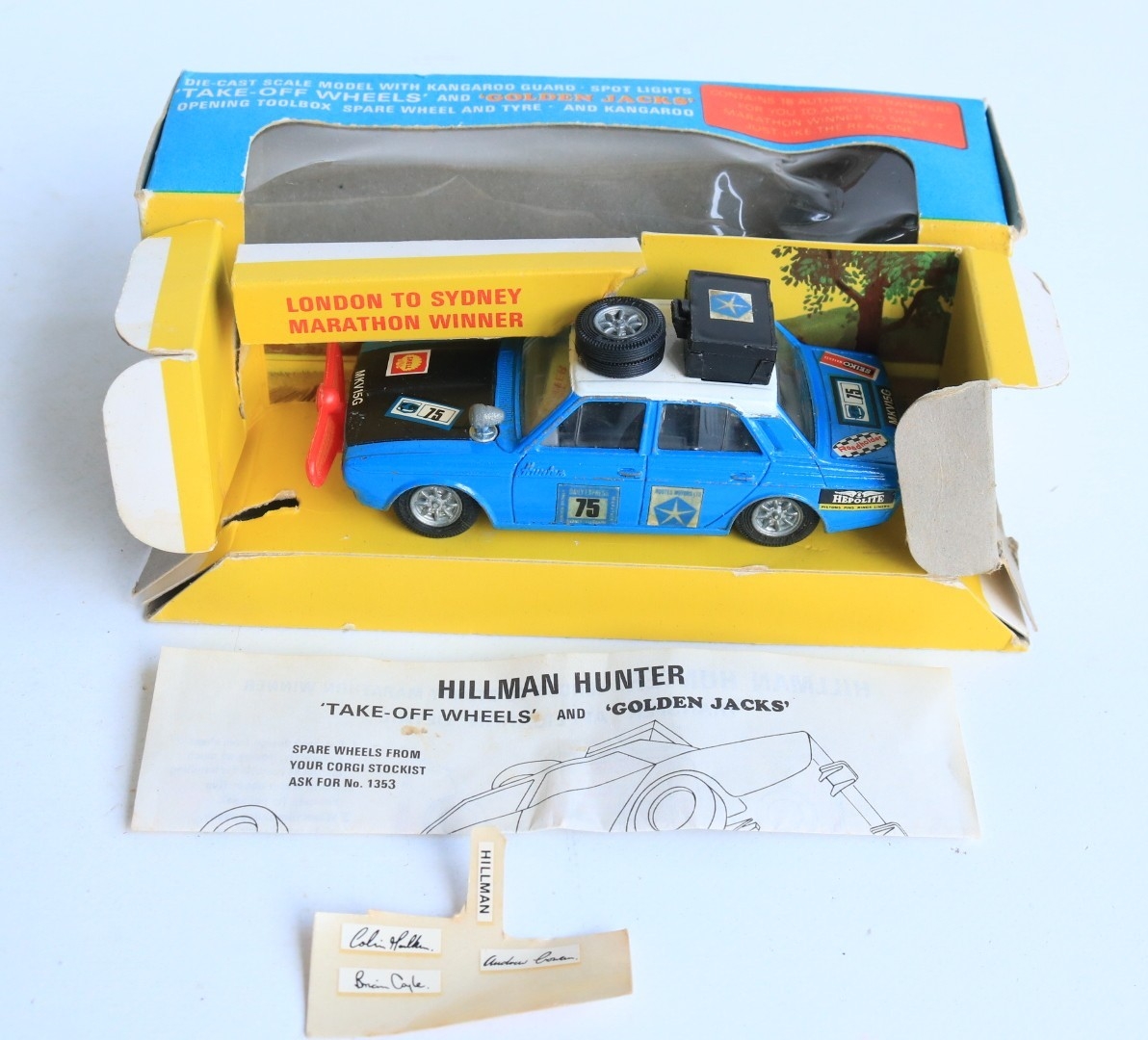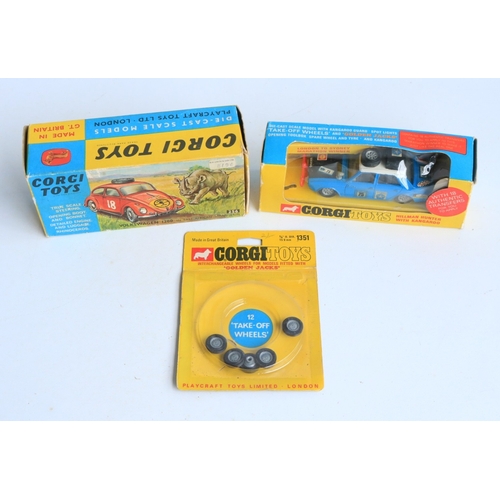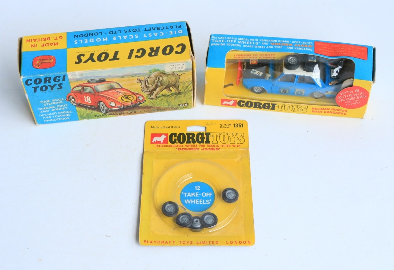 Vintage Corgi Toys 302 Hillman Hunter London to Sydney Marathon Winner (model in good condition for age with playwear, some paint chipping etc, box good with storage wear and creasing of clear plastic viewing panel, missing Kangaroo) and 256 VW 1200 East African Safari (model good but missing front right side wheel, steering function in working order, inner box tray excellent, outer box good with storage wear, missing Rhino), both models with original instruction sheets, also included an incomplete Corgi 'Golden Jacks' wheel set with 5 wheels and good condition packaging (3)