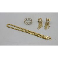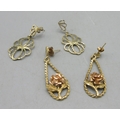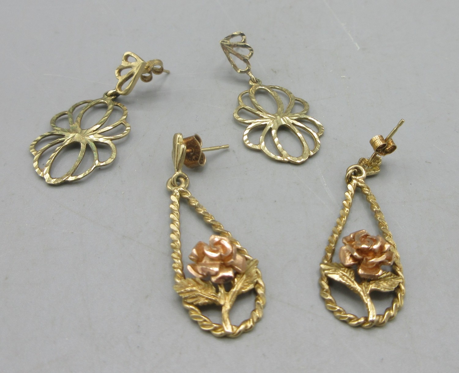Pair of 9ct yellow gold multi tone floral drop stud earrings, and another pair of 9ct yellow gold cut out drop earrings, one missing back, stamped 375, 5.79g