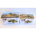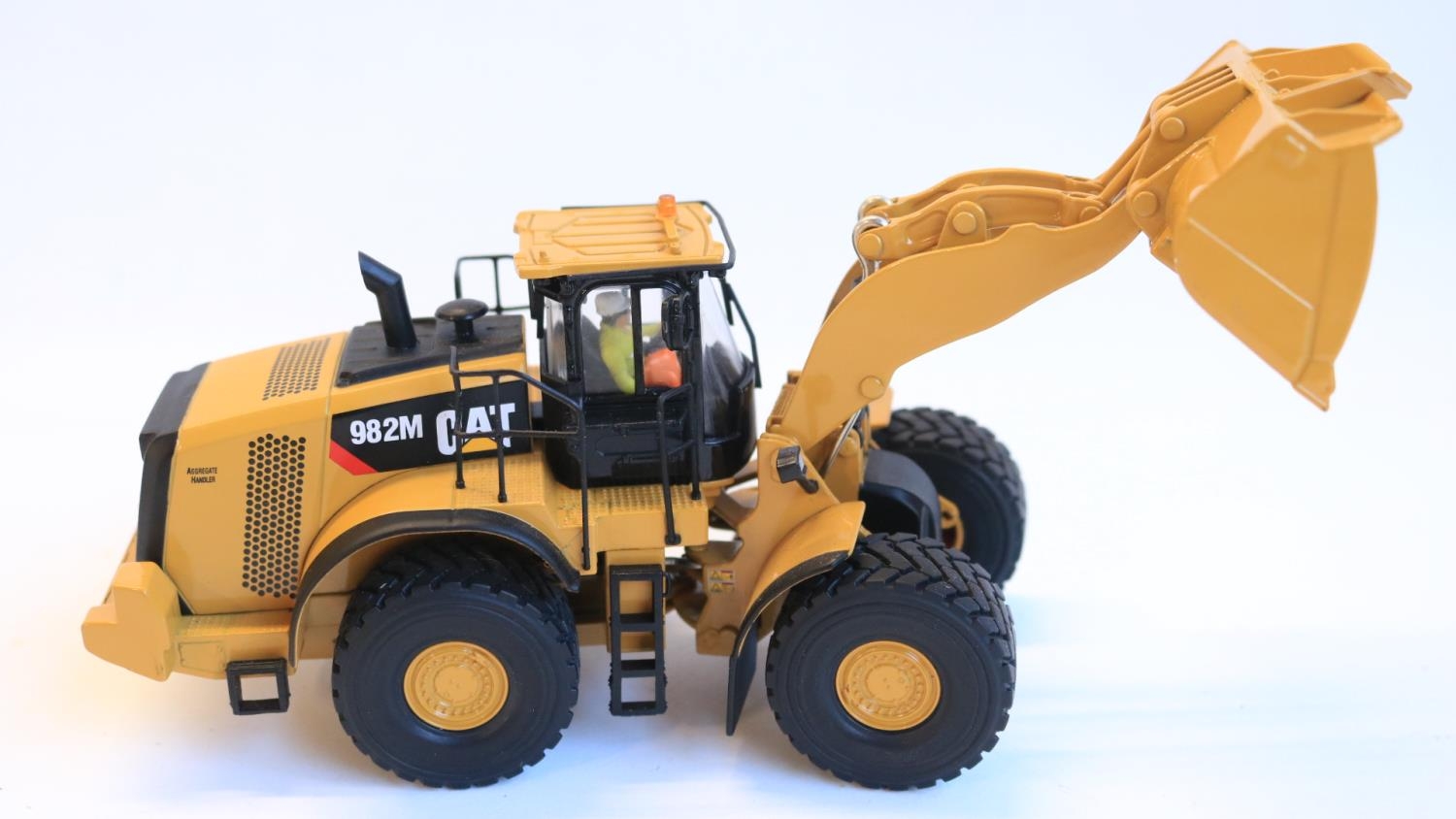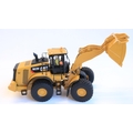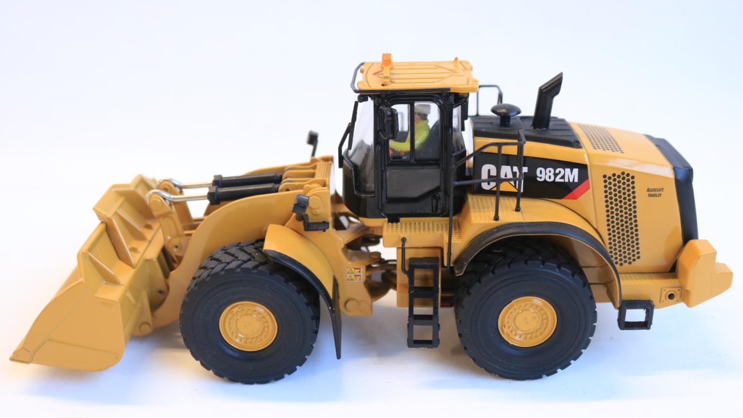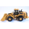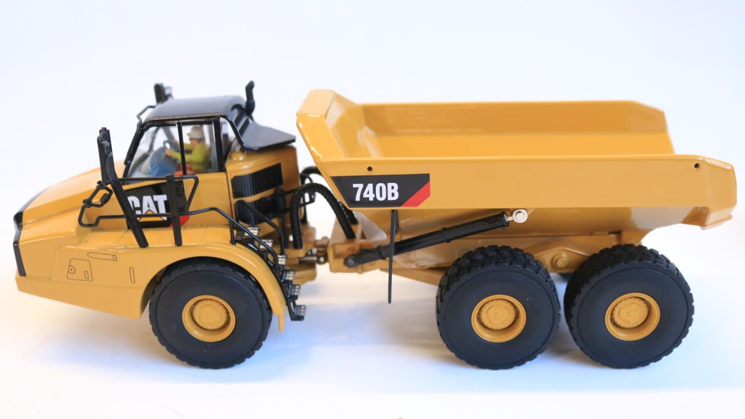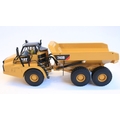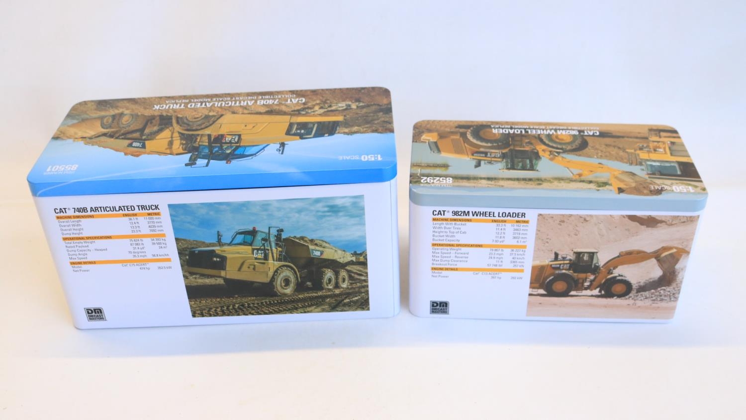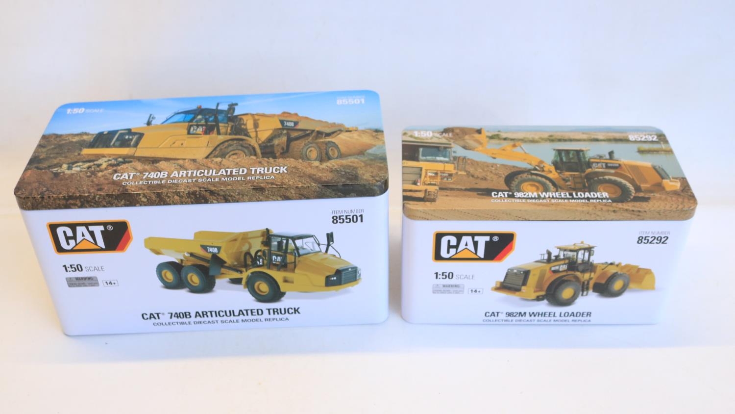 Two well detailed 1/50 scale diecast CAT plant machinery vehicle models from Diecast Masters to include 85292 982M Wheel Loader and 85501 740B Articulated Truck (with fixed cab and bonnet), both models with plastic handrails and fixed driver figures, both in at least near mint condition complete with attractive and excellent condition sturdy metal tins