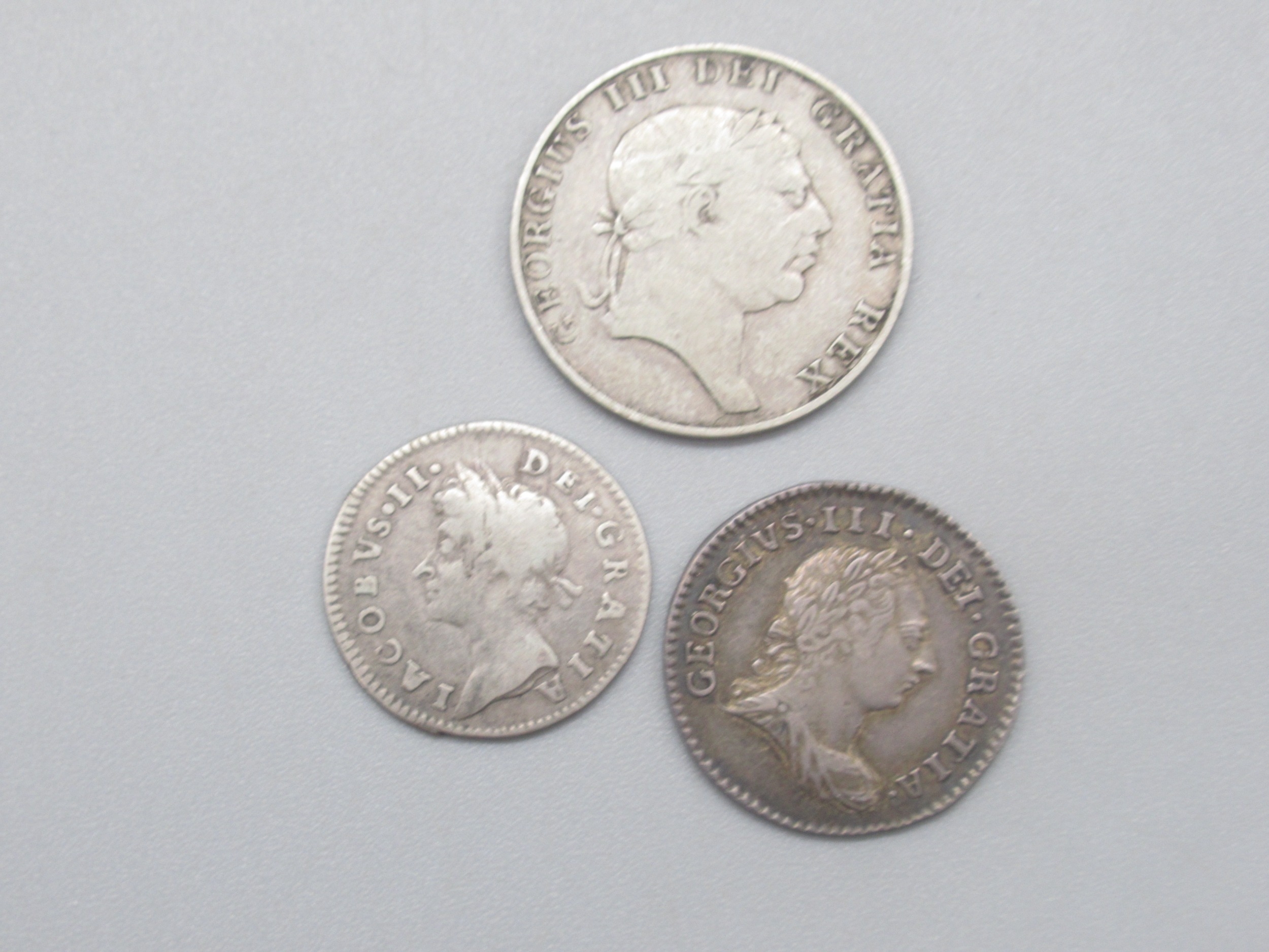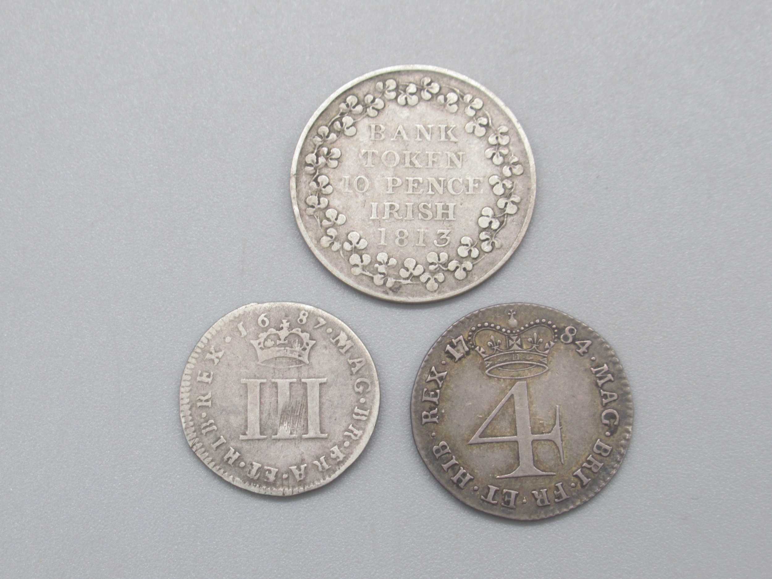 George III 1813 Bank Token 10 Pence Irish, 1784 George III 4 pence & 1687 James II 3 pence