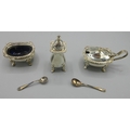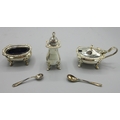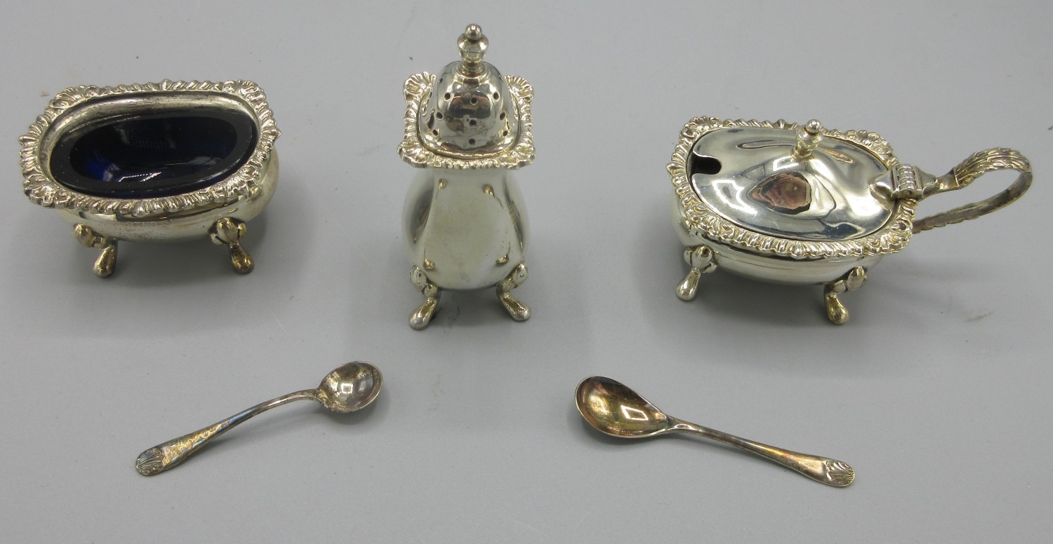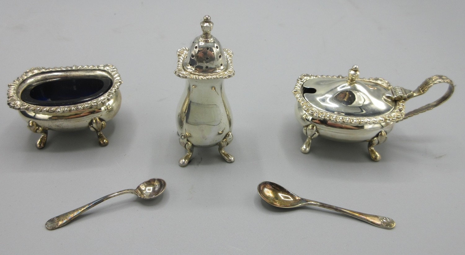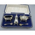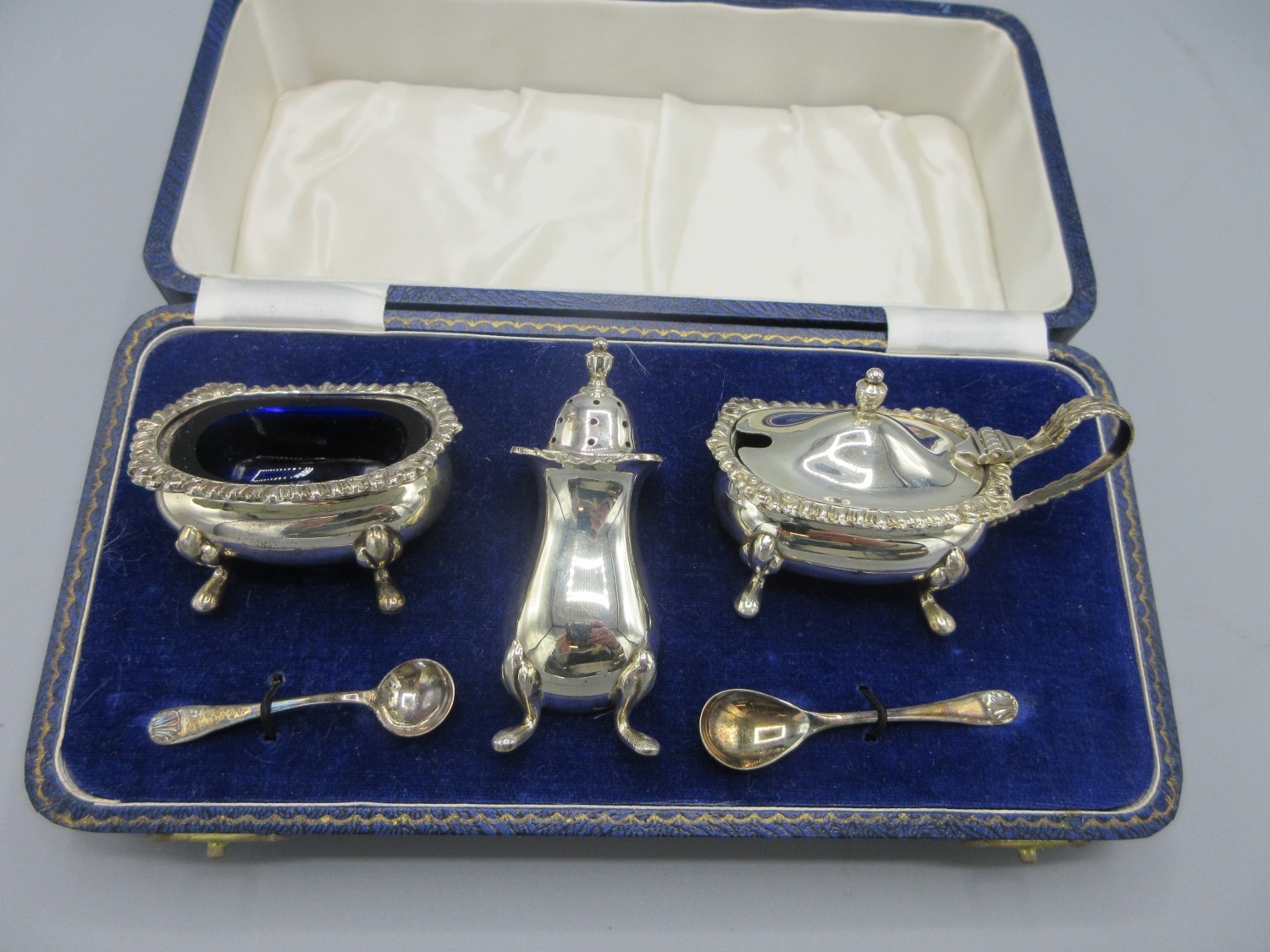 Hallmarked Sterling silver glass lined cruet set including salt, pepper and mustard, by S J Rose & Son, Birmingham, 1967, 4.54ozt, boxed