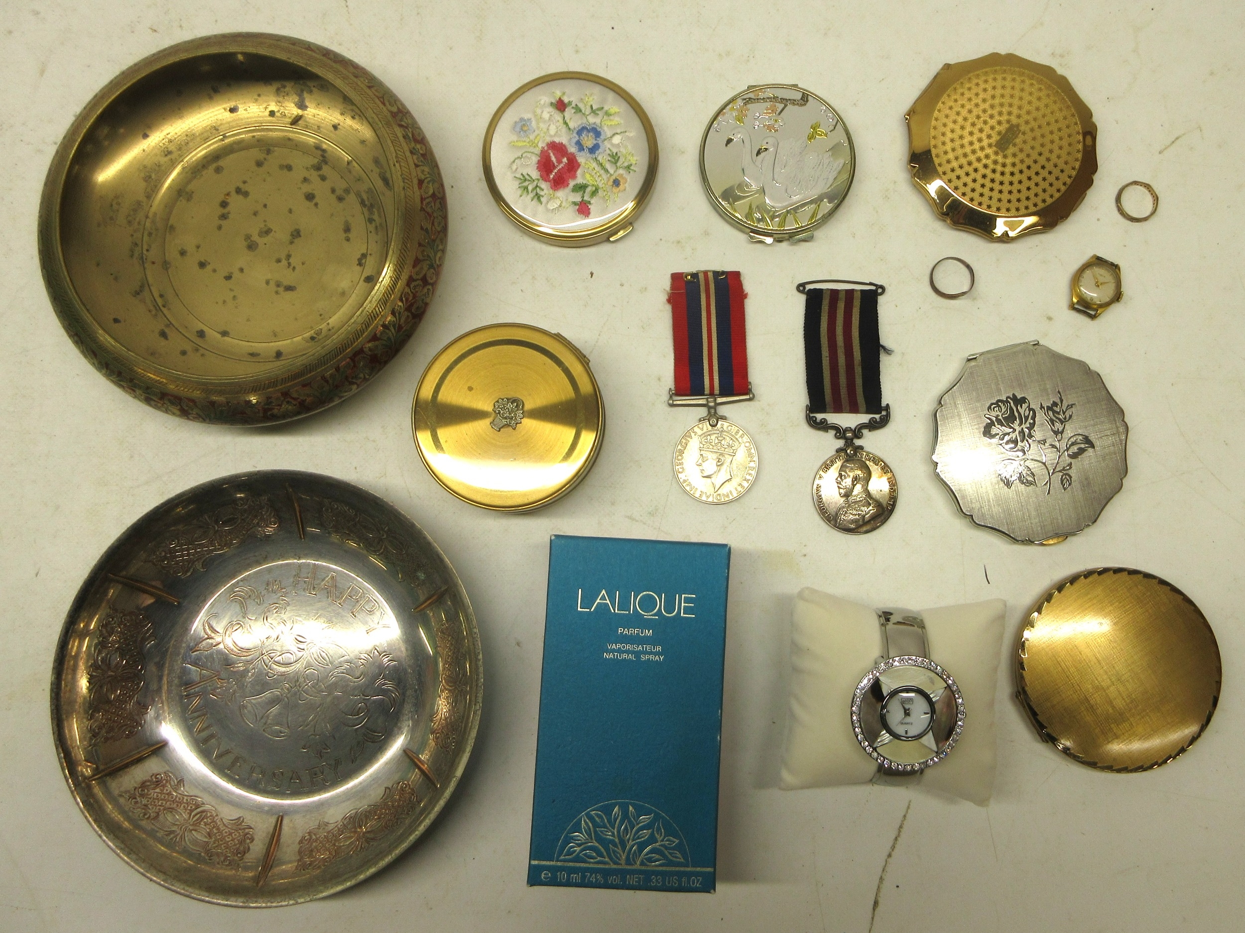 Oris watch dial, boxed Eton watch, lalique perfume spray, compacts, and two medals including a second world war medal, and a British Military Medal 58798 Cpl A. Blenkinship R.E