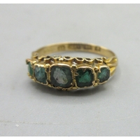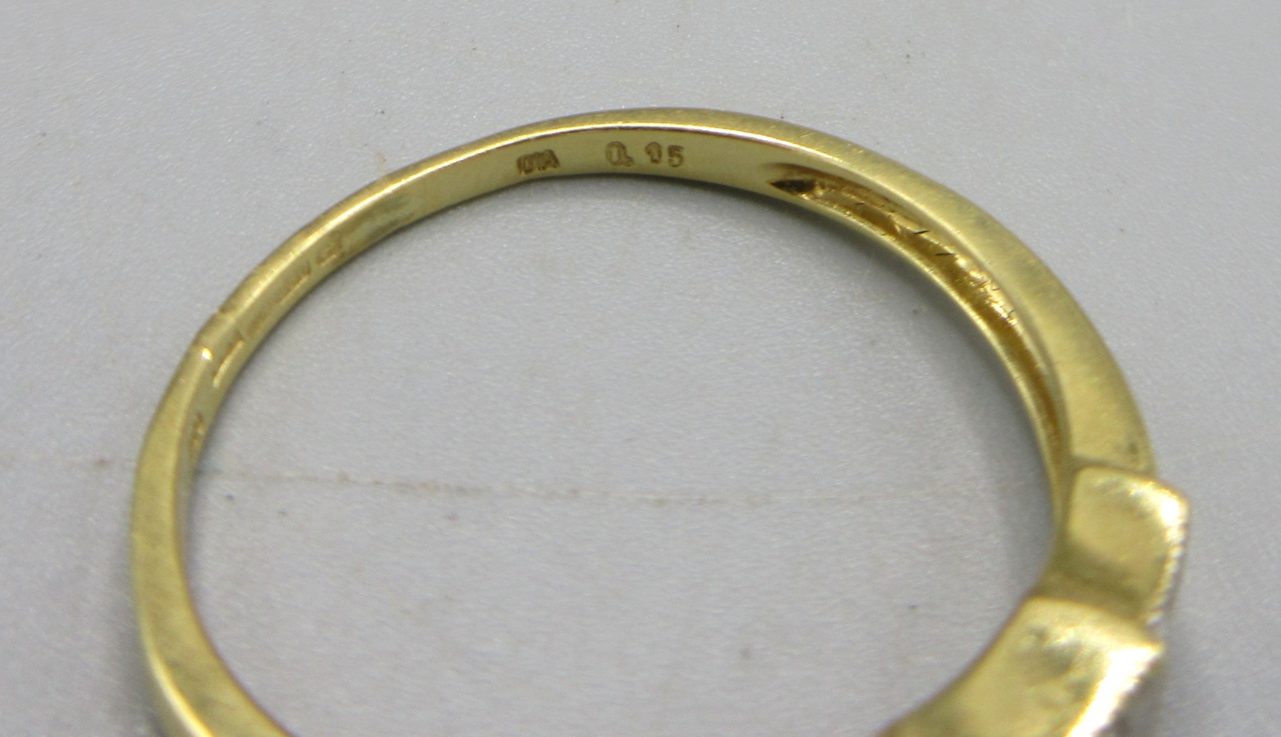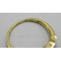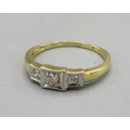 18ct yellow gold three stone diamond ring, the diamonds in platinum square mounts, stamped 750 PT, 2.40g