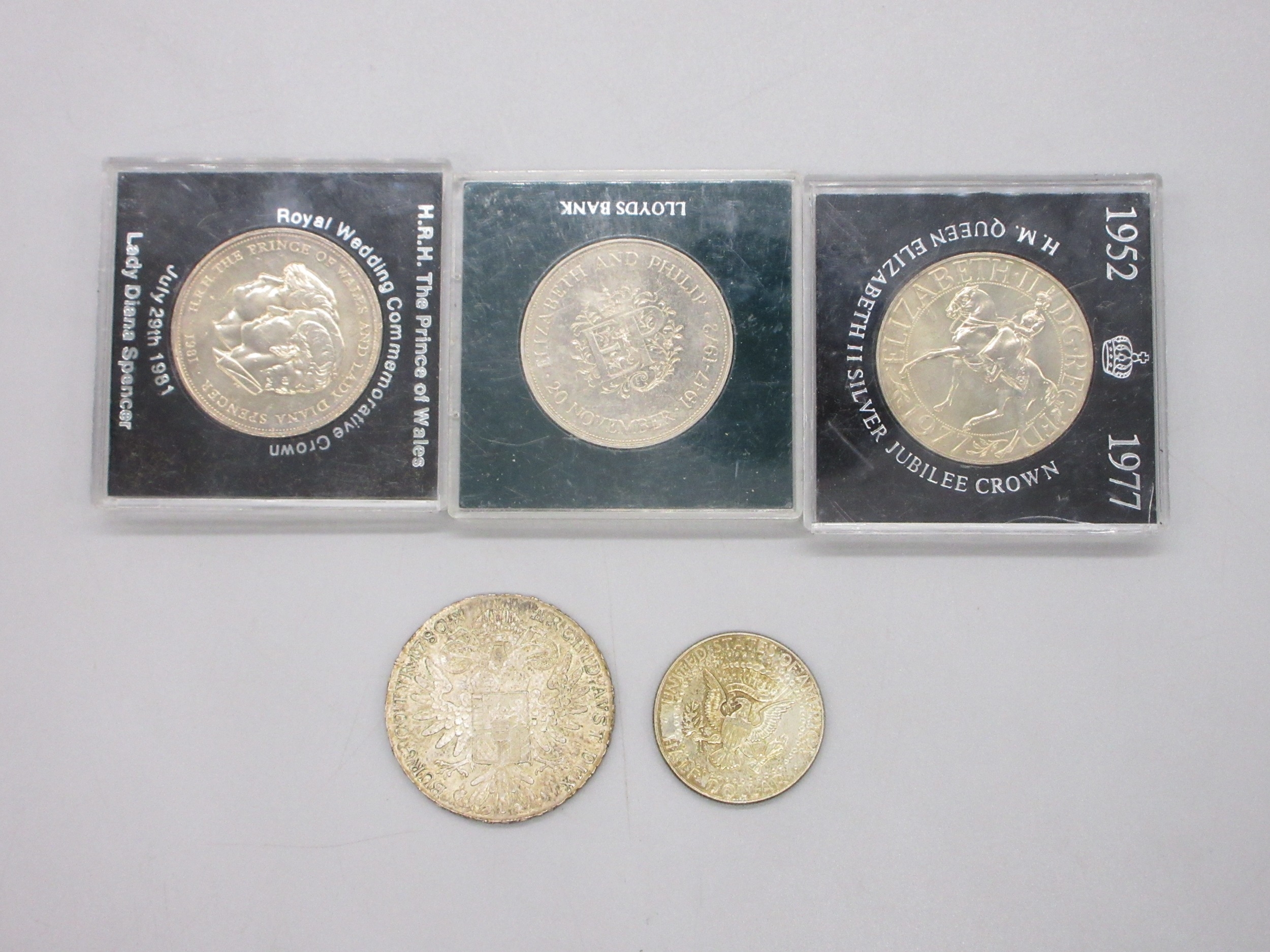 George V 1913 Half-Sovereign, 1780 Maria Theresa Thaler, 1968 USA Half-Dollar , Elizabeth and Philip 1947-72 Wedding Crown, Lady Diana Spencer Wedding Crown and a 1977 Jubilee Crown