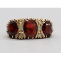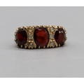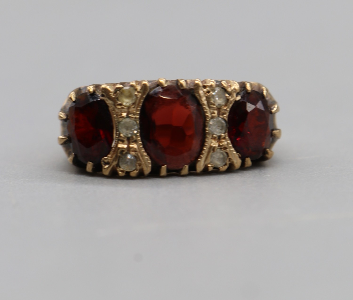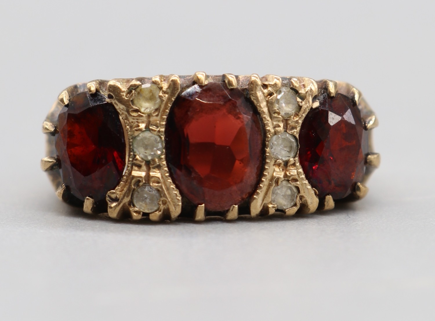 9ct yellow gold ring set with garnets and clear stones, stamped 9ct, size N, 4.8g
