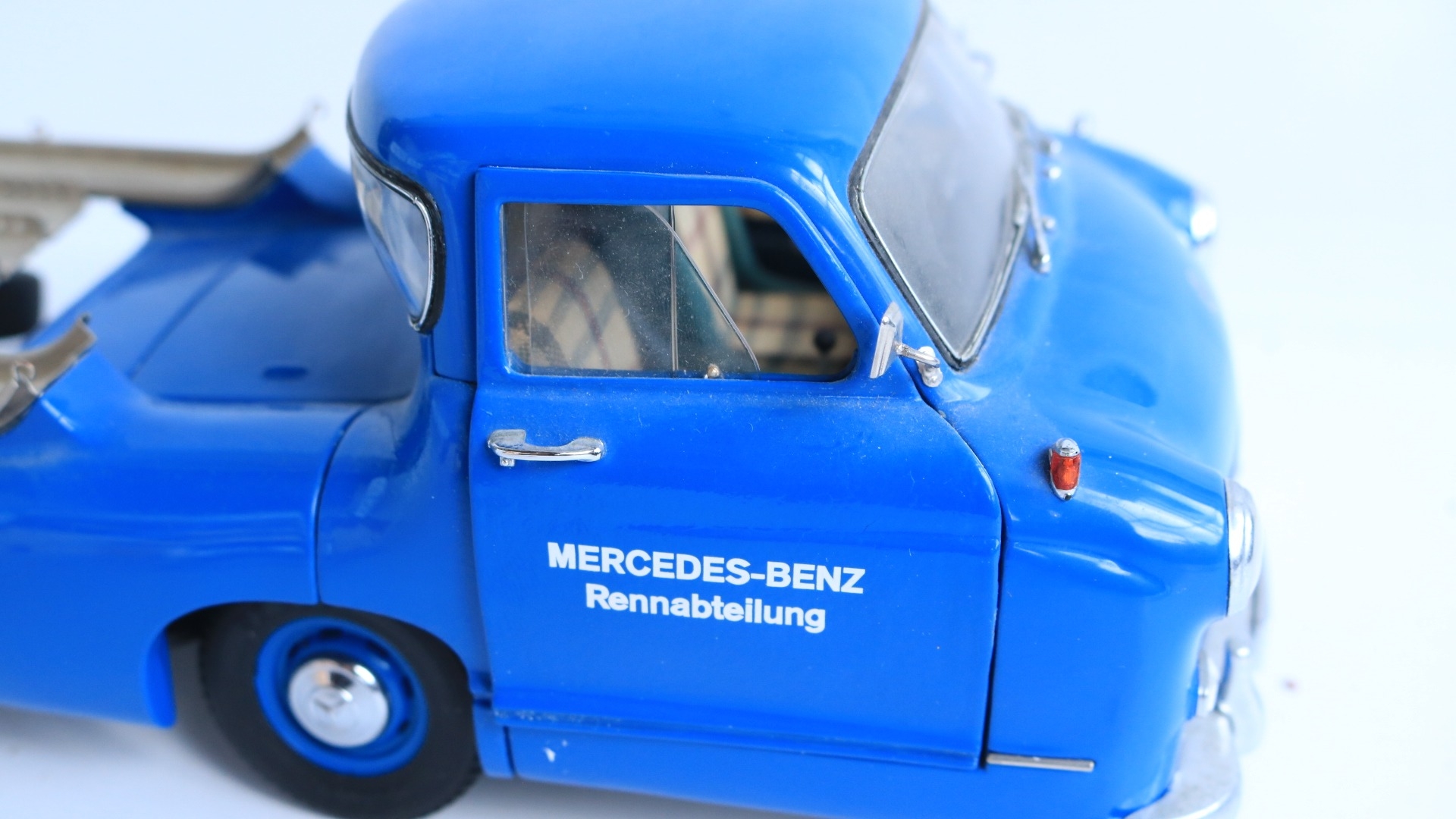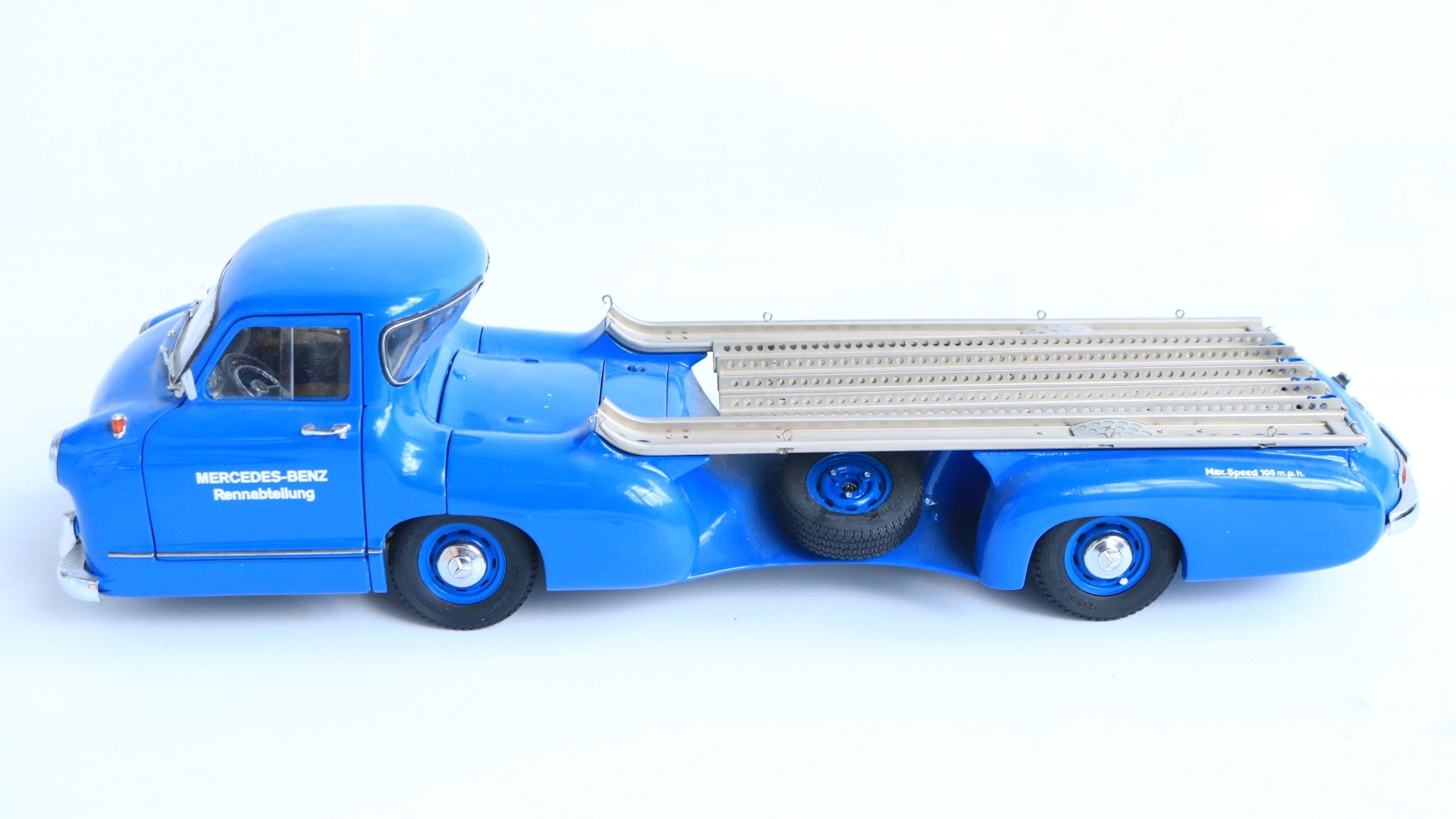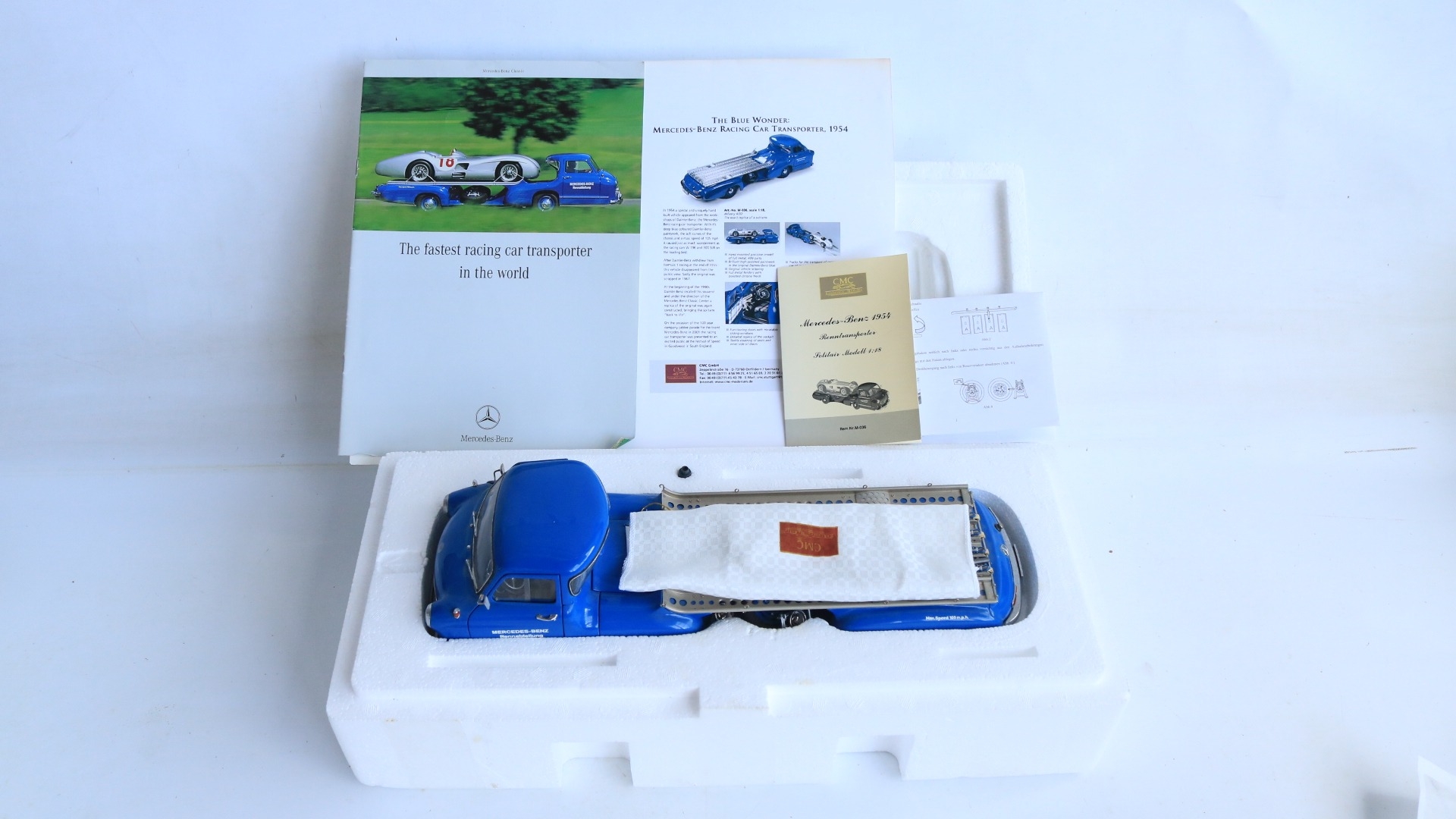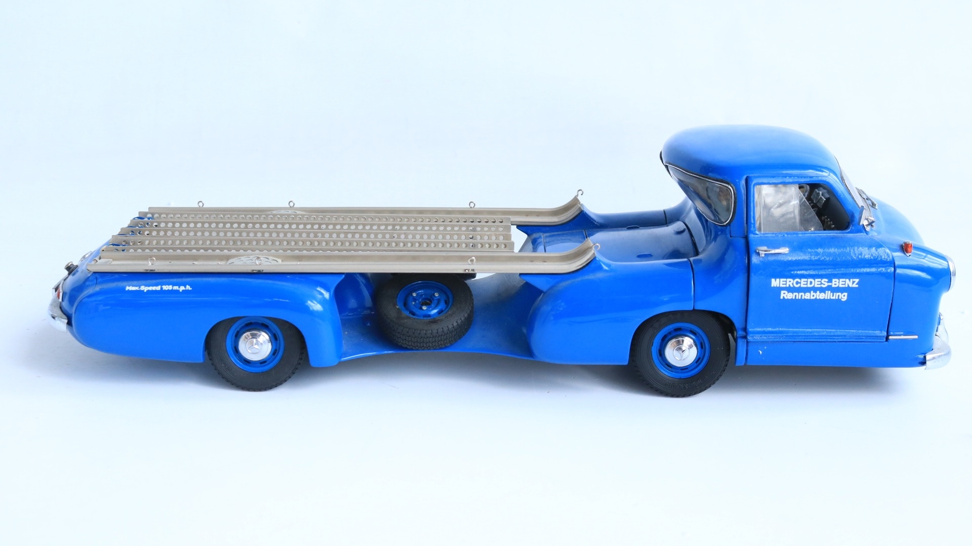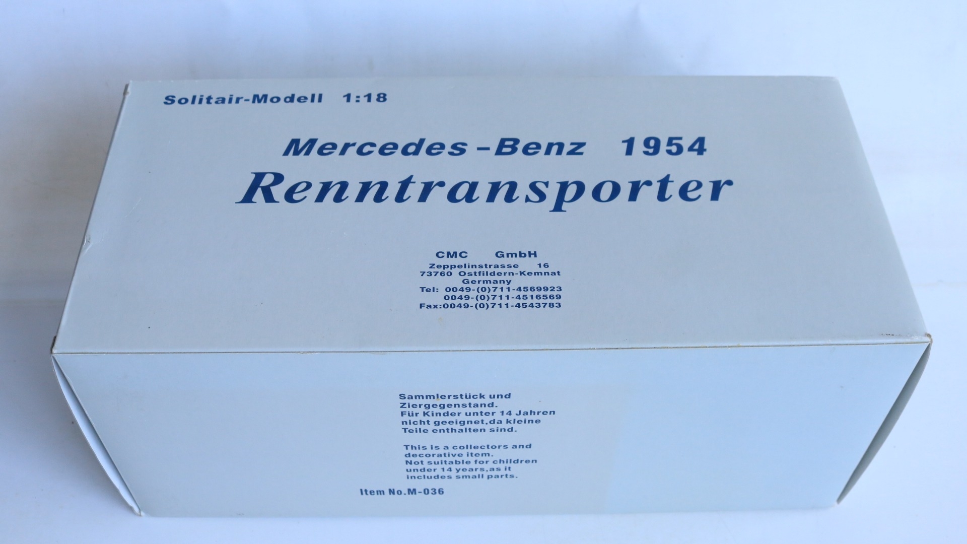 CMC 1/18 scale M-036 Mercedes-Benz 1954 Renntransporter highly detailed diecast metal model vehicle, please note some damage and repairs to right side cab door (appears to have been re-sprayed in a less then perfect finish and/or possibly suffering from zinc rot and the door will not shut), left side door is a little loose, otherwise the model is good but areas will require some attention, box very good