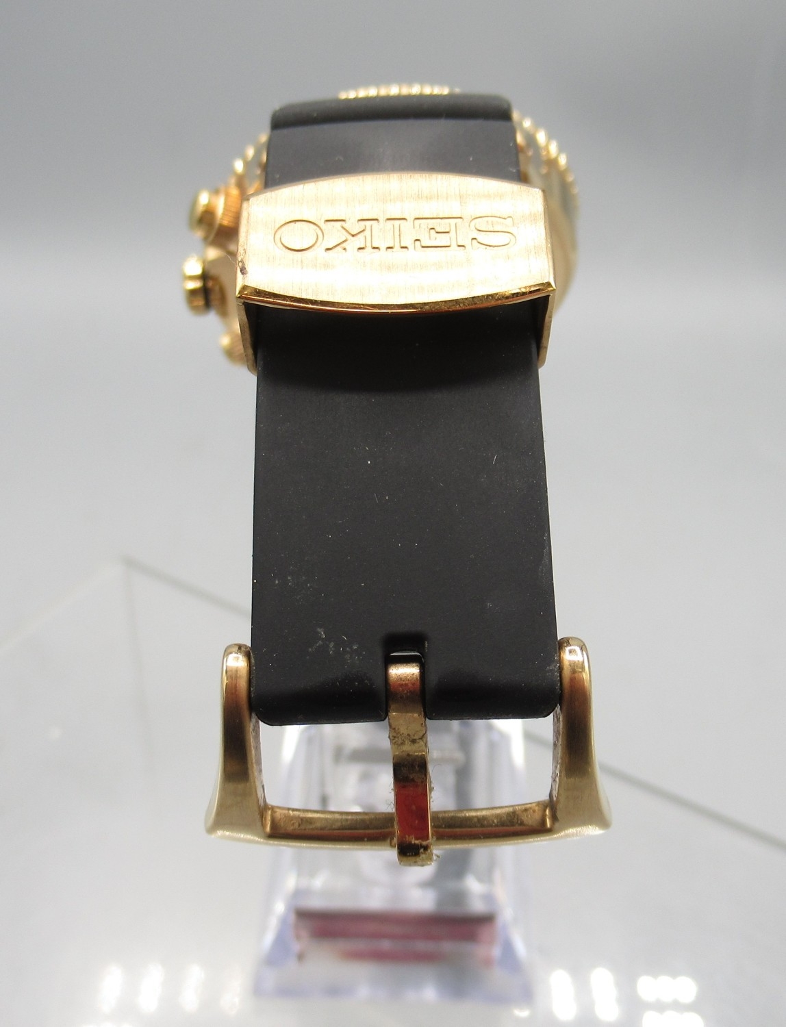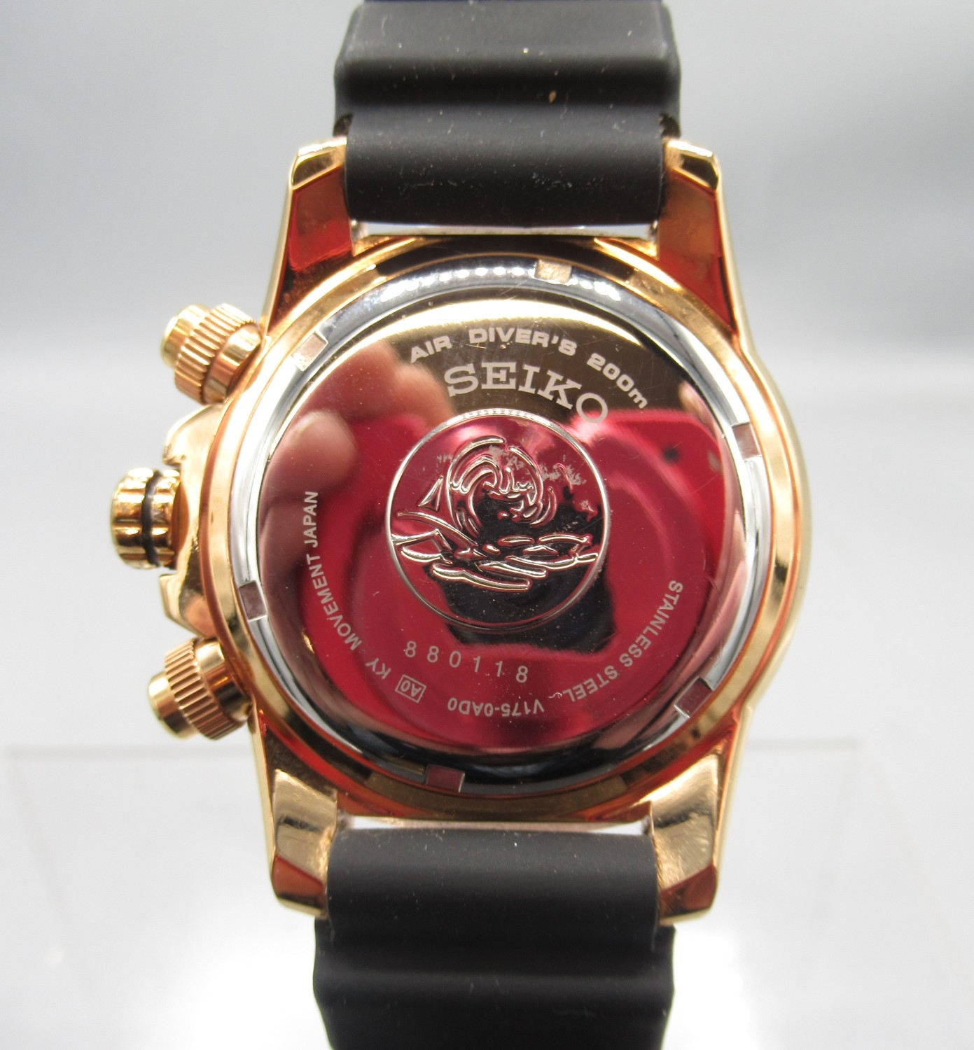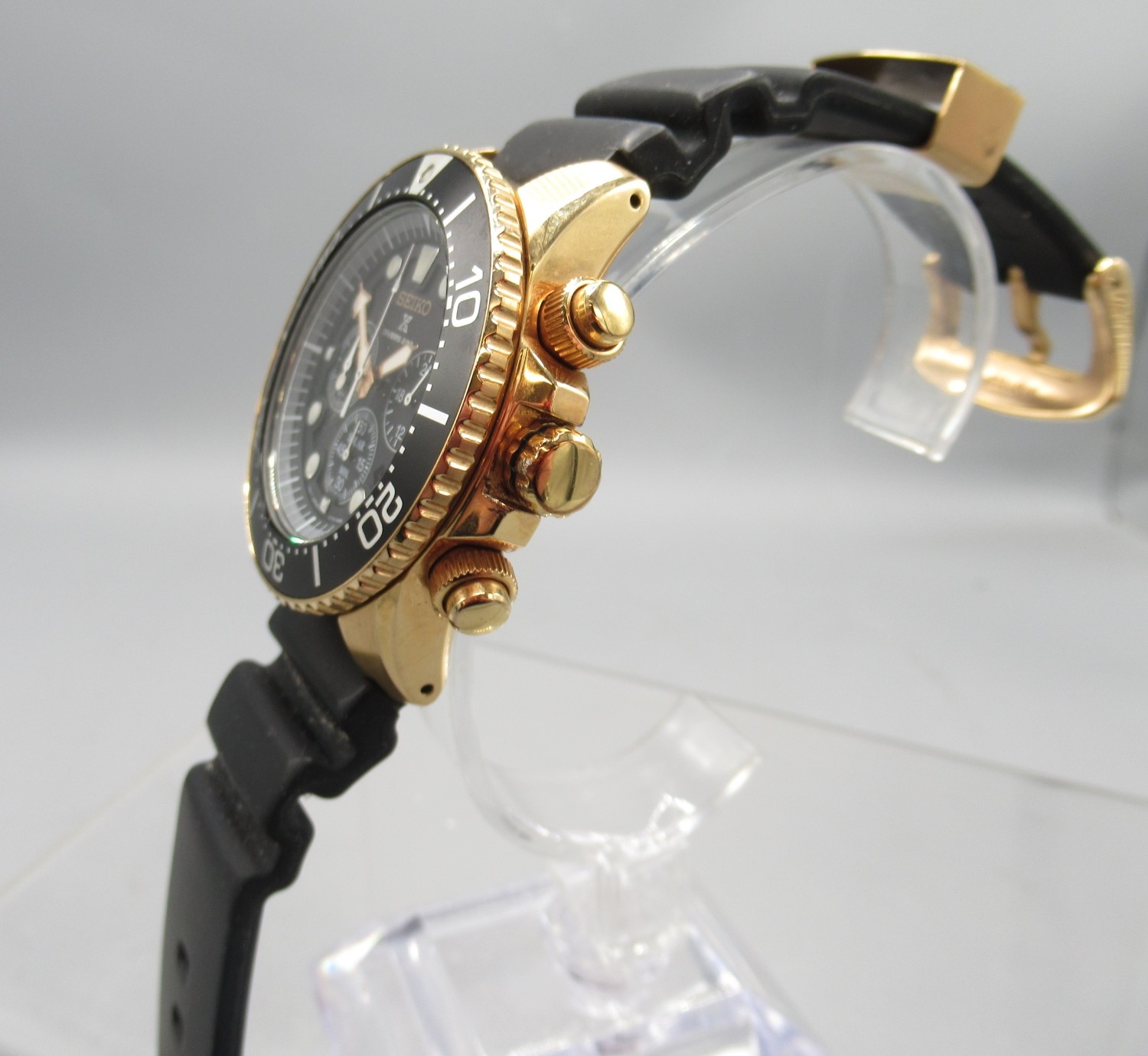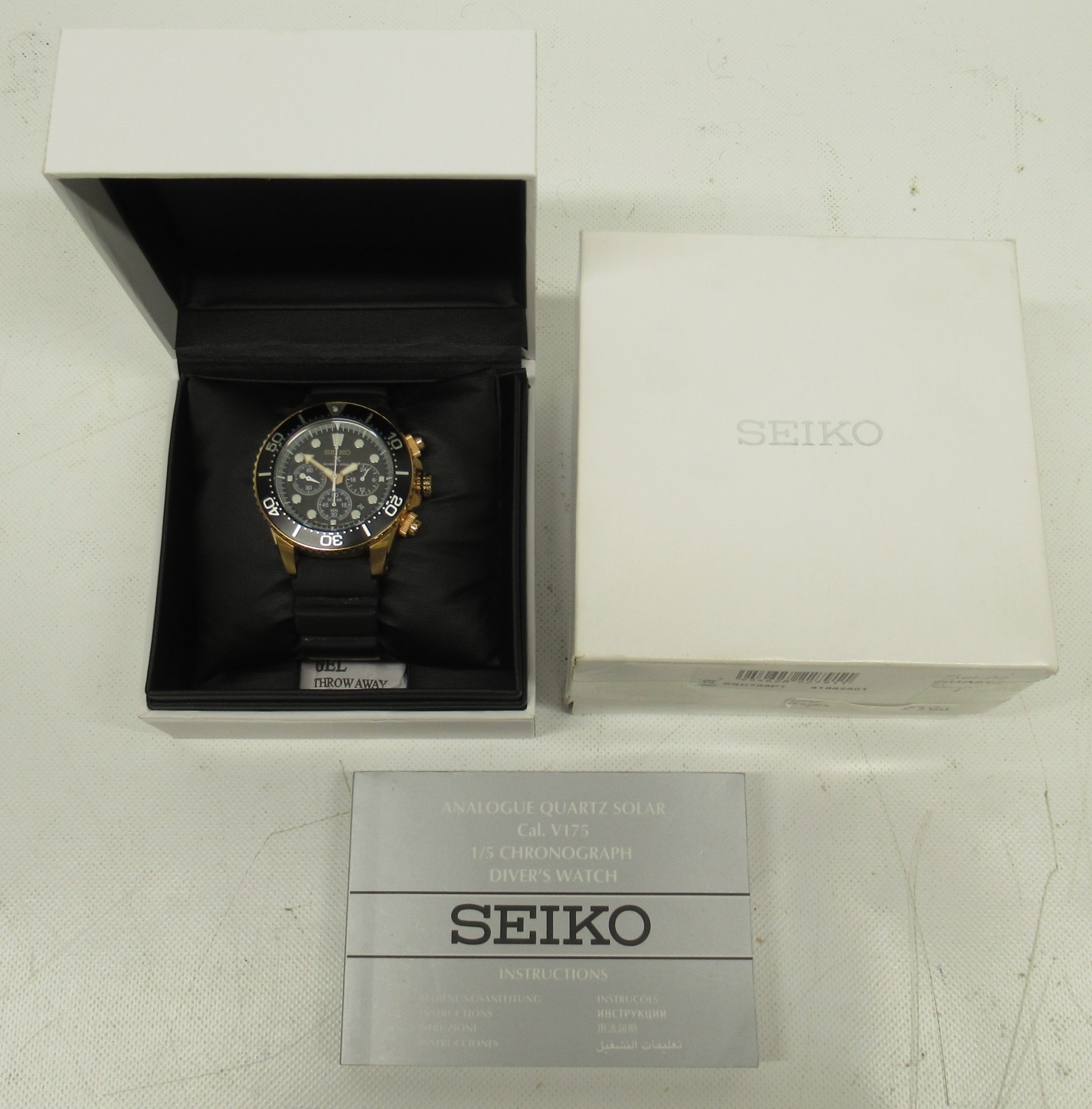Seiko Prospex 200m dive gold plated solar 1/5 chronograph wristwatch with date on original rubber strap signed clasp, signed black dial with dot indices, three subsidiary dials and centre chronograph seconds, signed screw on case back ref. V175-0AD0, no. 880118, D44mm with associated box and paperwork