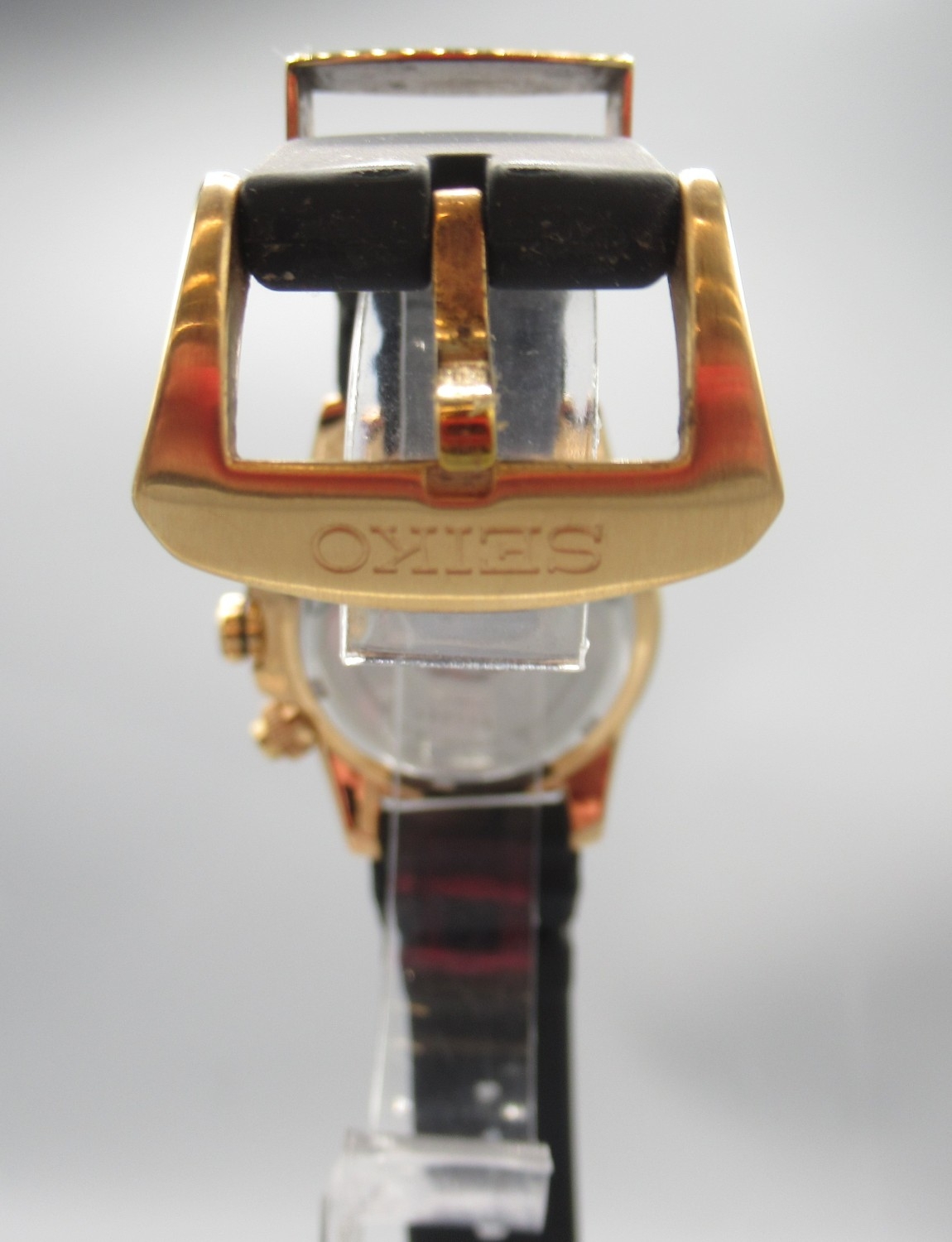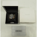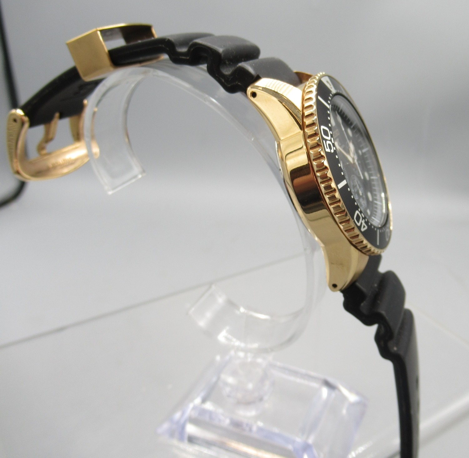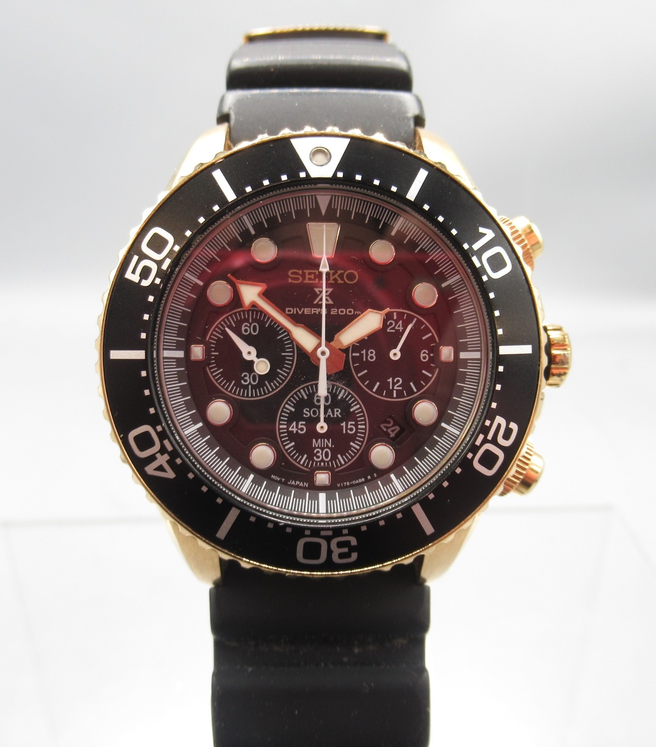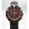 Seiko Prospex 200m dive gold plated solar 1/5 chronograph wristwatch with date on original rubber strap signed clasp, signed black dial with dot indices, three subsidiary dials and centre chronograph seconds, signed screw on case back ref. V175-0AD0, no. 880118, D44mm with associated box and paperwork